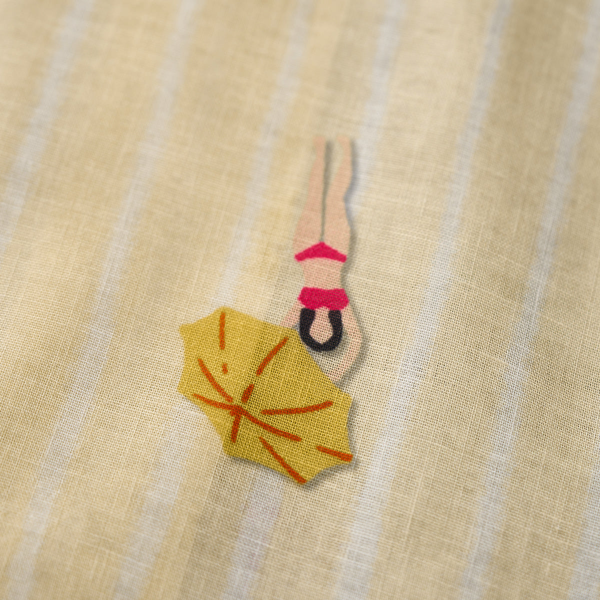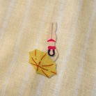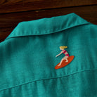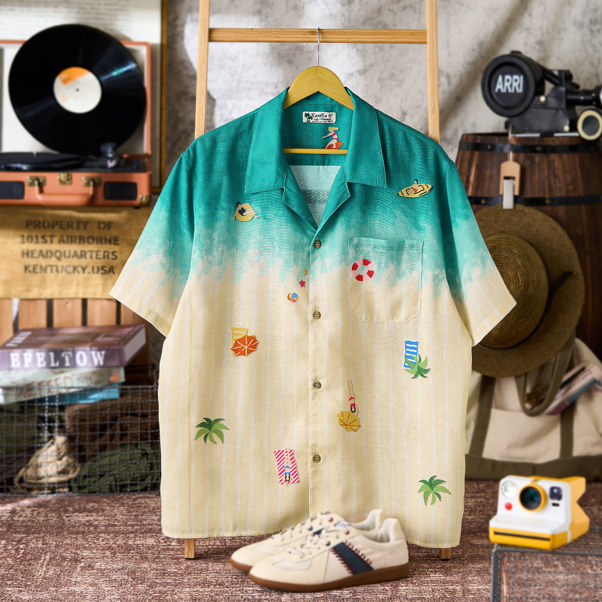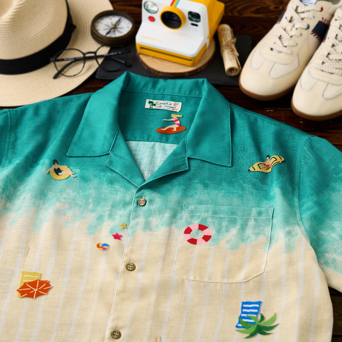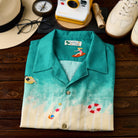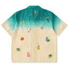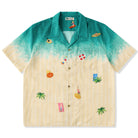 그러데이션 프린트로 서퍼, 파라솔, 튜브, 해변에 누워 있는 사람들 등 작은 모티프들이 랜덤하게 배치되어 활기찬 비치 풍경이 느껴지는 알로하 셔츠입니다.
