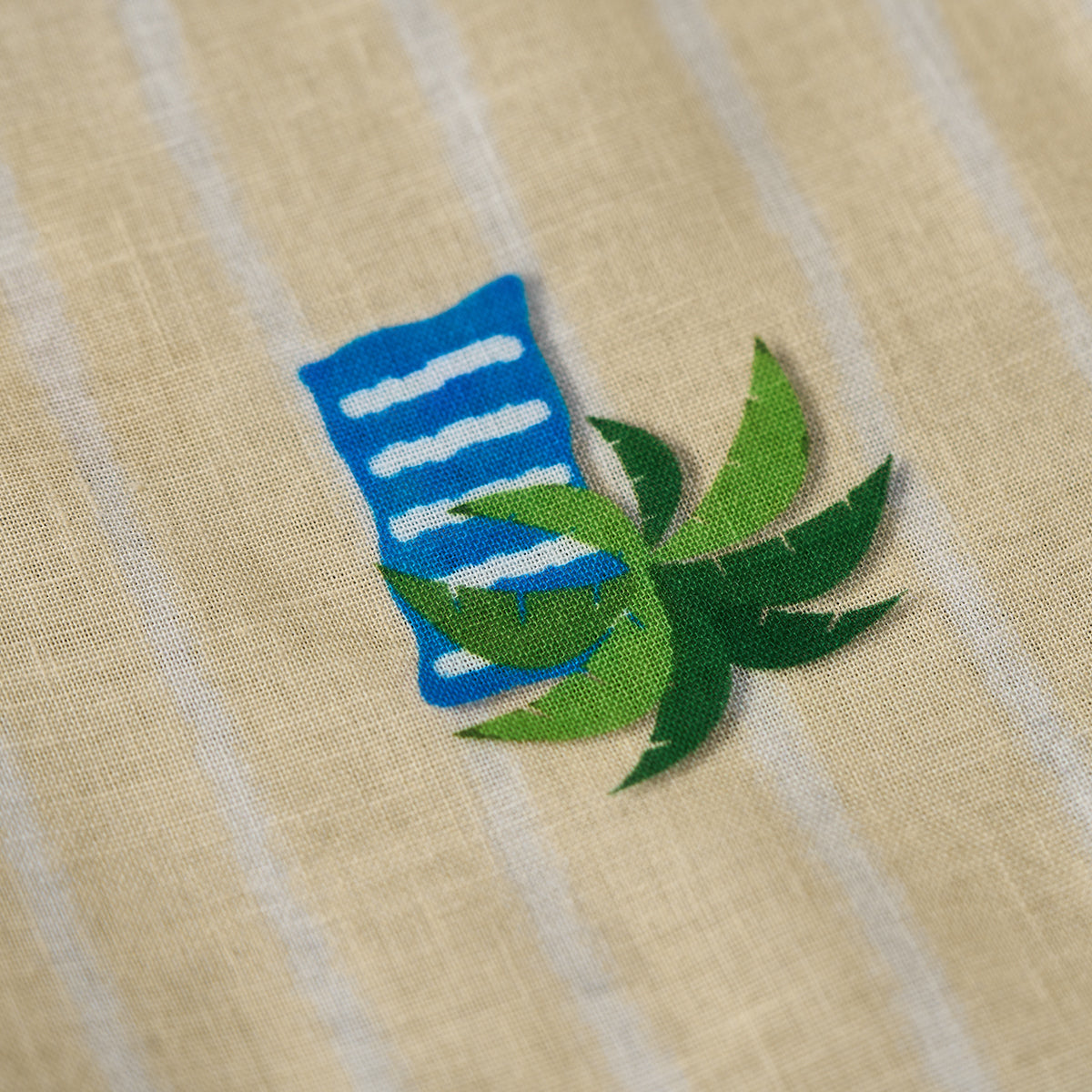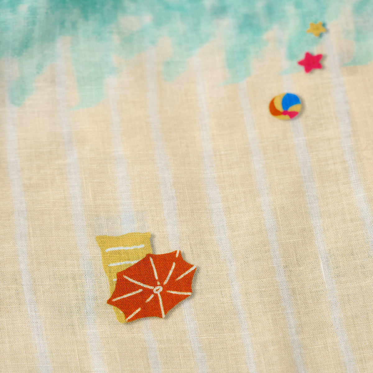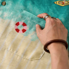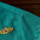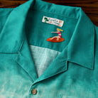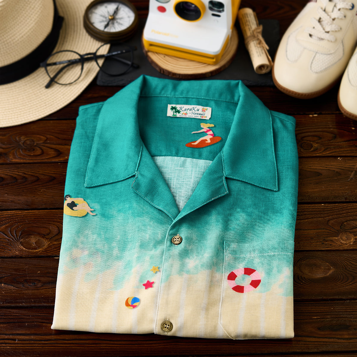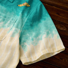 에메랄드 그린에서 베이지로 이어지는 그러데이션 프린트와 비치 모티프로 여유로운 해변 무드를 담은 디자인입니다. 오픈 카라와 우드 버튼 디테일로 편안한 캐주얼 스타일을 완성합니다.