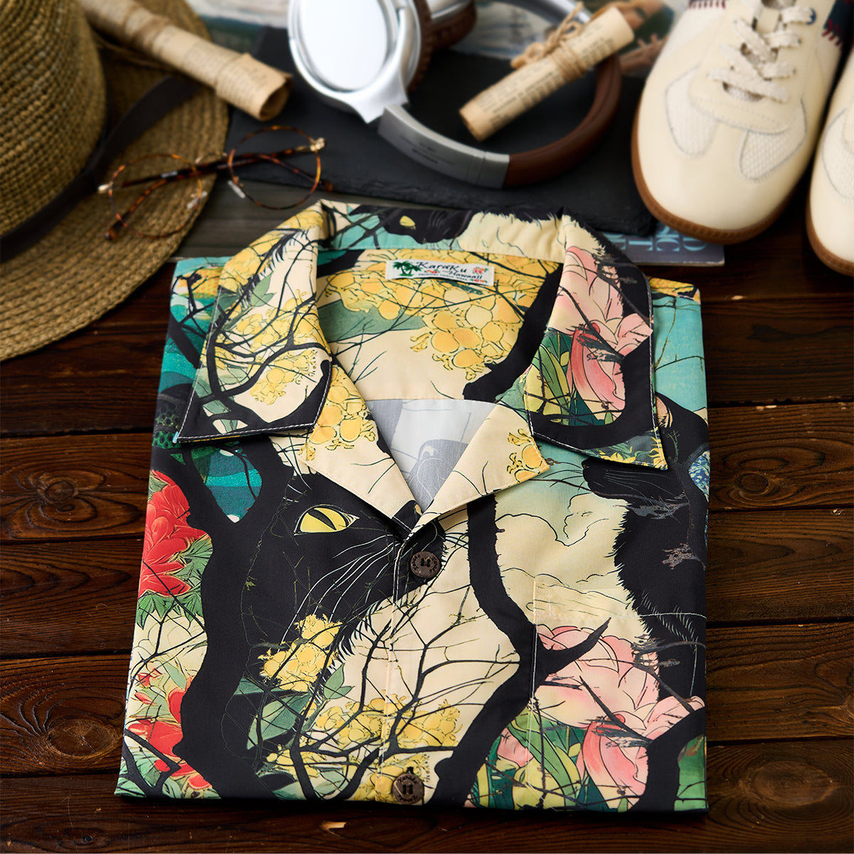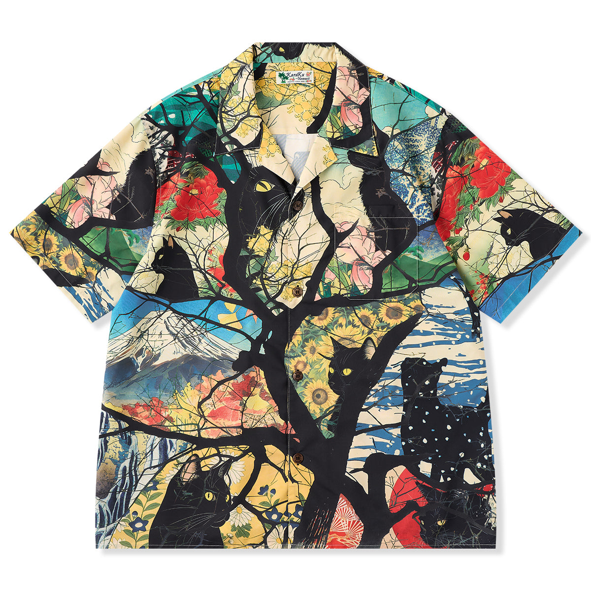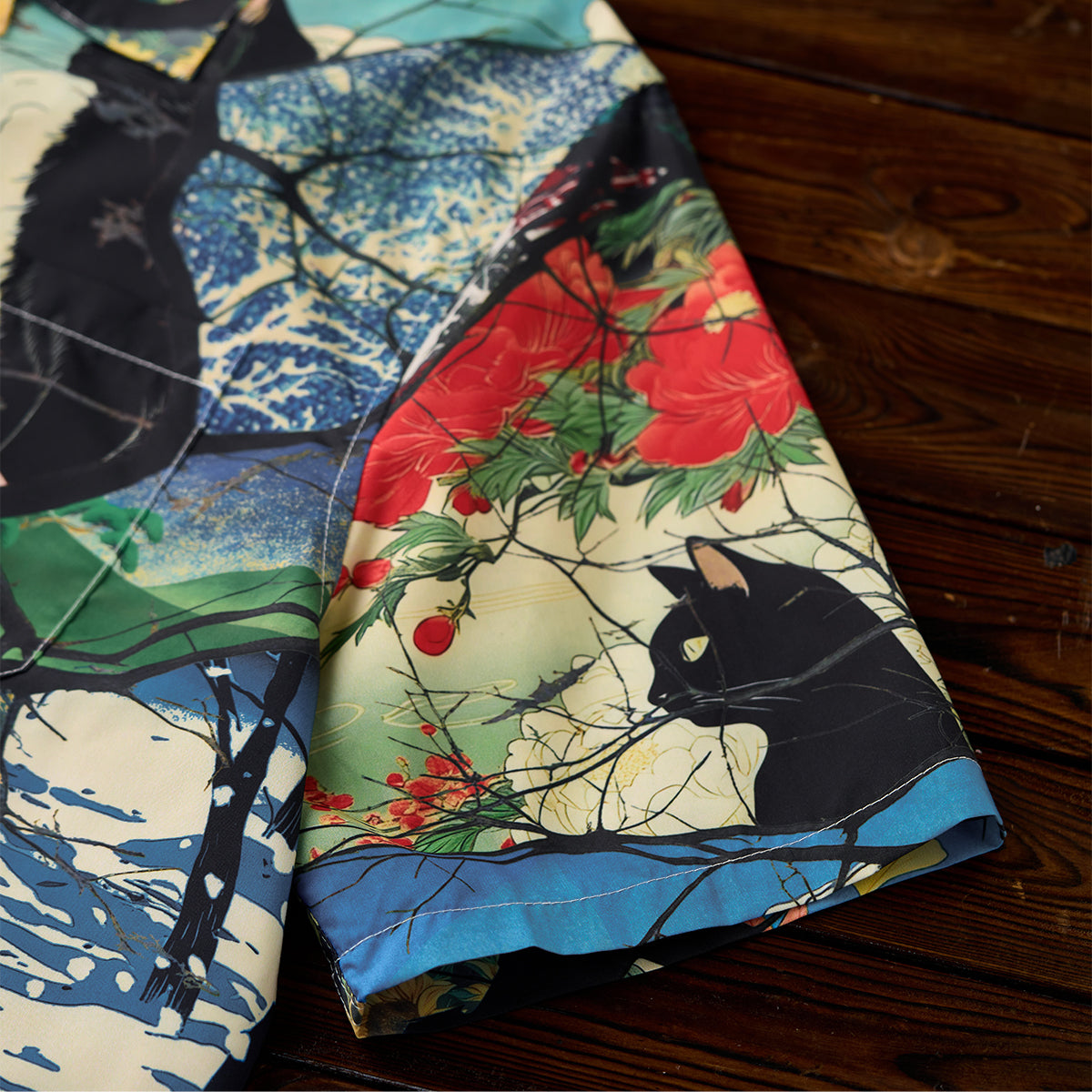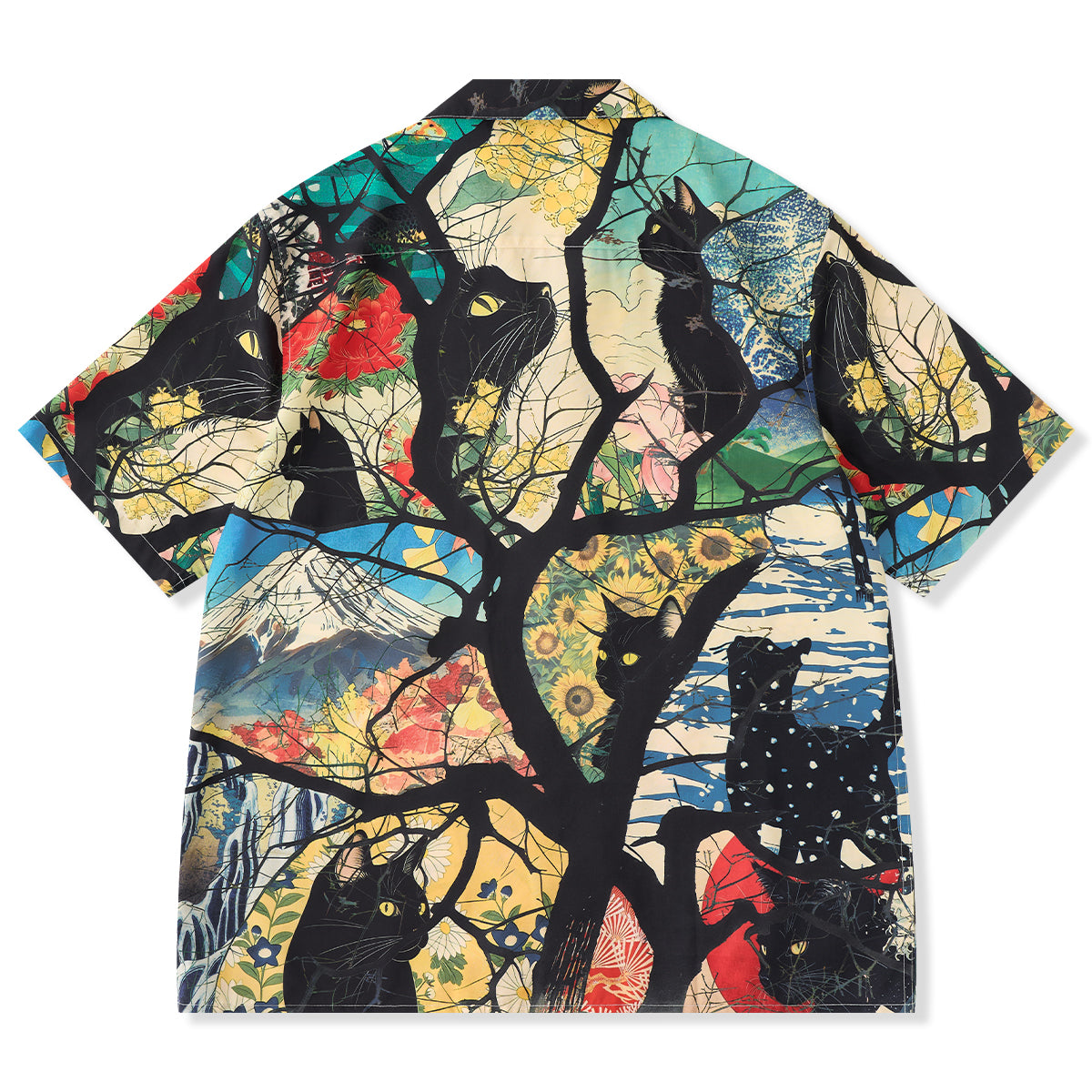 사계절을 여행하는 흑묘를 우키요에 스타일 올오버 프린트로 표현한 알로하 셔츠입니다. 오픈 카라와 우드 버튼으로 편안한 분위기를 살립니다.