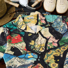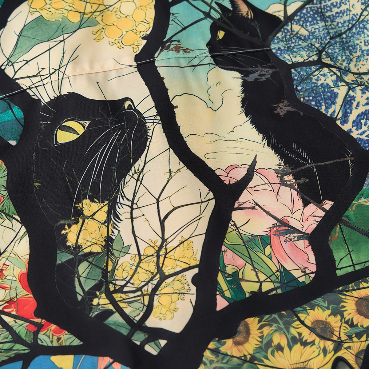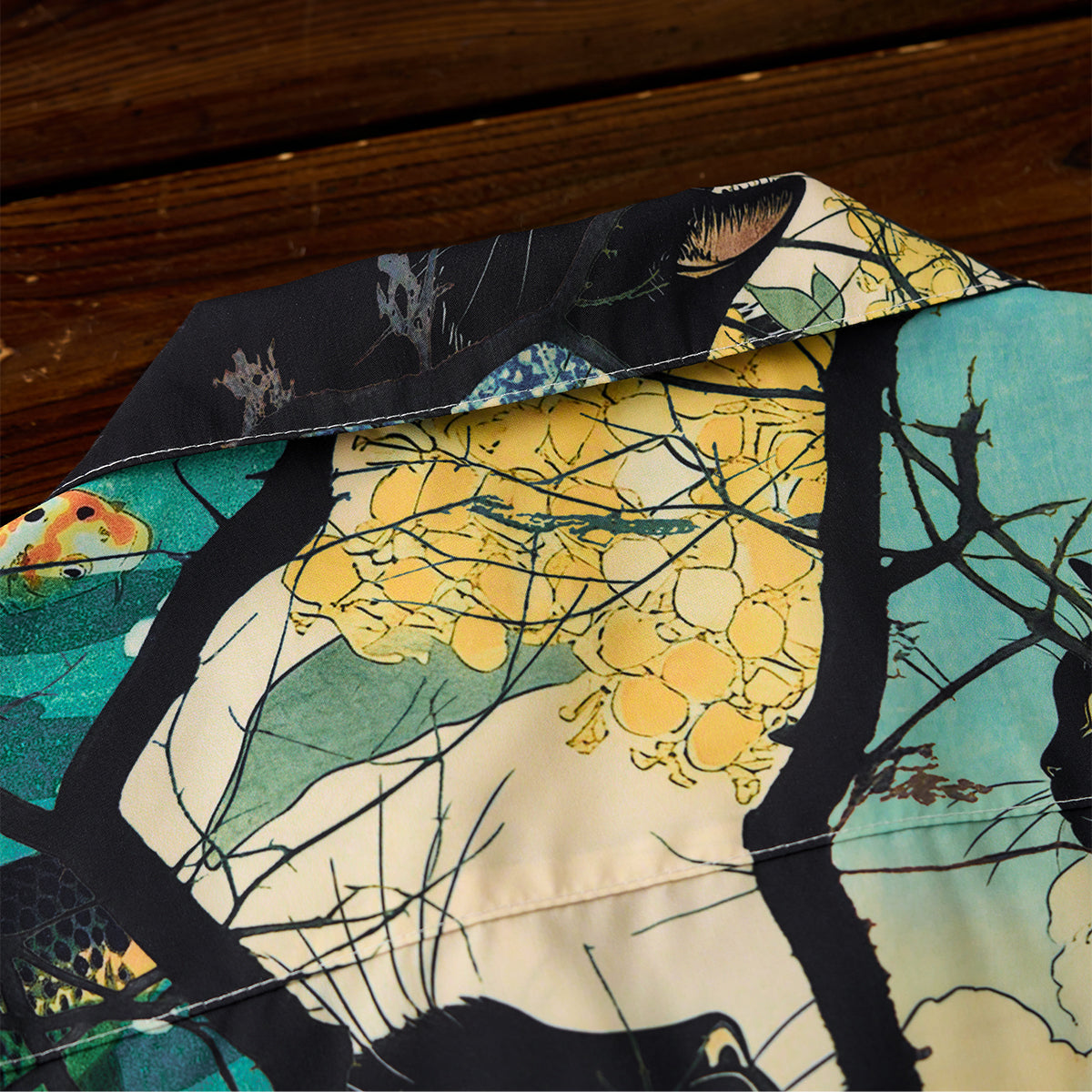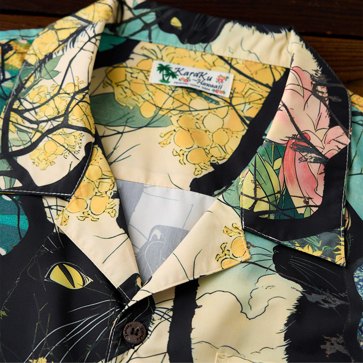 사계절을 여행하는 흑묘를 우키요에 스타일 올오버 프린트로 표현한 알로하 셔츠입니다. 오픈 카라와 우드 버튼으로 편안한 분위기를 살립니다.
