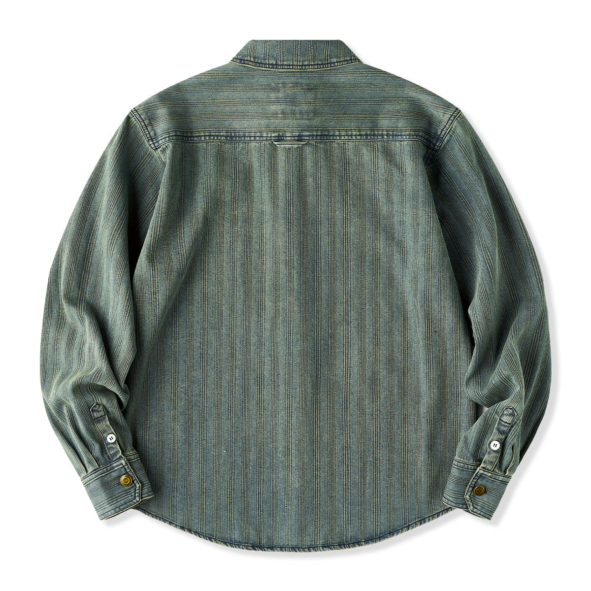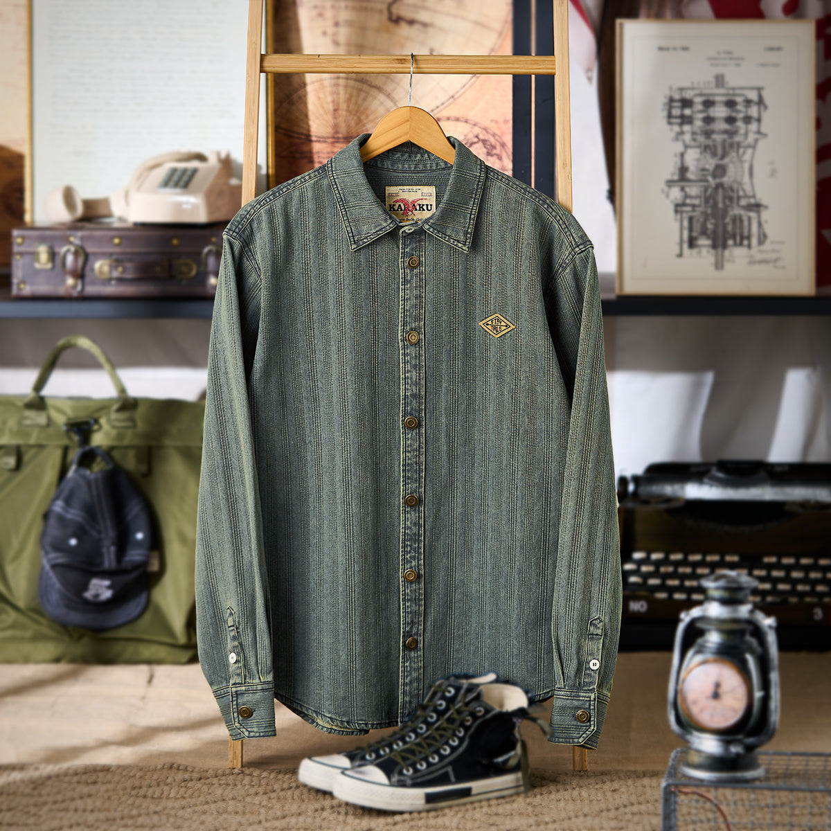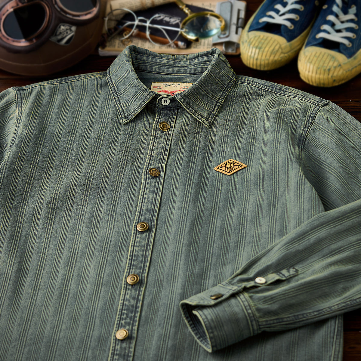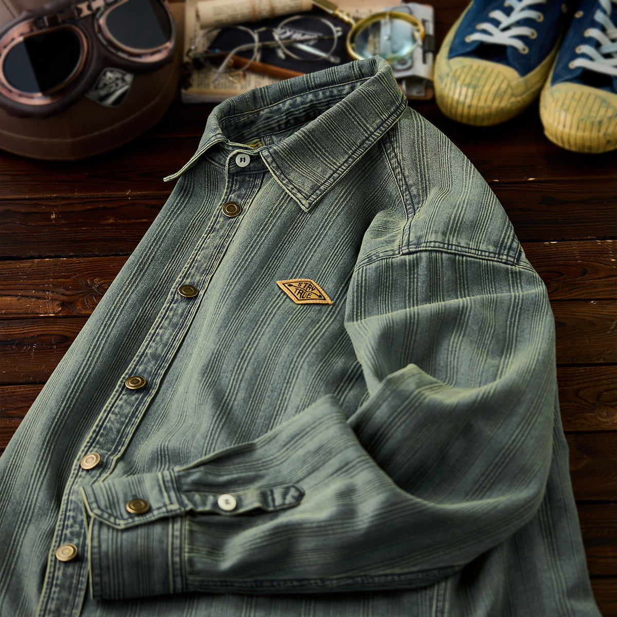 와펜과 브랜드 태그 포인트, 리랙스 핏과 조절 가능한 소매, 빈티지 데님 스트라이프 패턴이 돋보이는 셔츠.