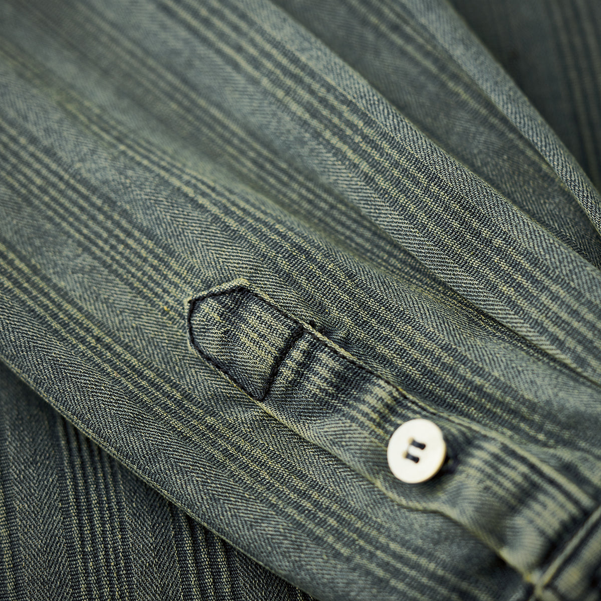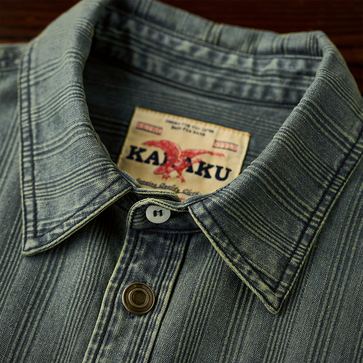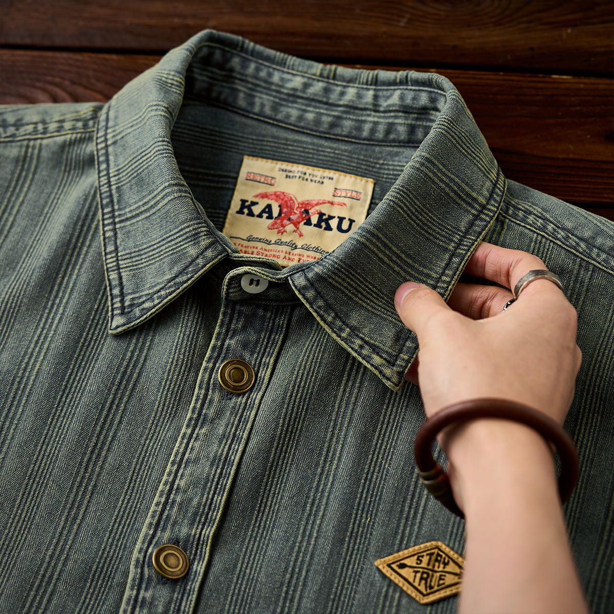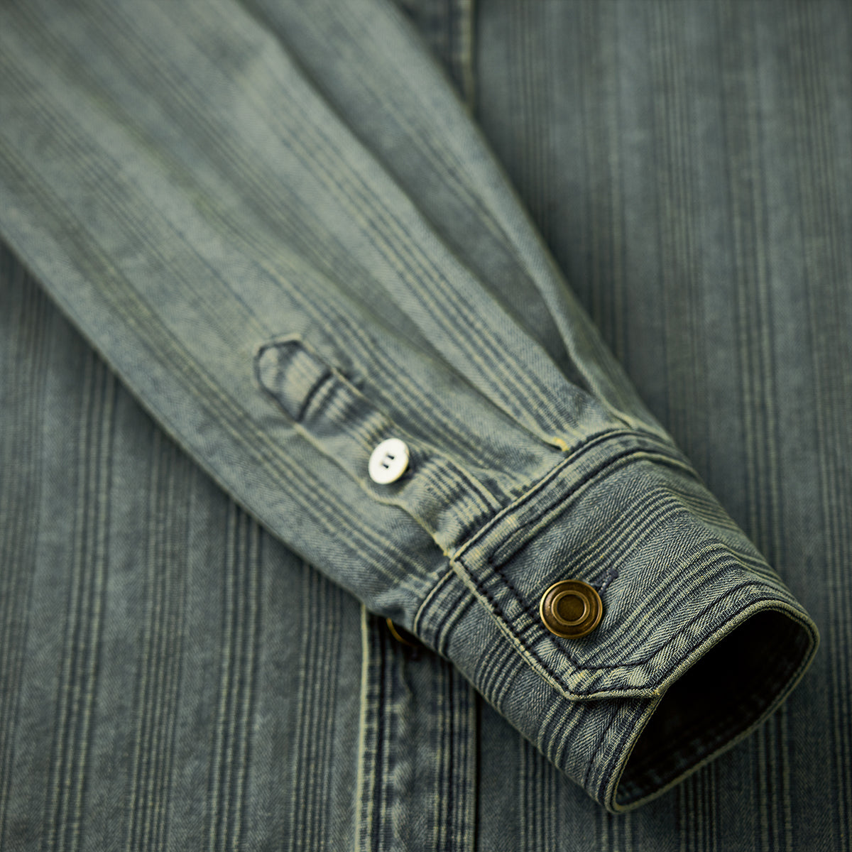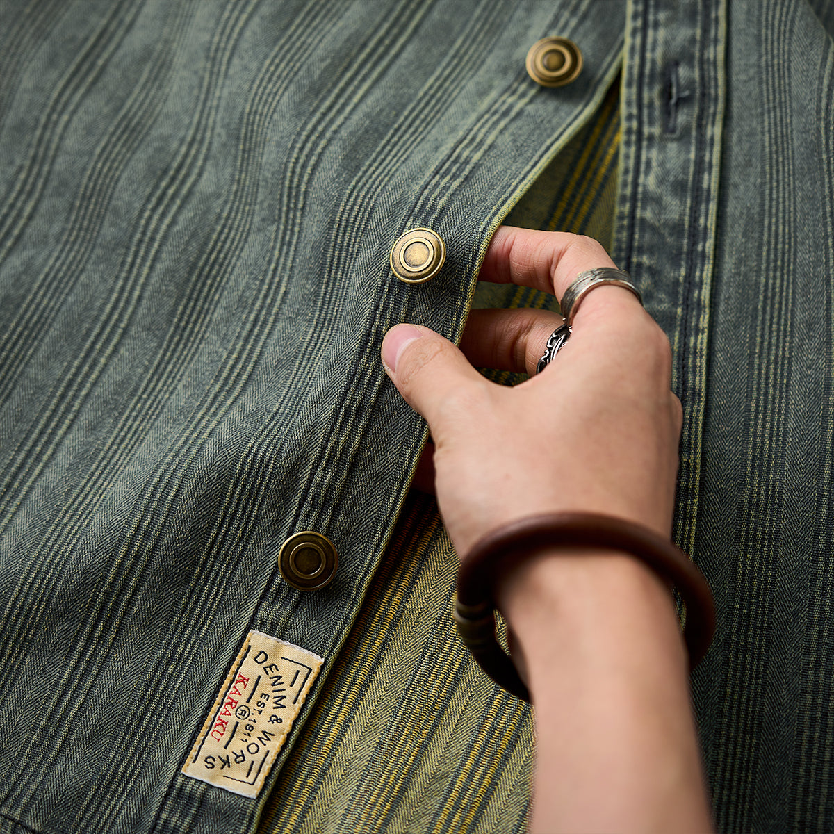 와펜과 브랜드 태그 포인트, 리랙스 핏과 조절 가능한 소매, 빈티지 데님 스트라이프 패턴이 돋보이는 셔츠.
