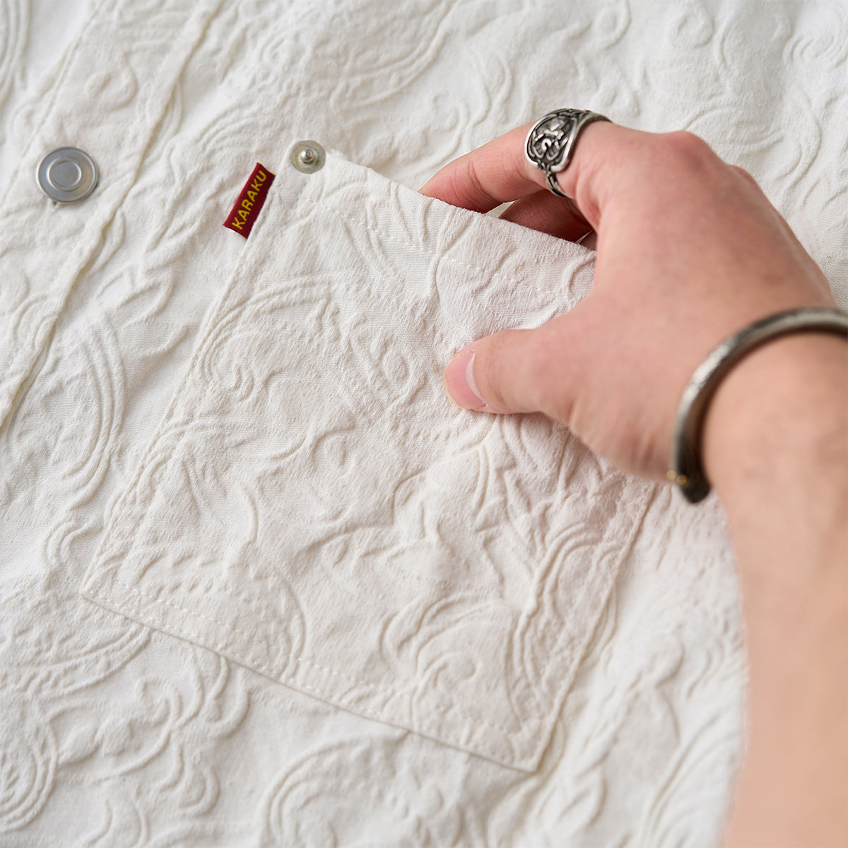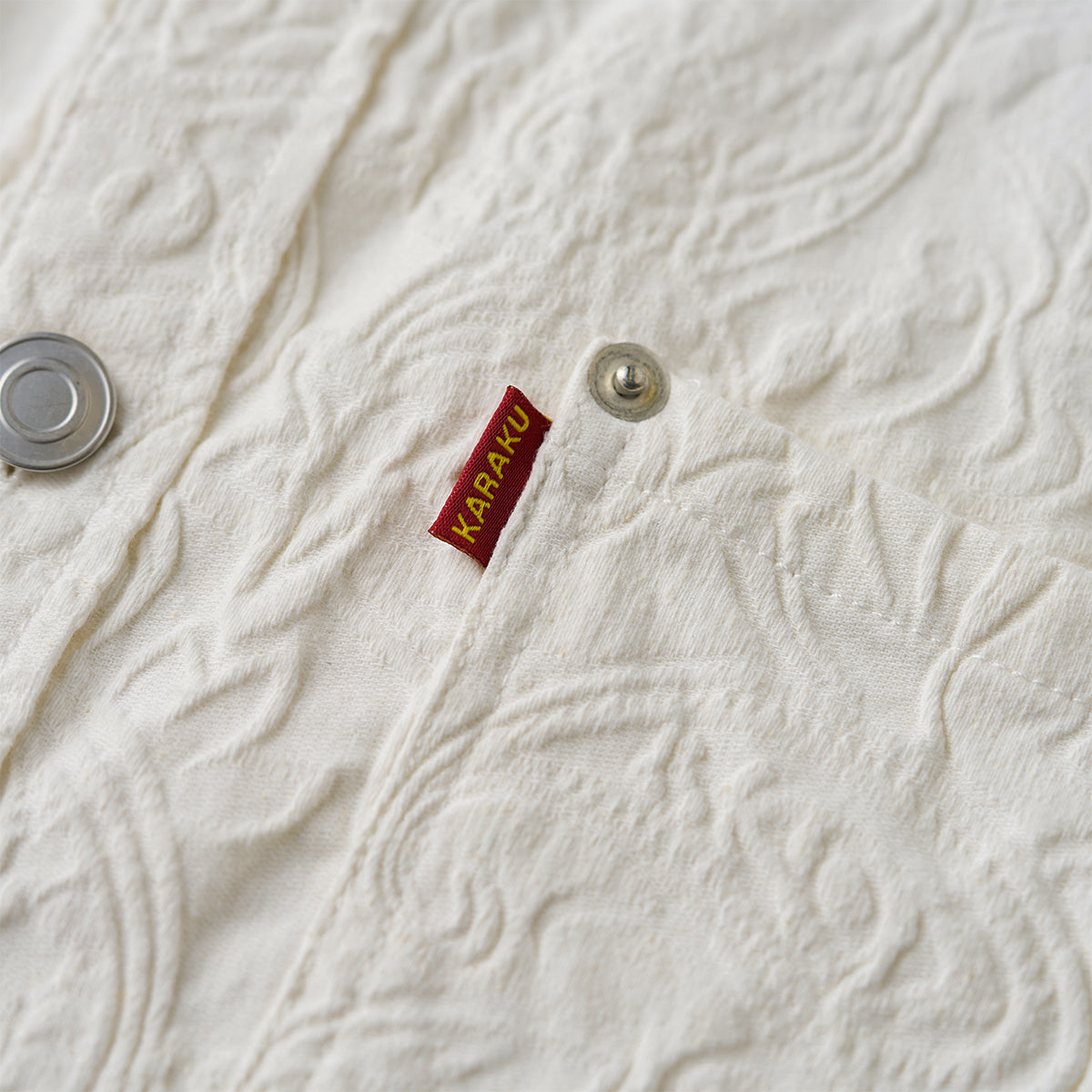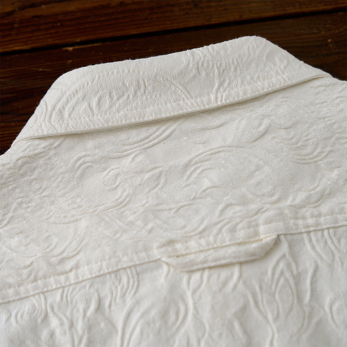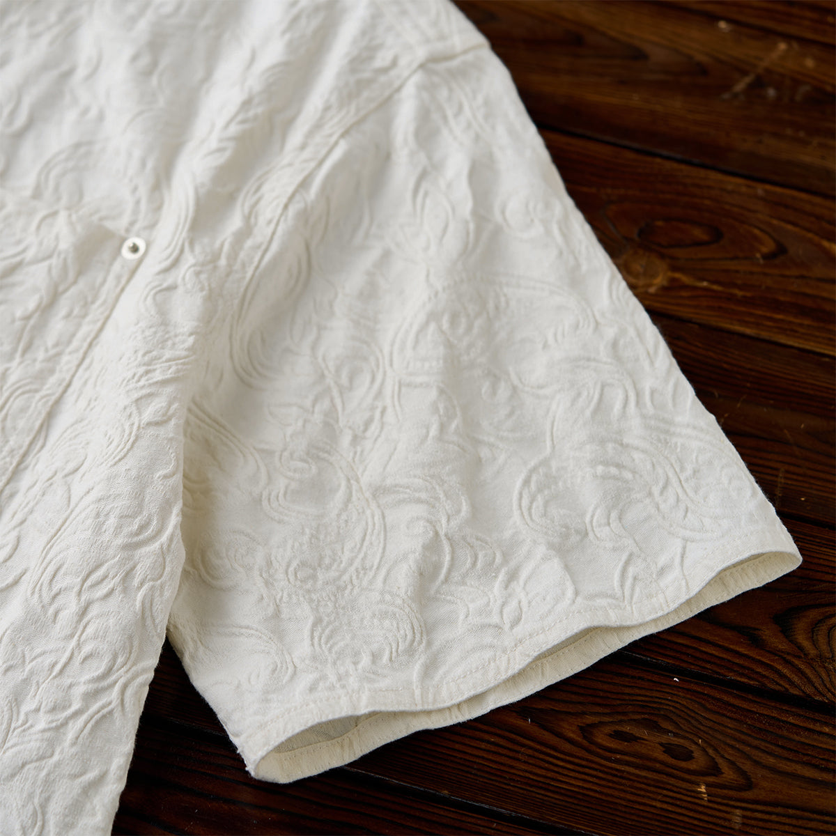 프린트가 아닌 엠보 가공으로 표현된 페이즐리 패턴으로, 화이트 컬러임에도 빛에 따라 은은하게 패턴이 드러나 세련된 분위기를 연출하는 셔츠입니다.