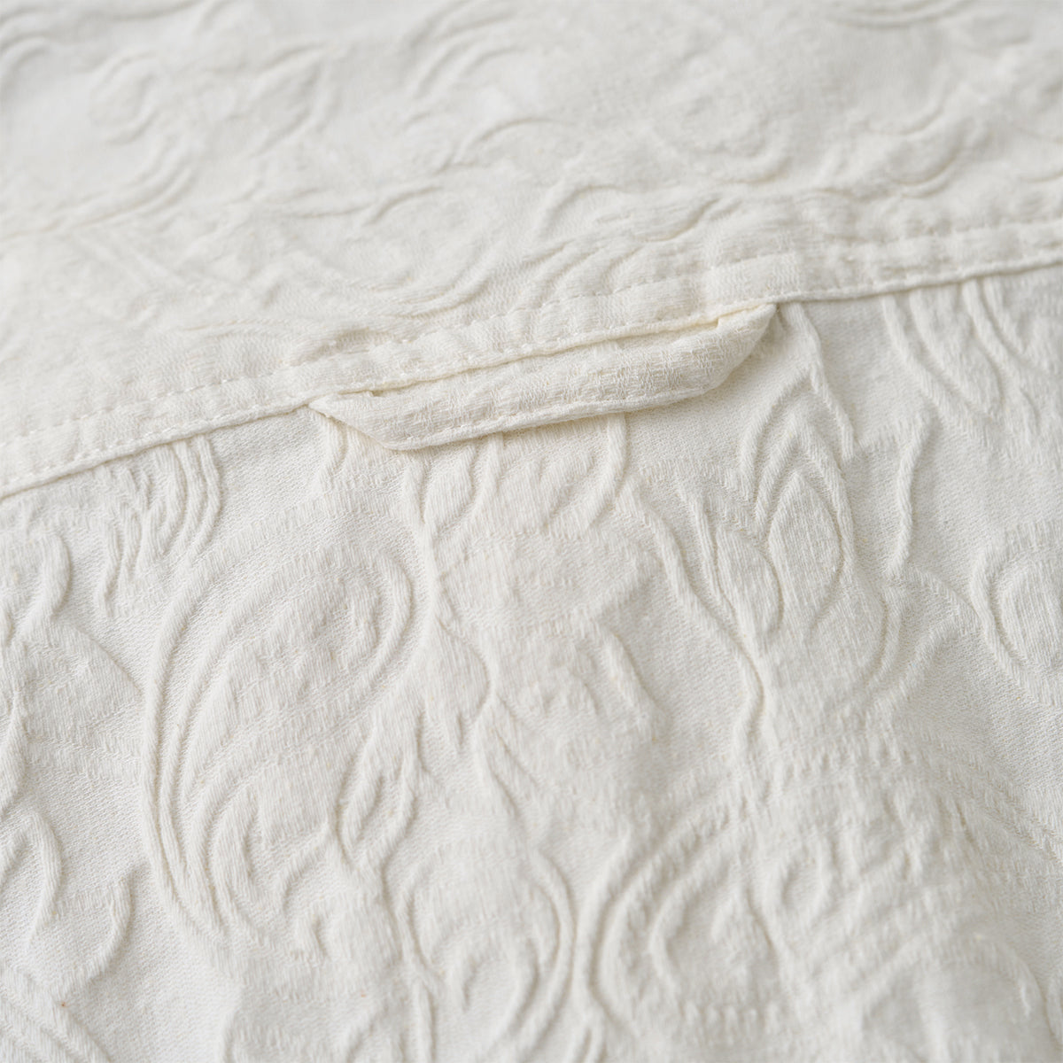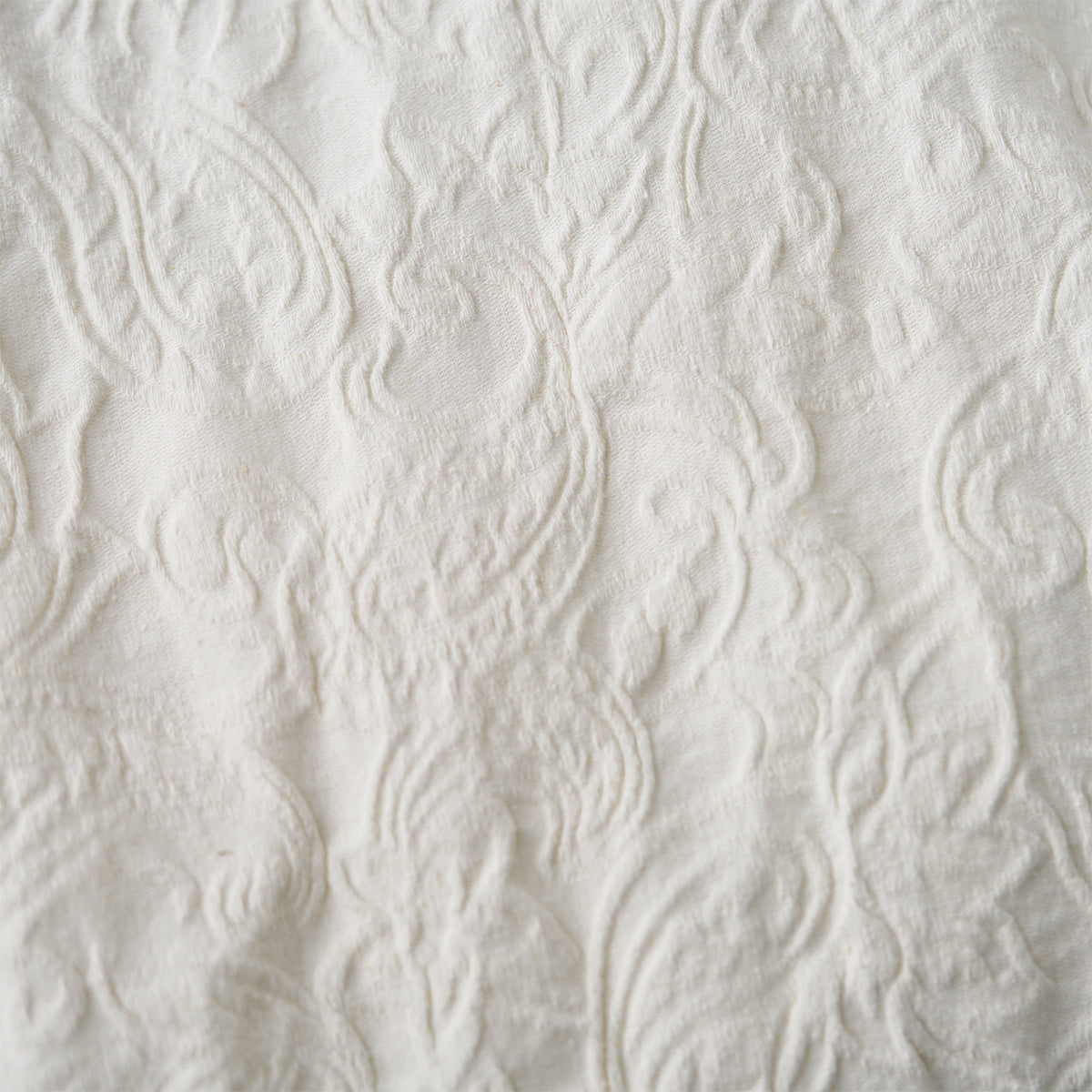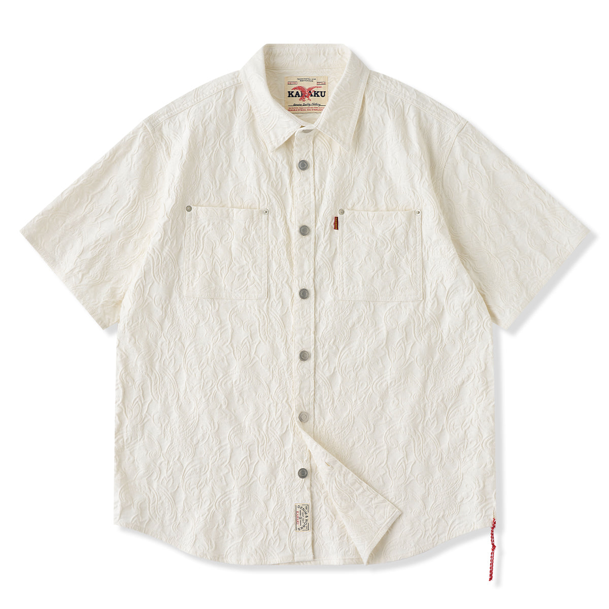 프린트가 아닌 엠보 가공으로 표현된 페이즐리 패턴으로, 화이트 컬러임에도 빛에 따라 은은하게 패턴이 드러나 세련된 분위기를 연출하는 셔츠입니다.