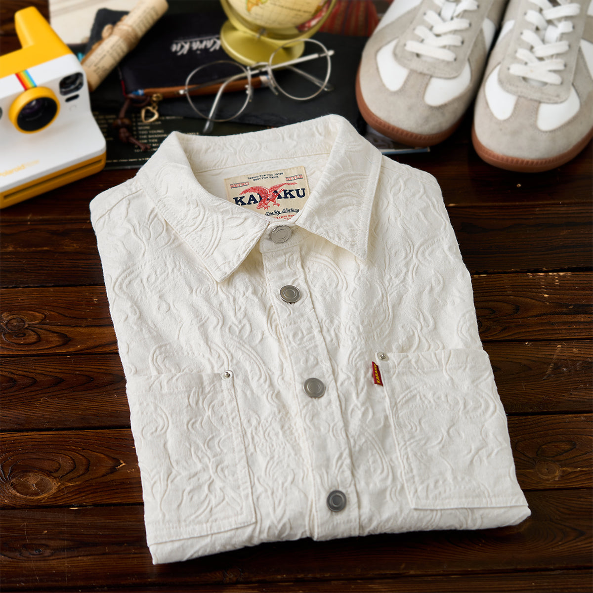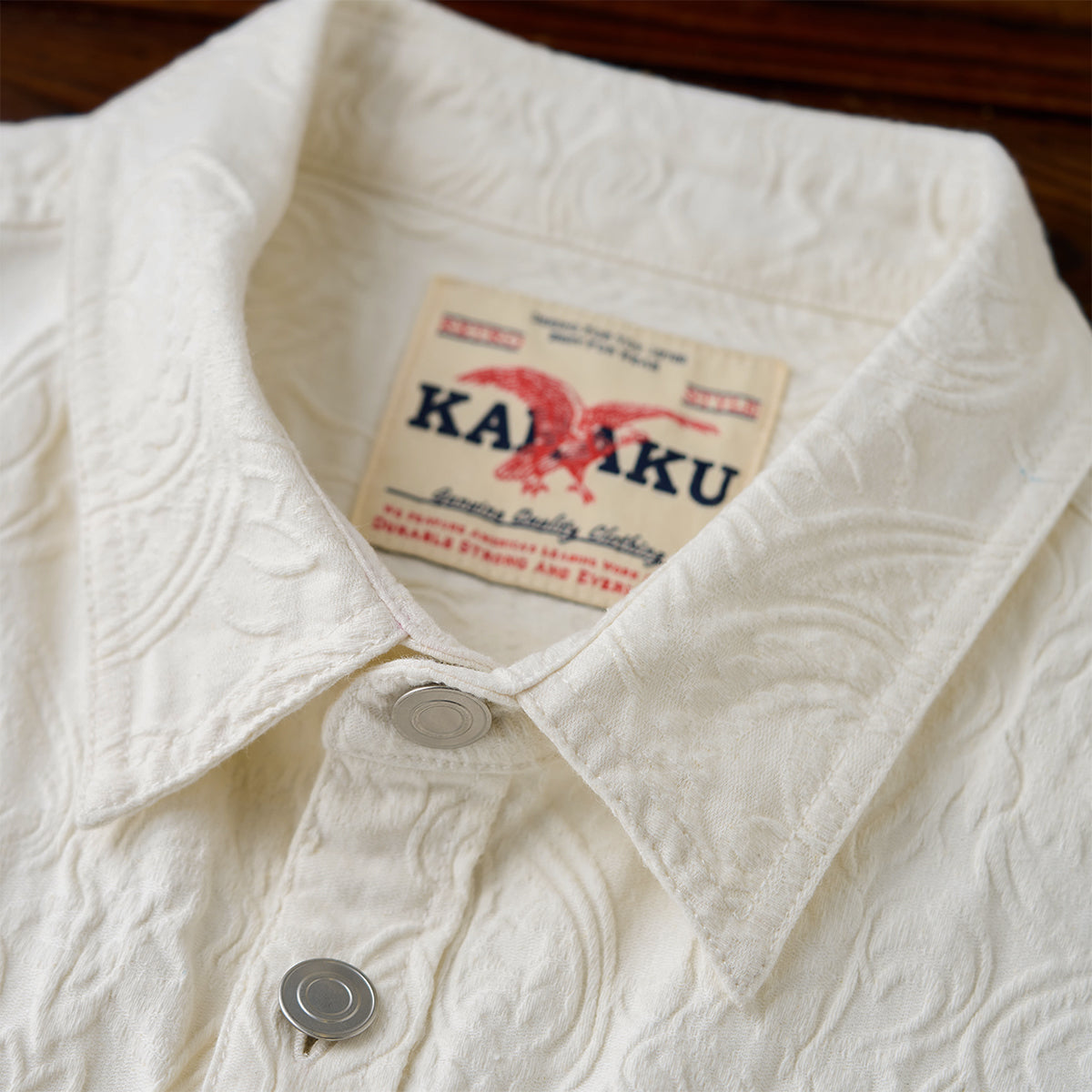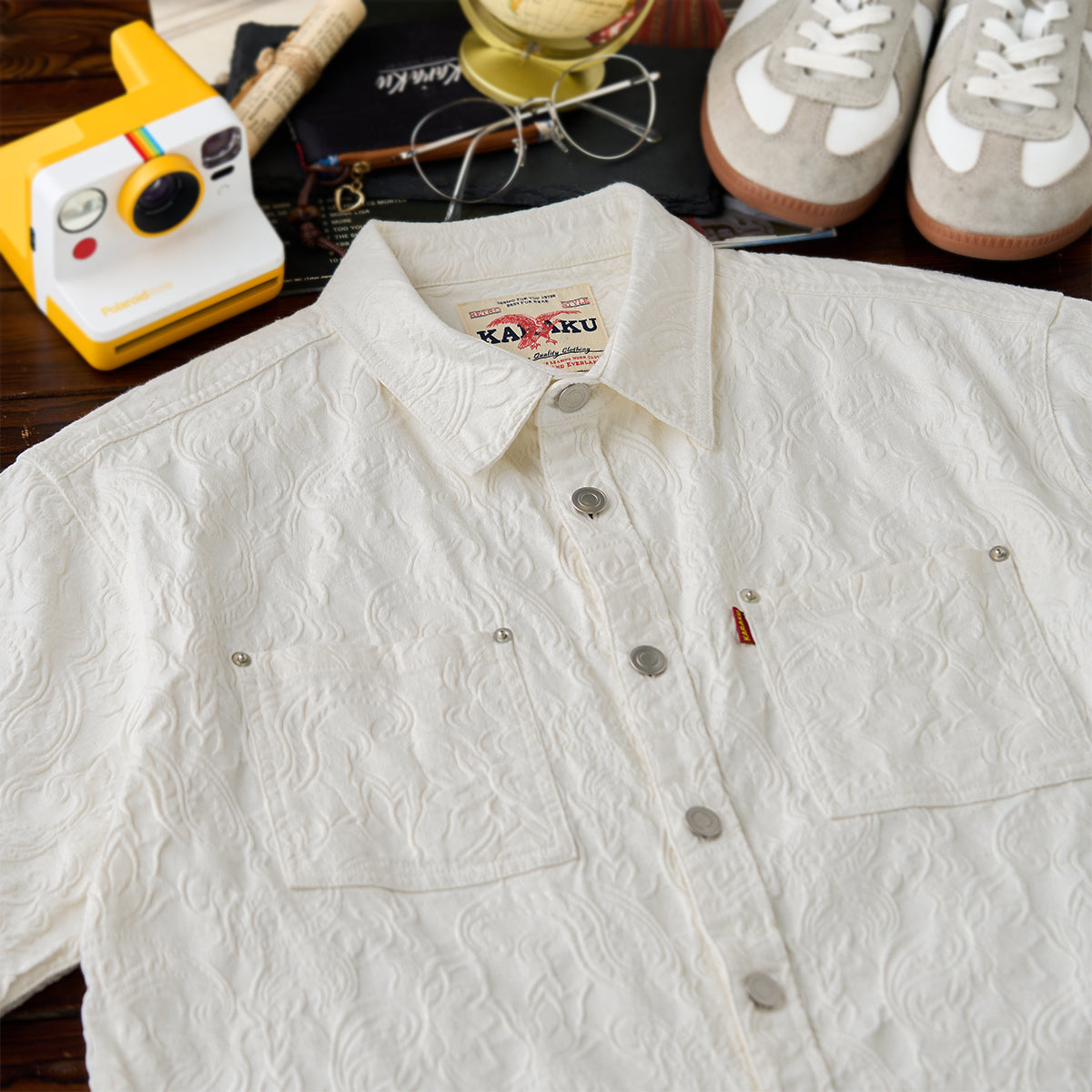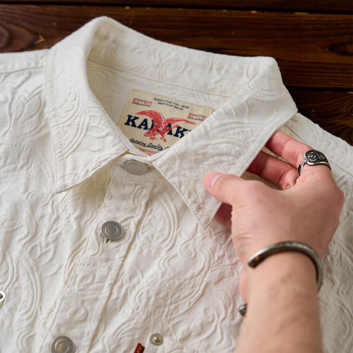 프린트가 아닌 엠보 가공으로 표현된 페이즐리 패턴으로, 화이트 컬러임에도 빛에 따라 은은하게 패턴이 드러나 세련된 분위기를 연출하는 셔츠입니다.