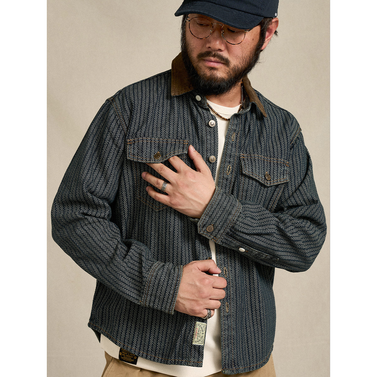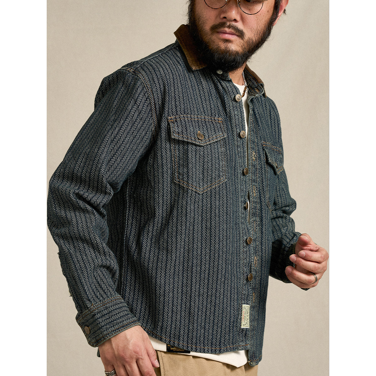 코듀로이 칼라 배색 헤링본 자카드 직조 데님 워크 셔츠