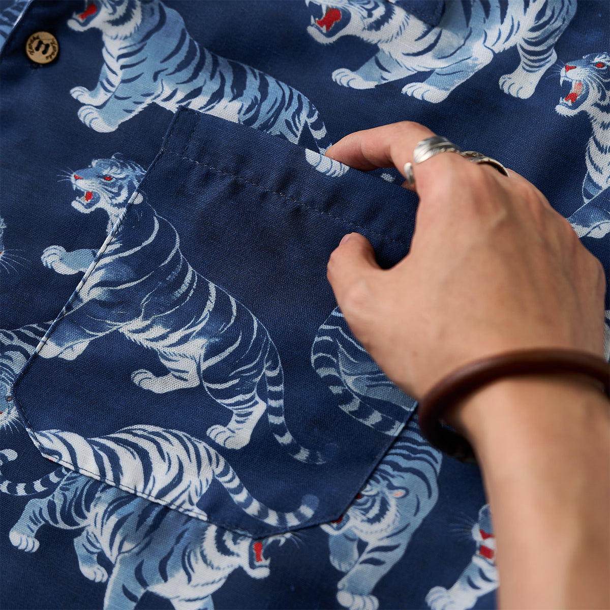 KARAKU×石黒亜矢子「꼬리 무는 백호」무늬 프린트 텐셀 알로하 셔츠