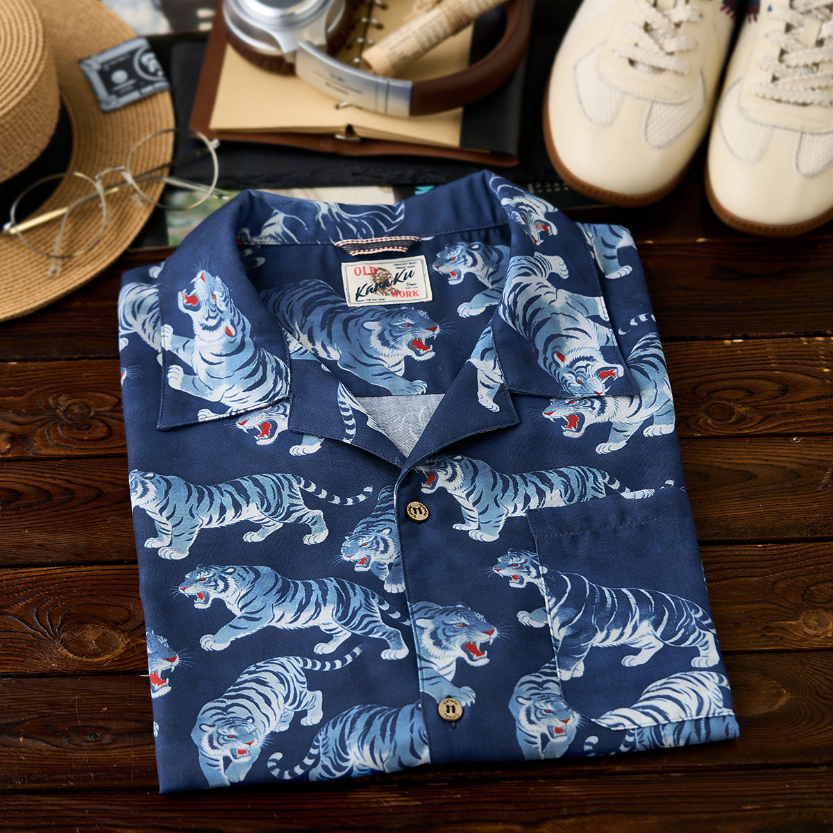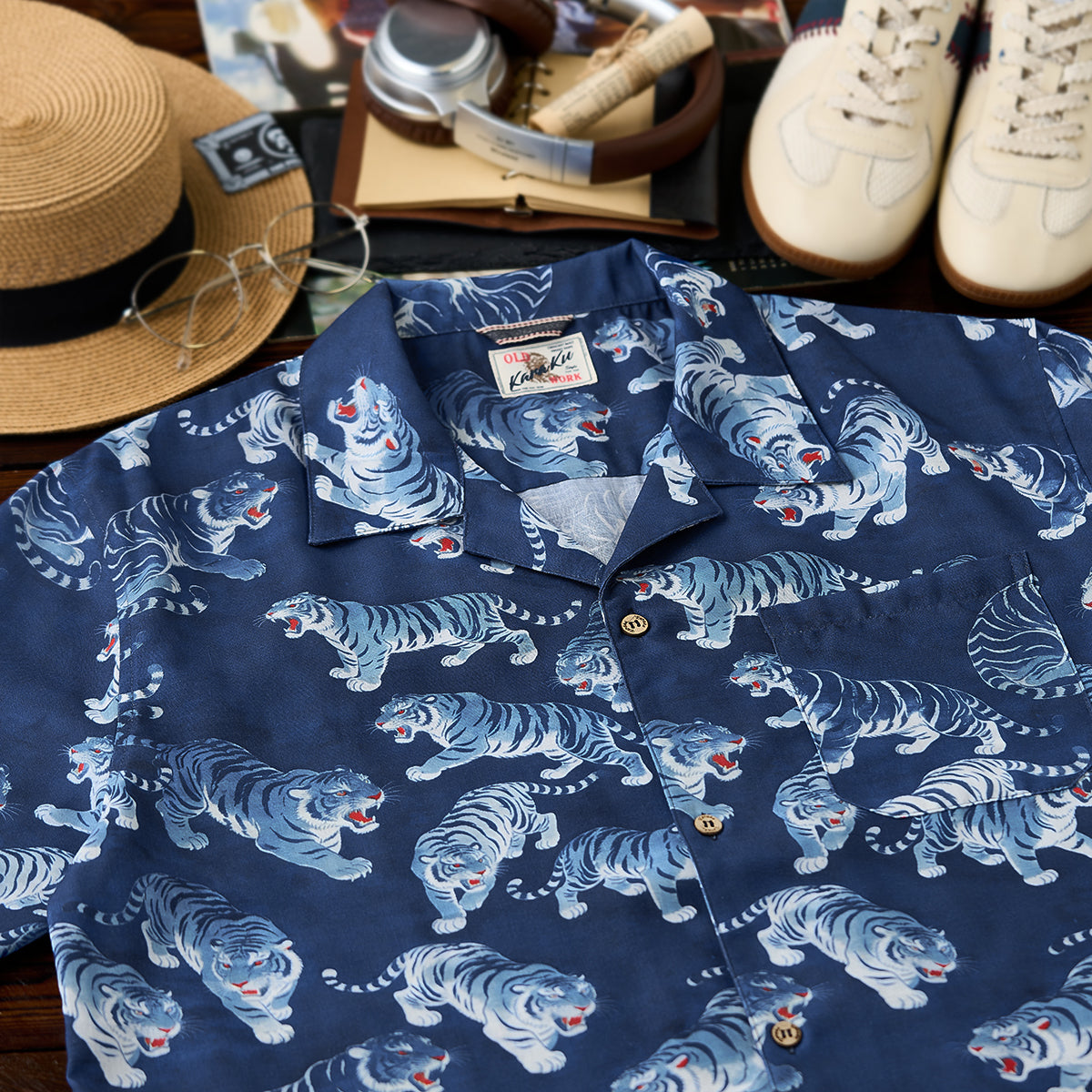 Karaku×川又聡「夢豹」터키석 단추 오픈칼라 셔츠