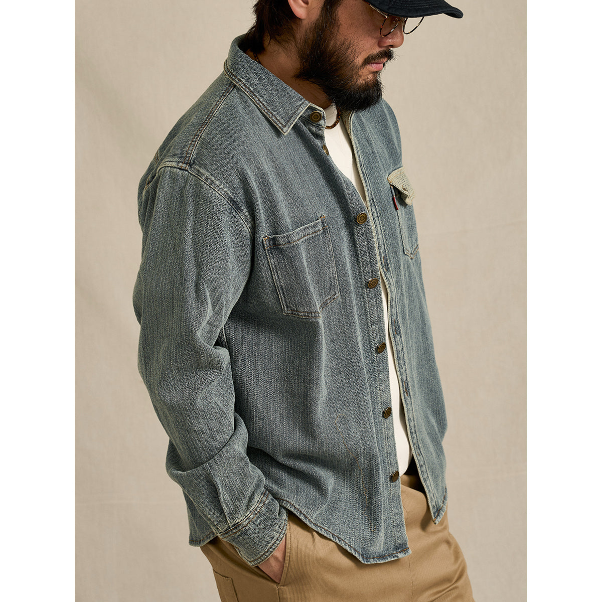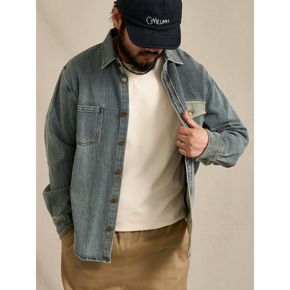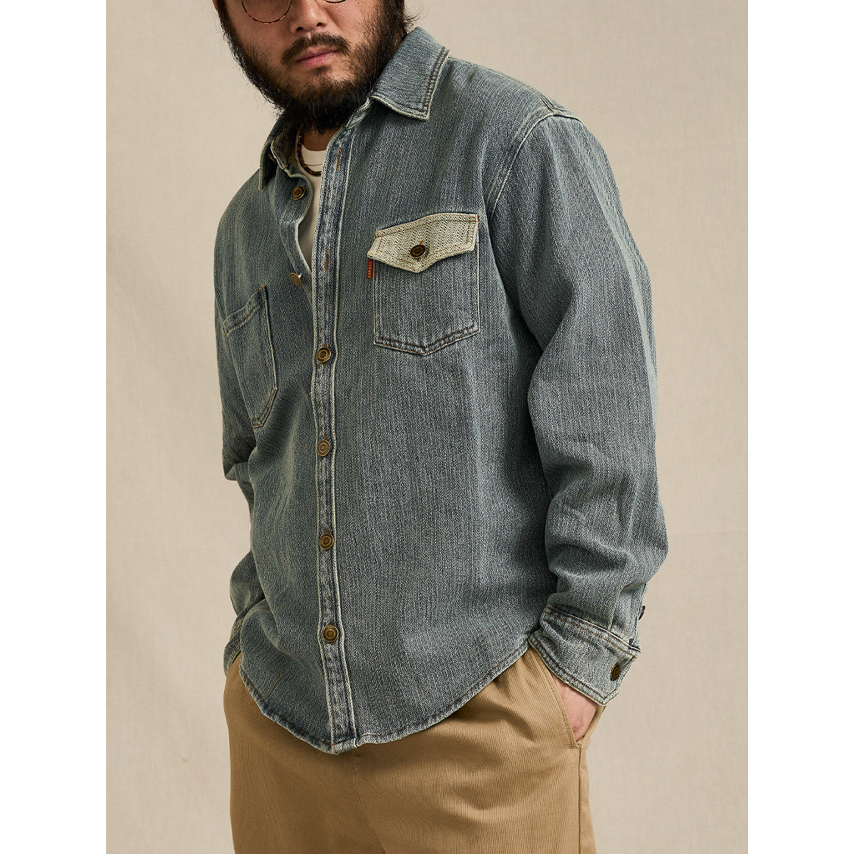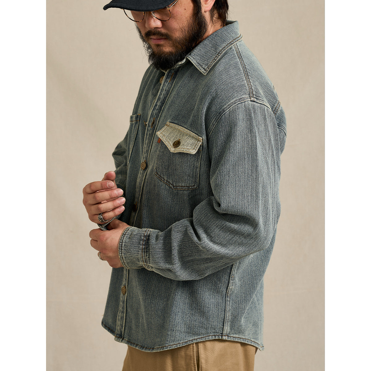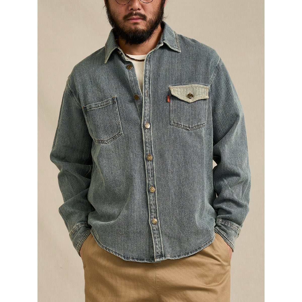 좌우 비대칭 포켓 헤링본 자카드 데님 워크 셔츠