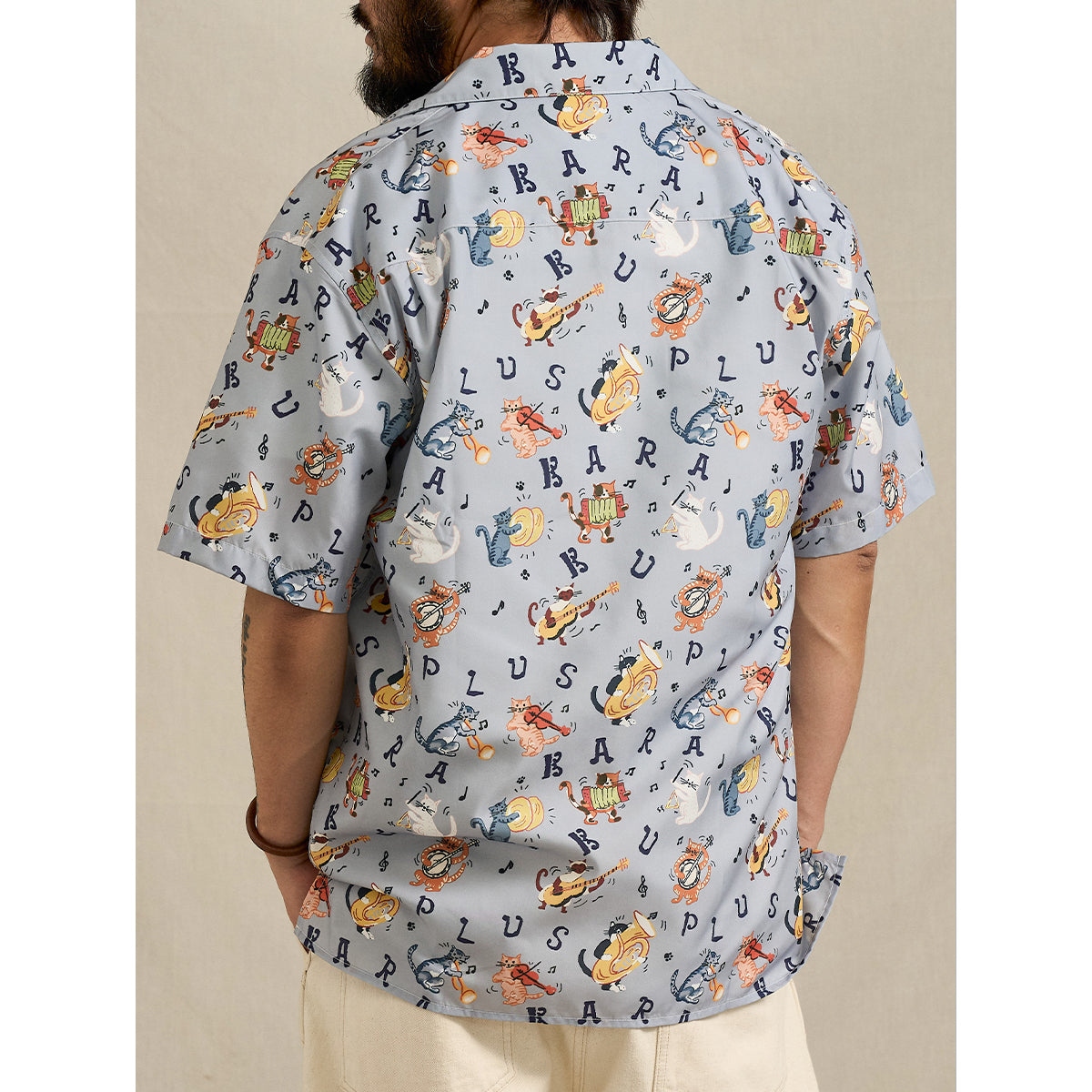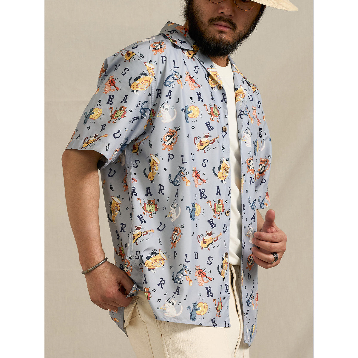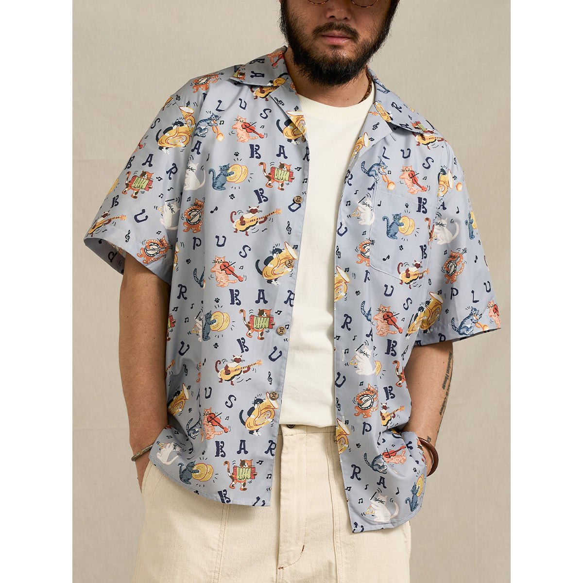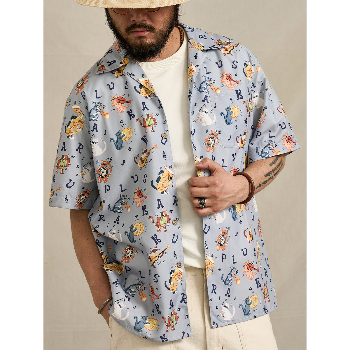 「고양이 음악가의 연주회」패턴 오픈칼라 셔츠