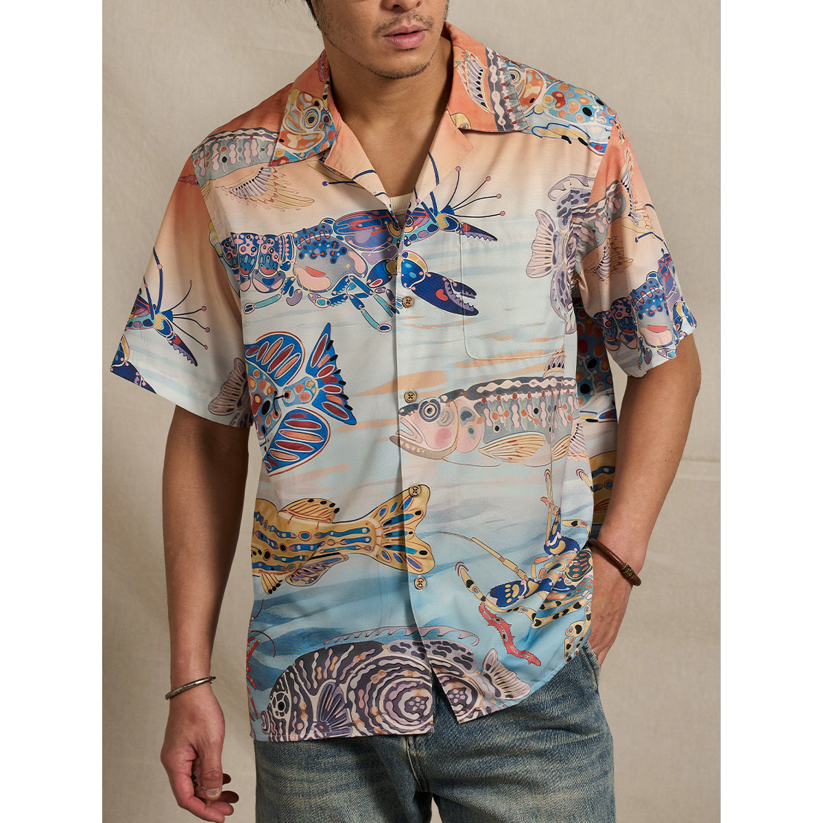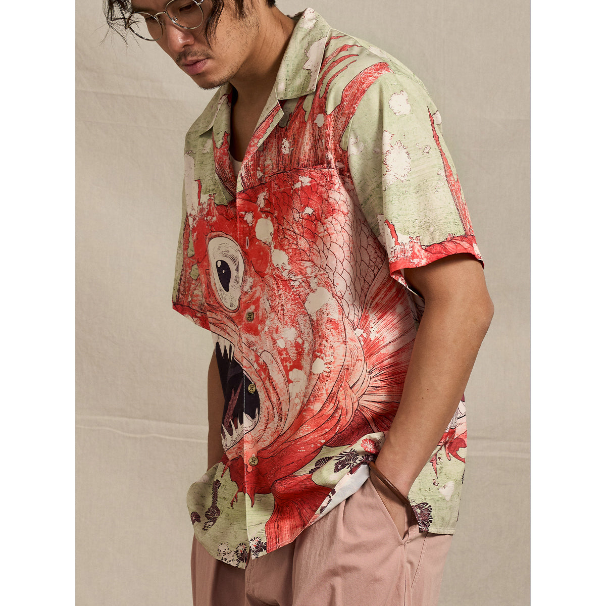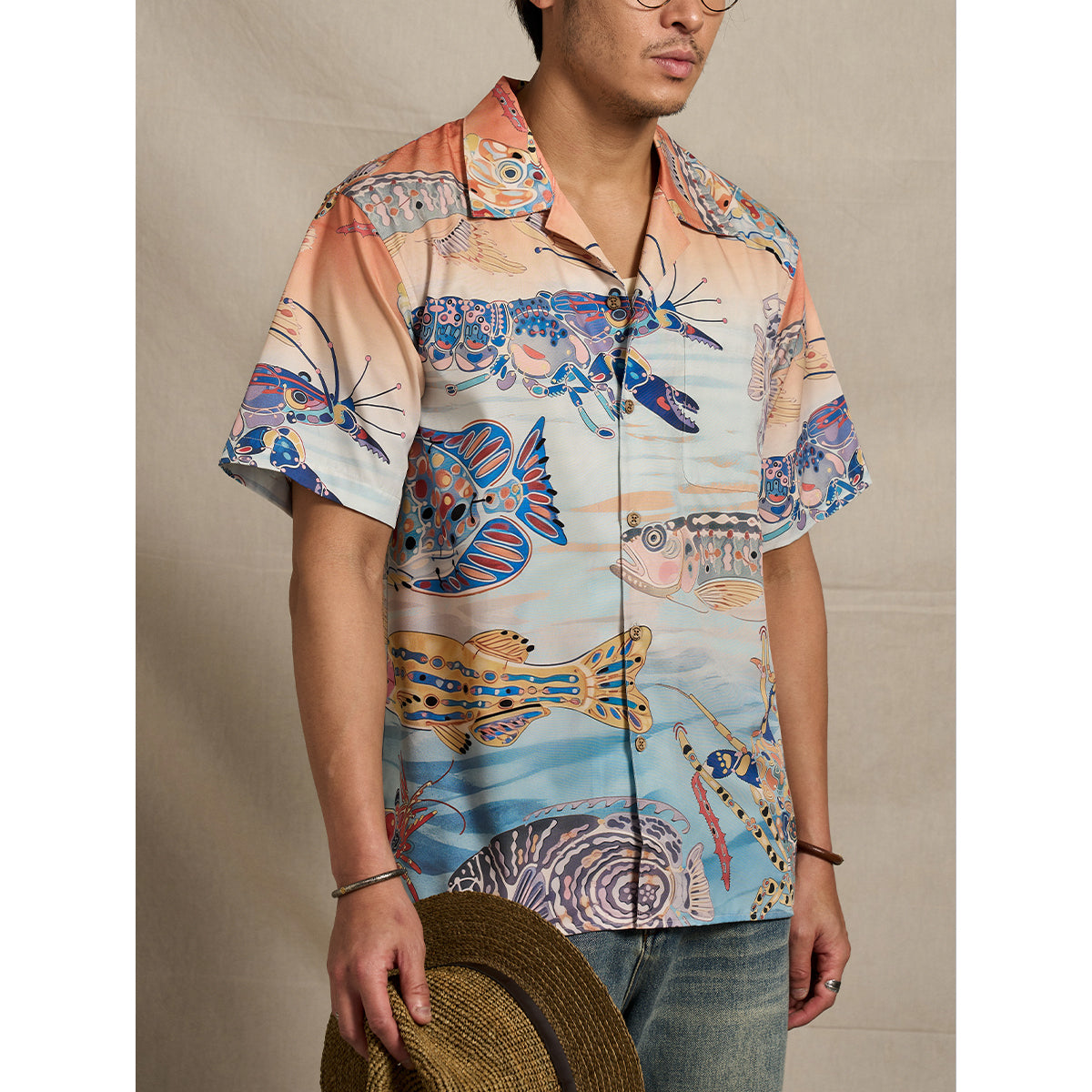 이토 쟈쿠츄「群魚図」프린트 오픈 카라 알로하 셔츠