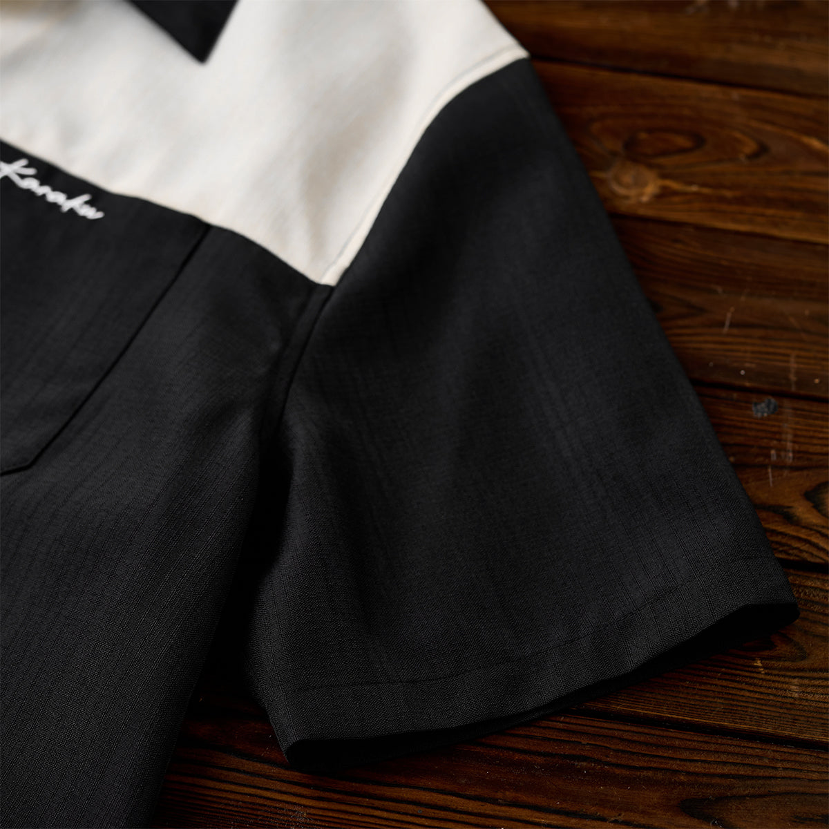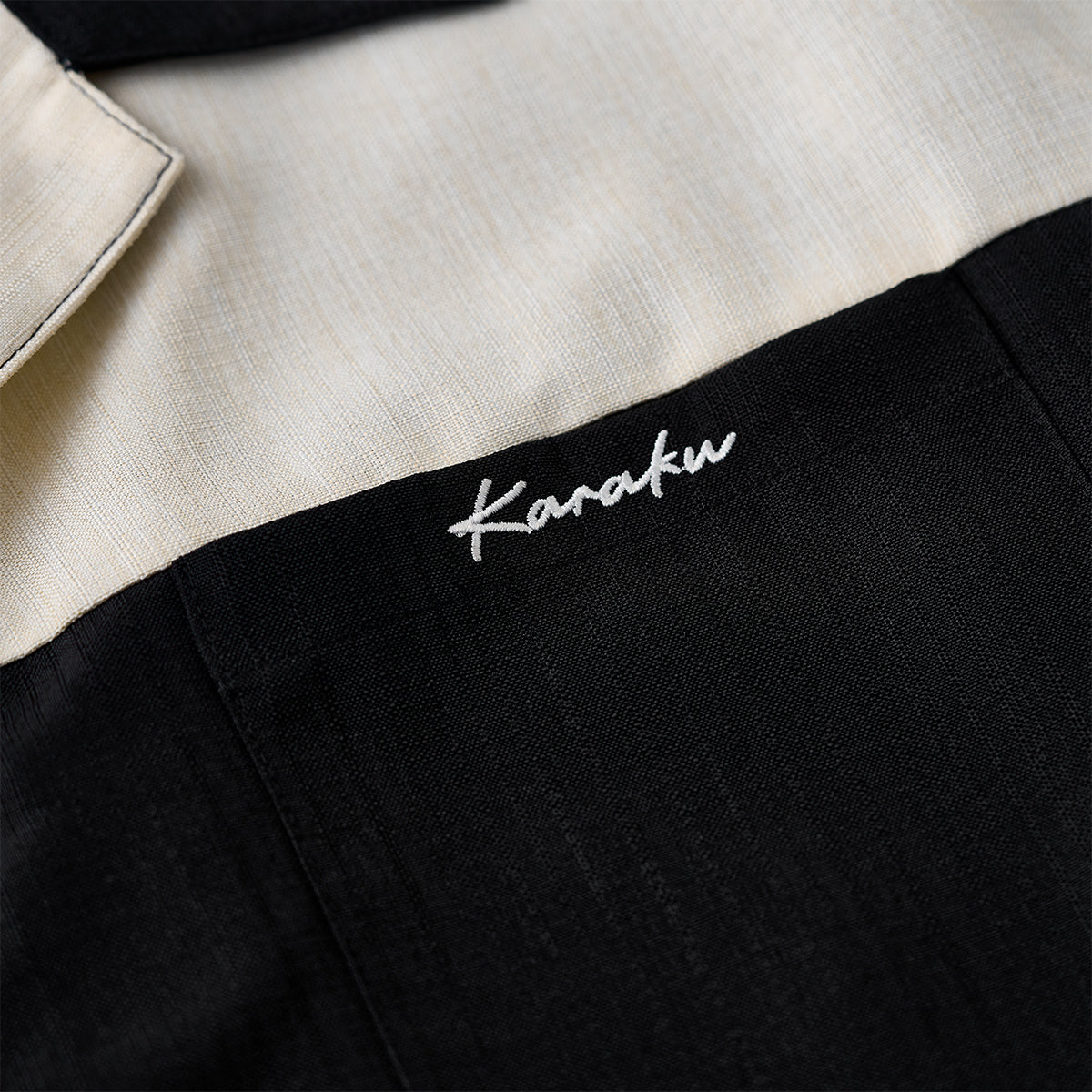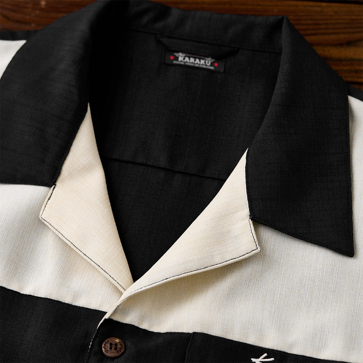 「Karaku」자수 배색 페이크 린넨 오픈 카라 셔츠