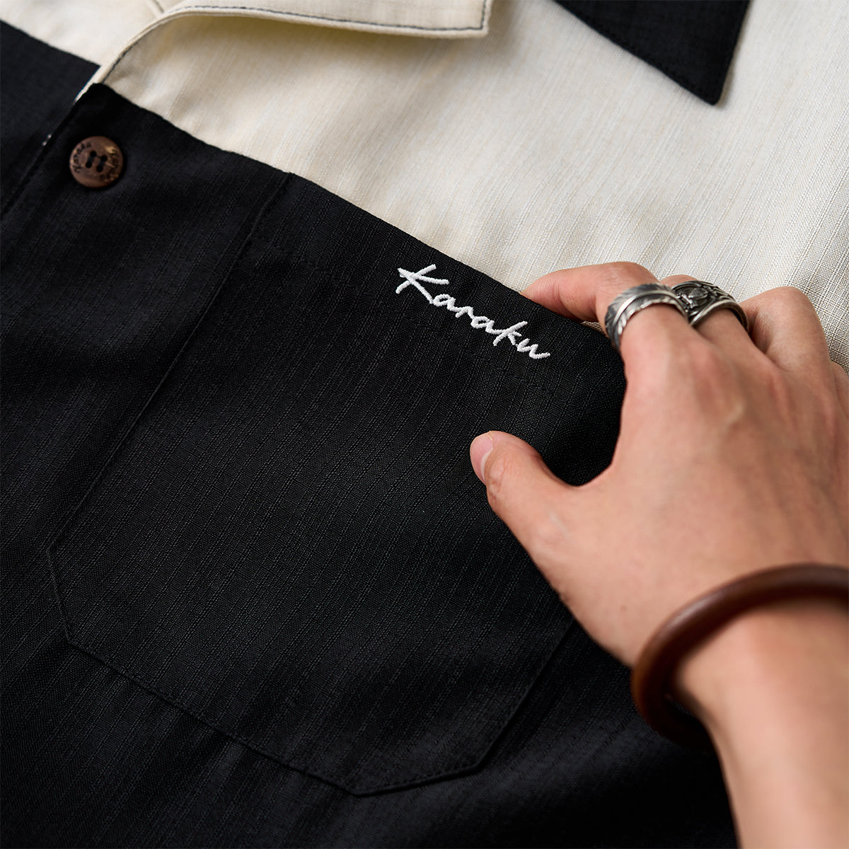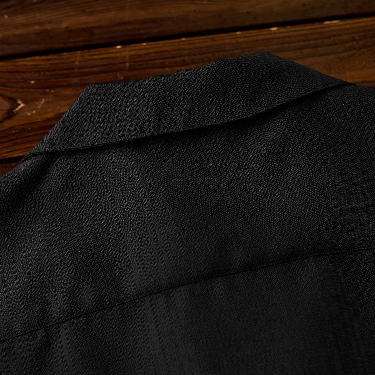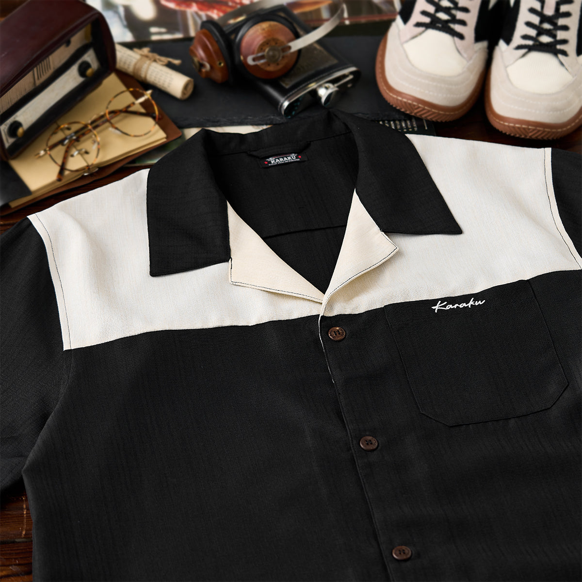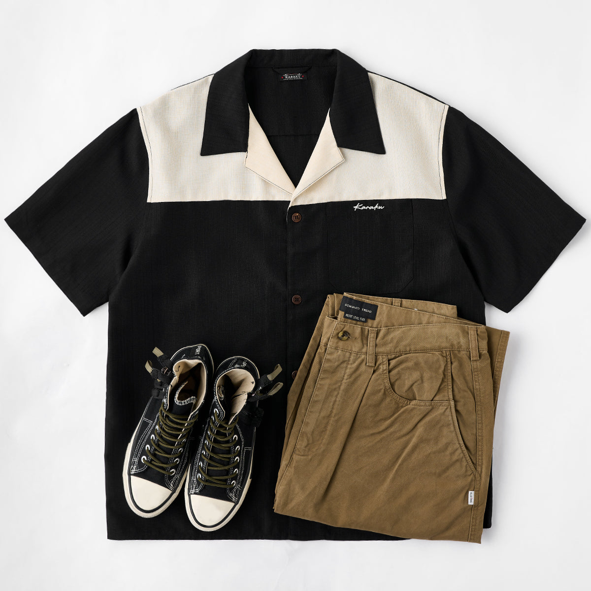 「Karaku」자수 배색 페이크 린넨 오픈 카라 셔츠