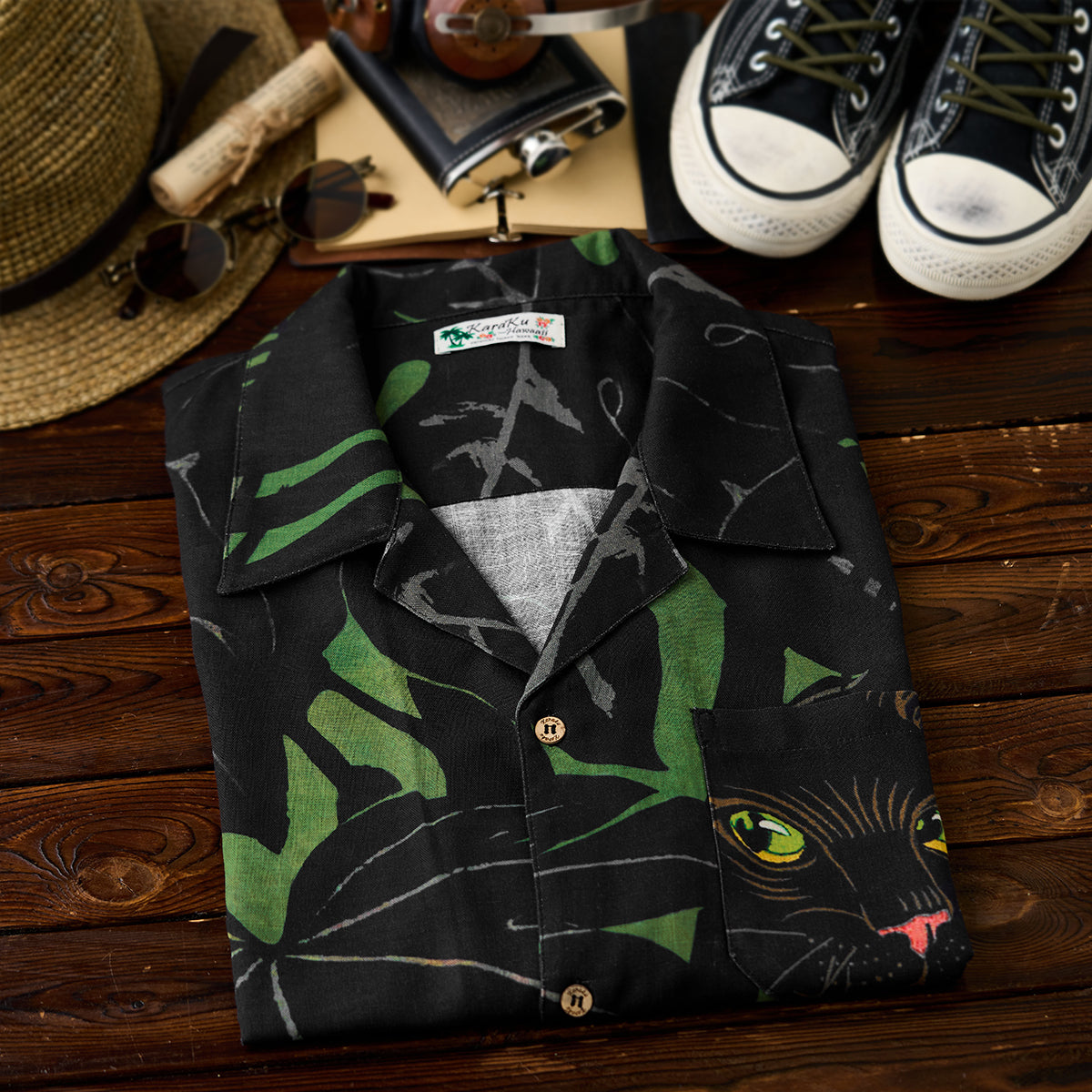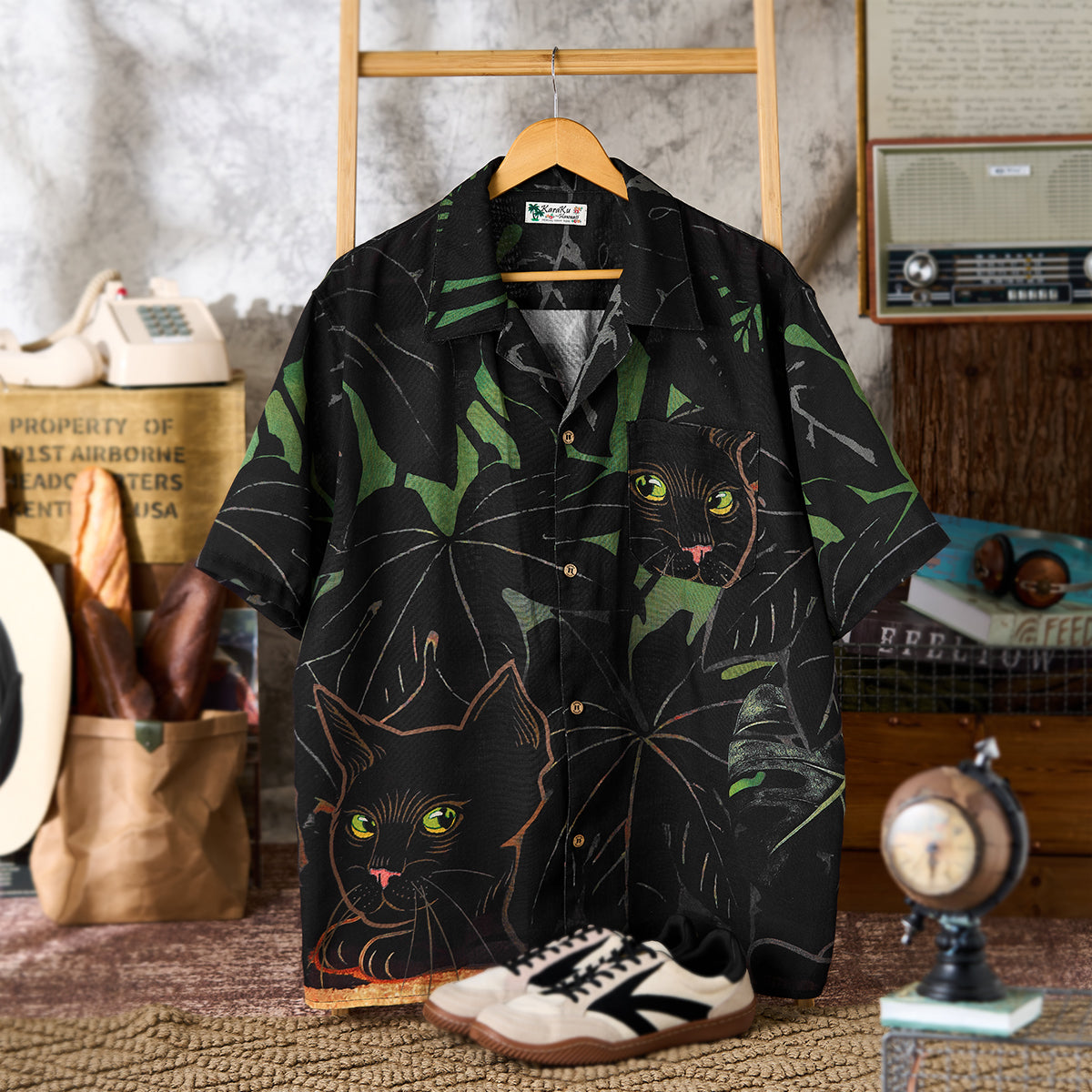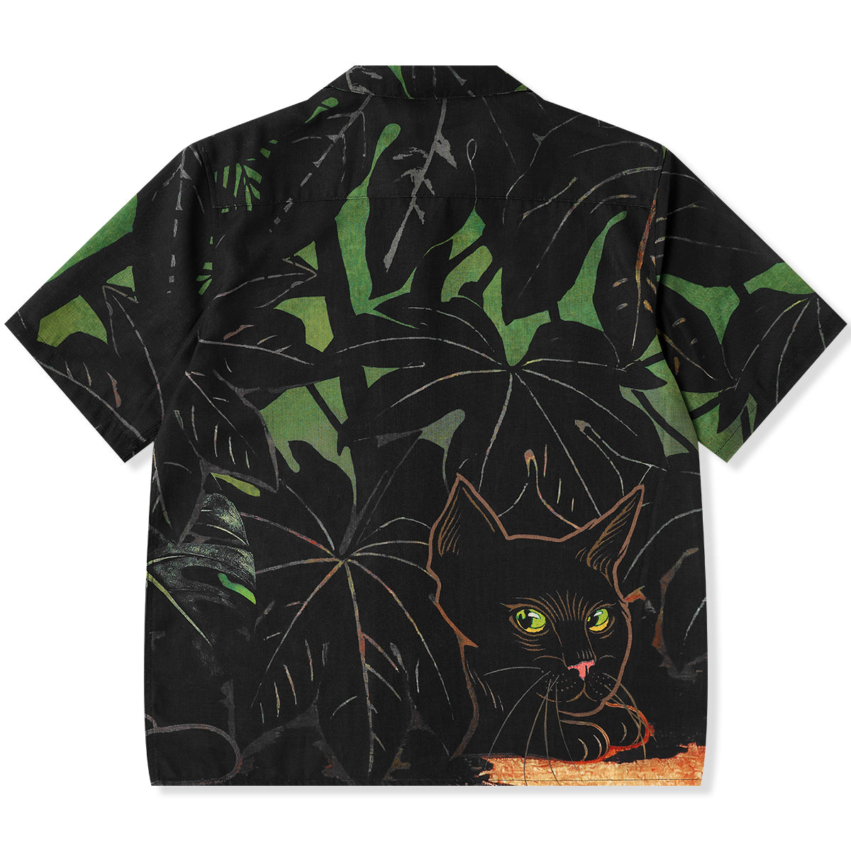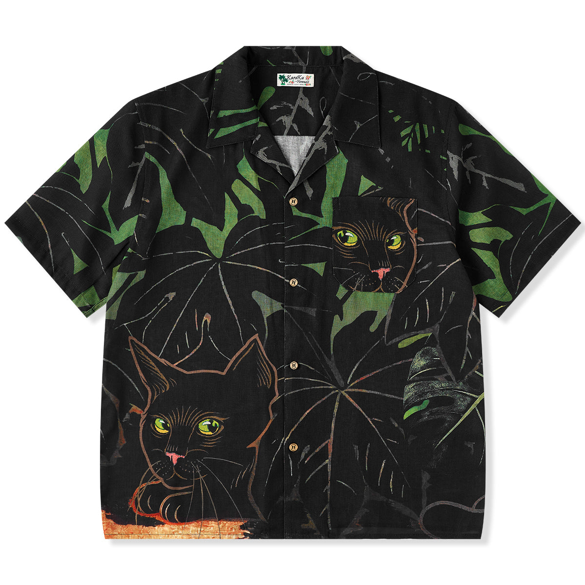 【사전예약】「나뭇잎 사이에 숨어 있는 고양이」판화 스타일 프린트 알로하 셔츠