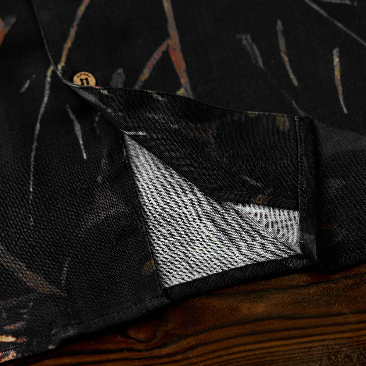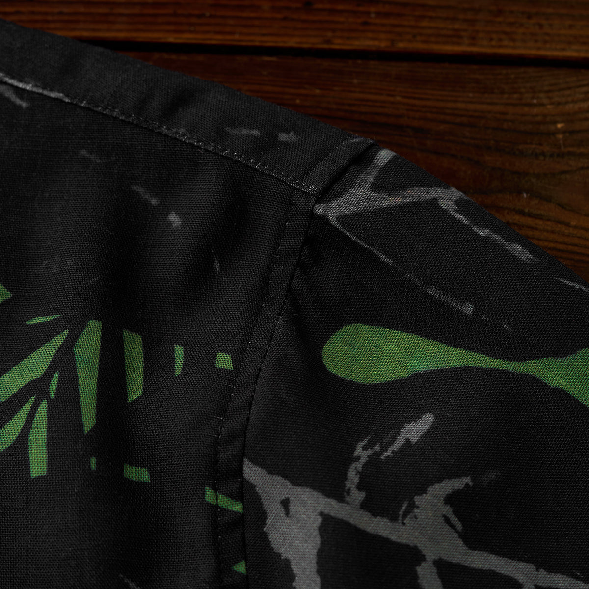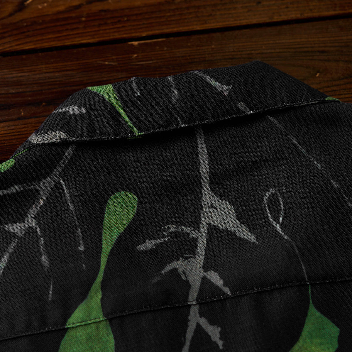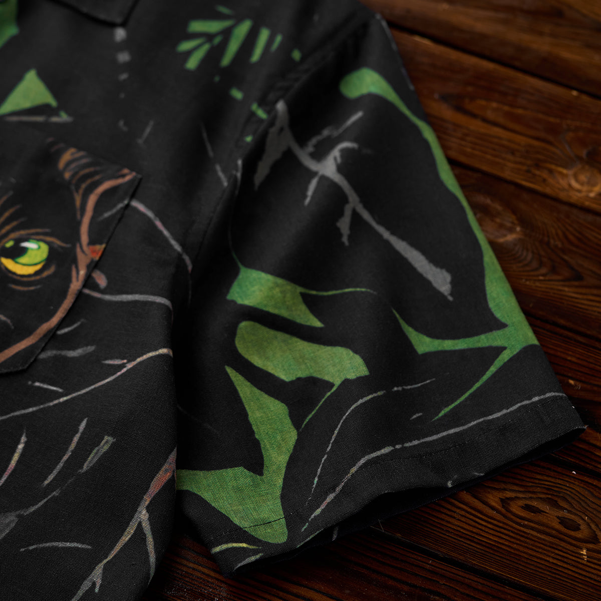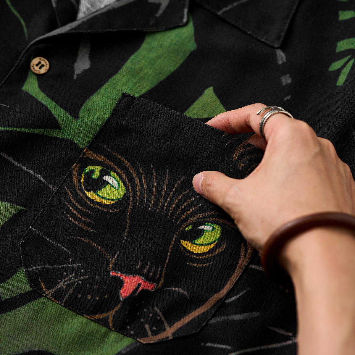 【사전예약】「나뭇잎 사이에 숨어 있는 고양이」판화 스타일 프린트 알로하 셔츠
