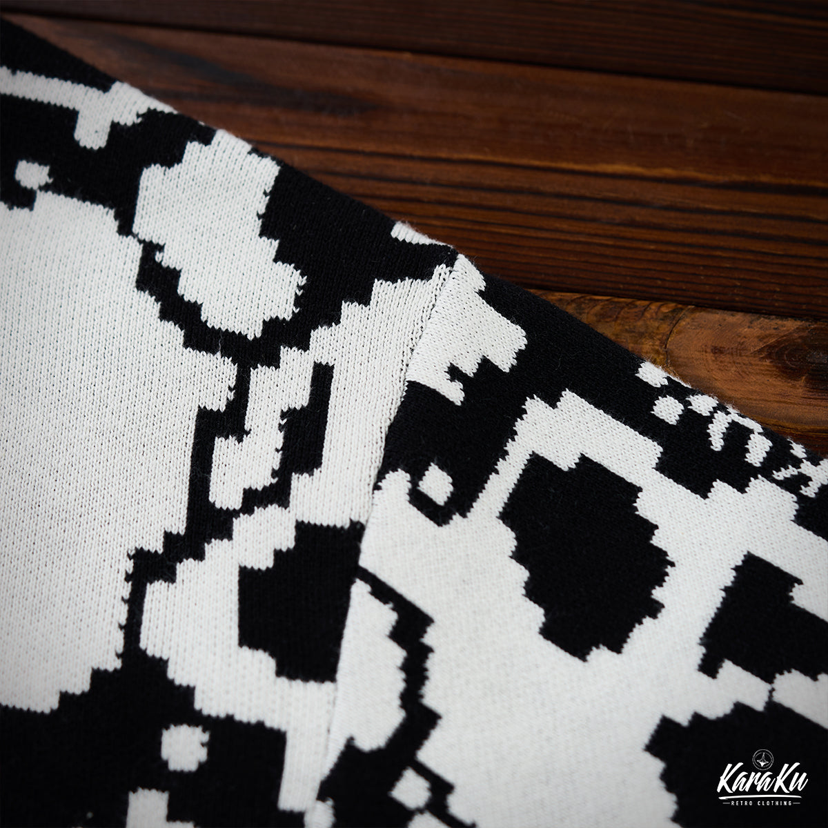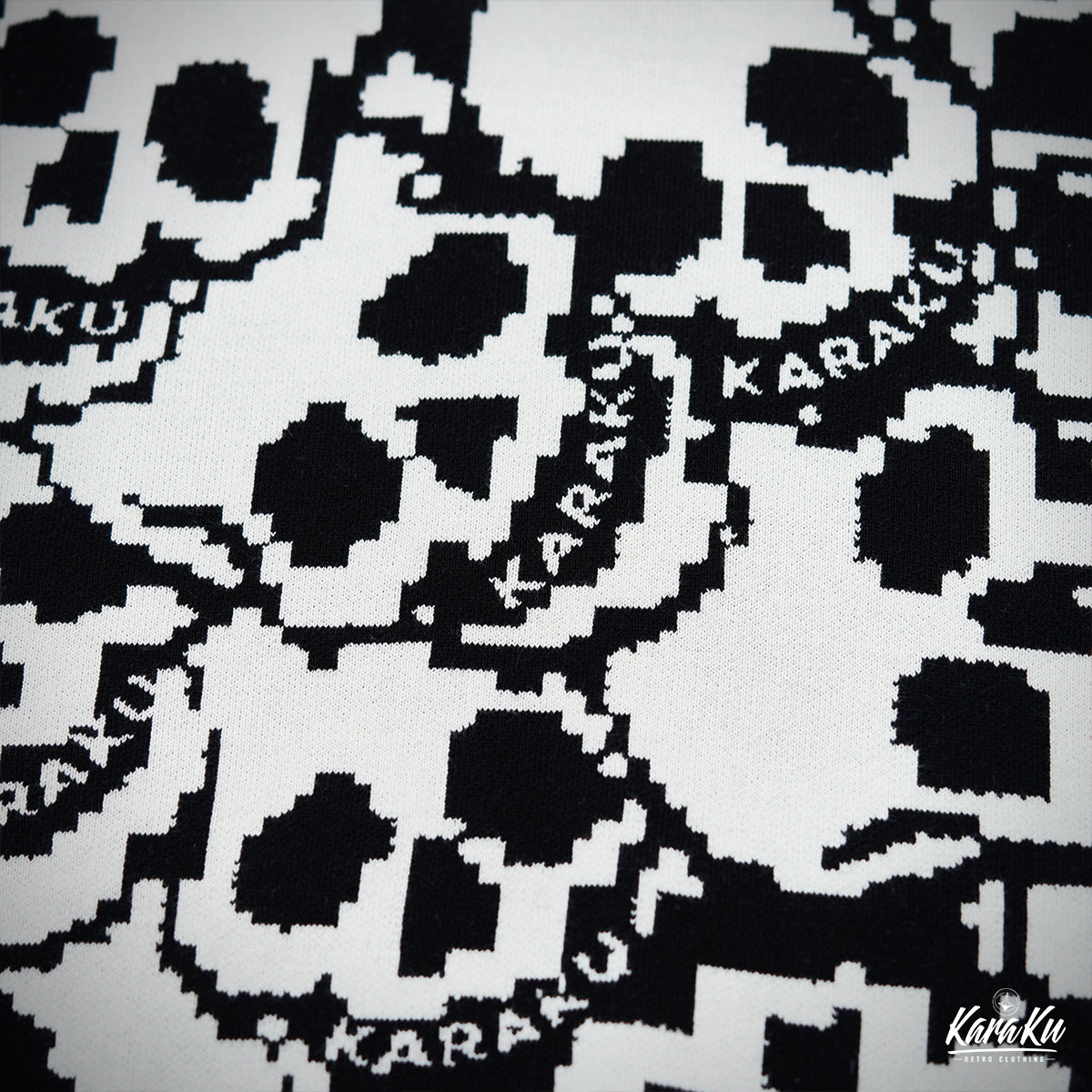 불규칙하게 배열된 자카드 직조의 해골 패턴이 특징이며, 블랙과 화이트의 선명한 대비가 강렬한 존재감을 드러냅니다. 해골의 입 부분에 "karaku" 브랜드 로고가 절묘하게 배치되어 있어 브랜드를 은근히 어필하면서도 독창성을 강조합니다. 모노톤의 컬러링과 대담한 디자인은 일상 속에서 개성을 드러내는 스타일을 제안합니다.