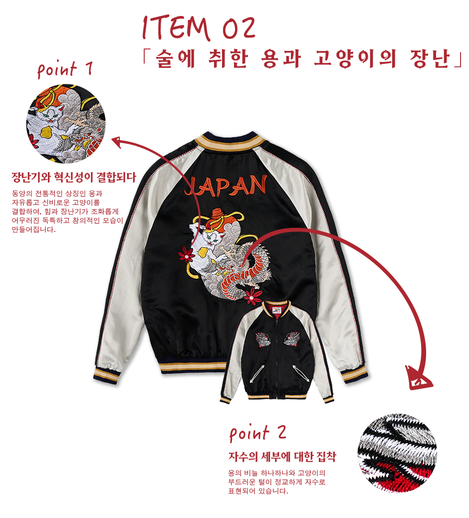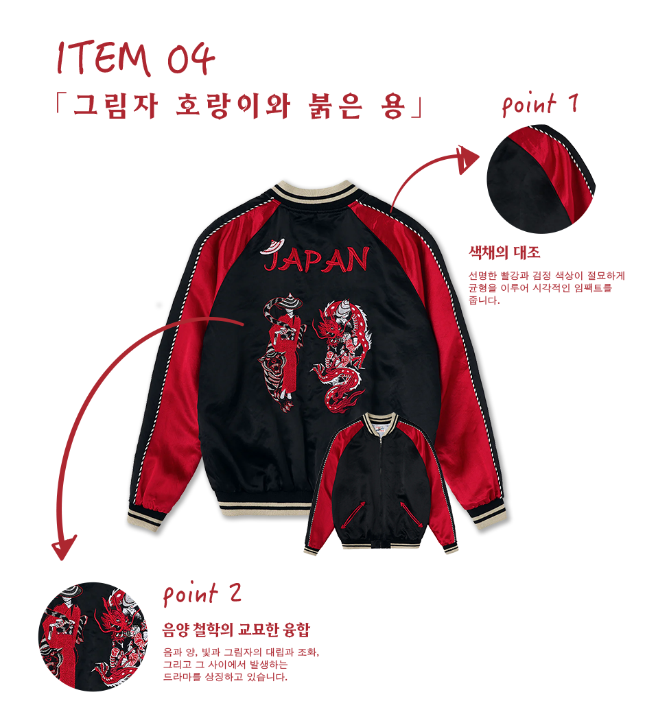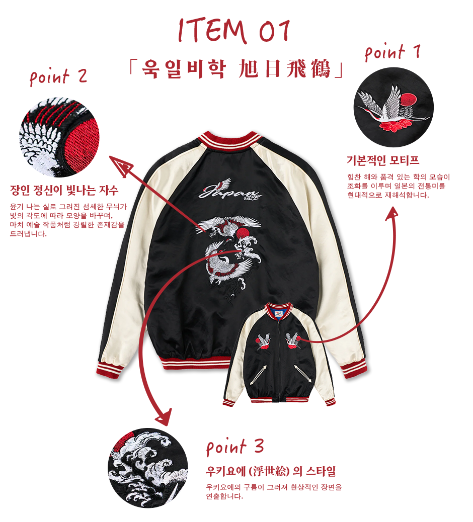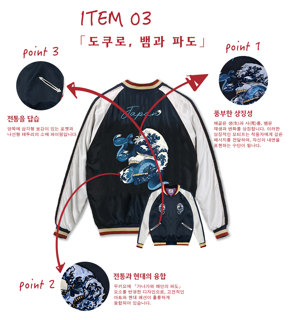 전통적인 미적 가치와 현대적인 엣지를 겸비한 KARAKU의 새로운 스카잔 컬렉션은 뒷면에 수놓아진 멋진 자수가 시선을 사로잡습니다. 각 디자인에는 우키요에(浮世絵)의 깊은 이야기와 동양 미학을 담은 상징적인 모티프가 포함되어 있어, 입는 이마다 각기 다른 감동을 선사합니다.