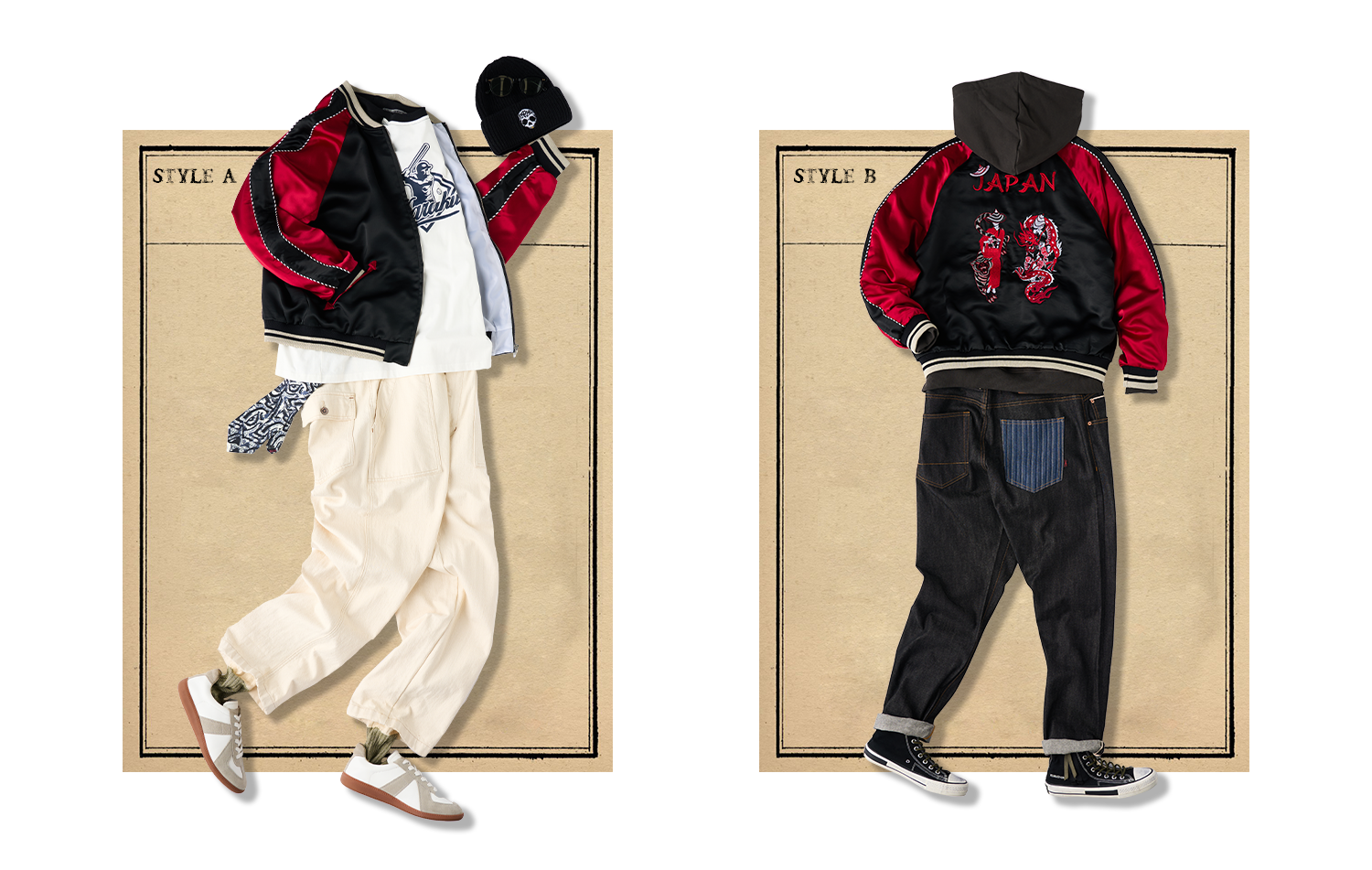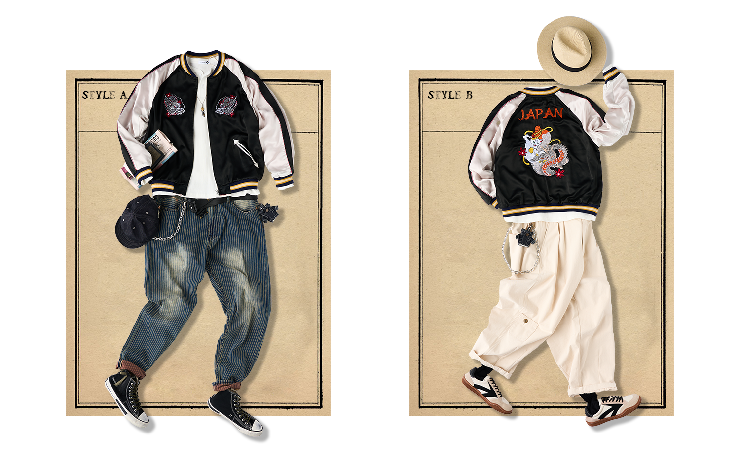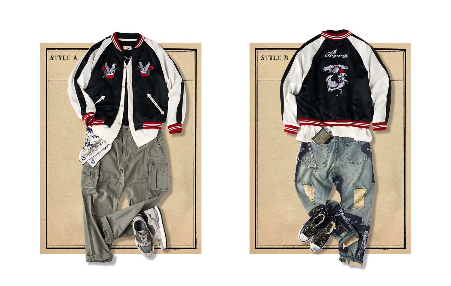 전통적인 미적 가치와 현대적인 엣지를 겸비한 KARAKU의 새로운 스카잔 컬렉션은 뒷면에 수놓아진 멋진 자수가 시선을 사로잡습니다. 각 디자인에는 우키요에(浮世絵)의 깊은 이야기와 동양 미학을 담은 상징적인 모티프가 포함되어 있어, 입는 이마다 각기 다른 감동을 선사합니다.