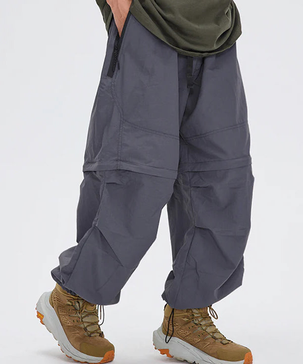 한바지로 두가지 입을 수 있는 디자인입니다. 긴바지로 탈부착가능하며 반바지로도 입을 수 있습니다. 와이드 핏에 허리 사이즈 조절이 가능한 허리띠가 있음으로 누구나 체형에 구애받지 않고 착용하기 좋으며 편안한 착용감을 제공합니다. 무릅 부분에 주름이 있어 자연스러운 착용효과를 보여주며 다리를 길어보입니다.