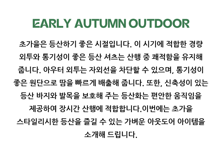 원단은 속건성을 갖추고 있어 땀을 흘려도 빨리 마르고 불쾌감을 줄일 수 있습니다. 바람을 막아주는 스탠드 칼라 디자인과 고무 소맷단, 밑단, 앞지퍼 포켓 장비 등 마운틴 자켓다운 기능성을 가진 디테일은 탄탄하게 적용되었습니다.
