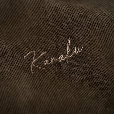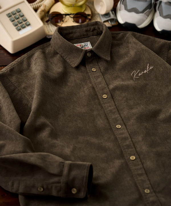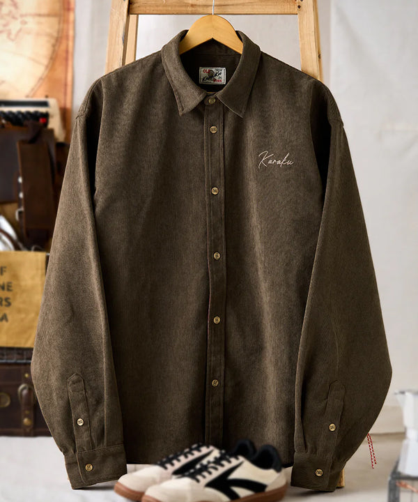 잔골 코듀로이 표면과 타탄 체크 안감이 돋보이는 가을·겨울 셔츠로, 밑단의 빨간 끈이 스타일 포인트입니다.