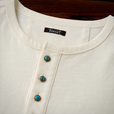 터키석 단추로 포인트를 준 개량 헨리넥 티셔츠입니다. 단독이나 이너로 사계절 활용 가능합니다.