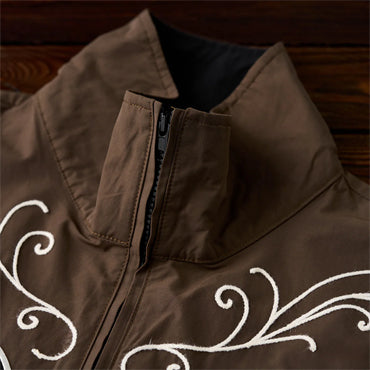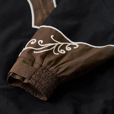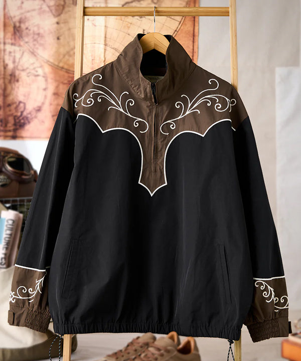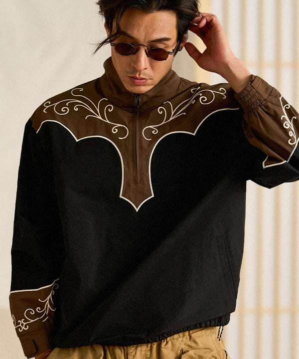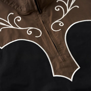 브라운과 블랙의 바이컬러 배색에 아이보리 덩굴무늬 체인 자수가 포인트인 웨스턴 무드의 하프 집업 풀오버. 매직 테이프와 드로우코드로 착용감과 실루엣을 손쉽게 조절할 수 있어, 실용성과 스타일을 모두 갖춘 아이템입니다.