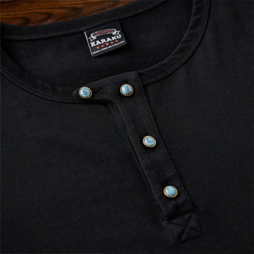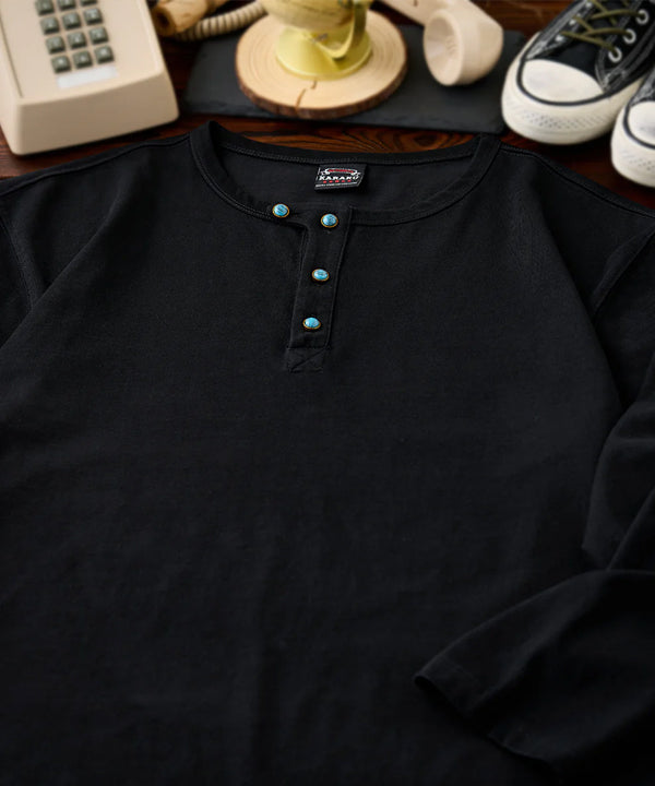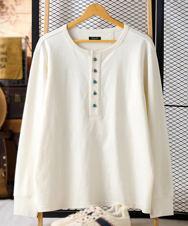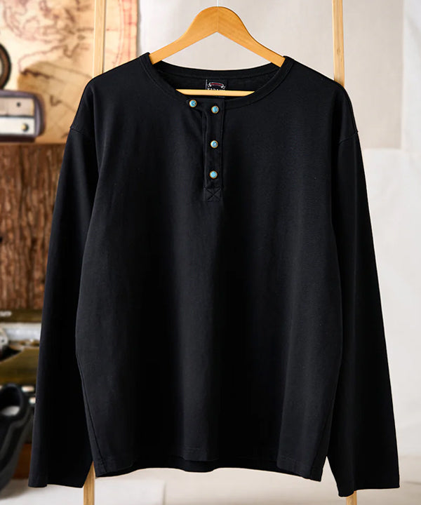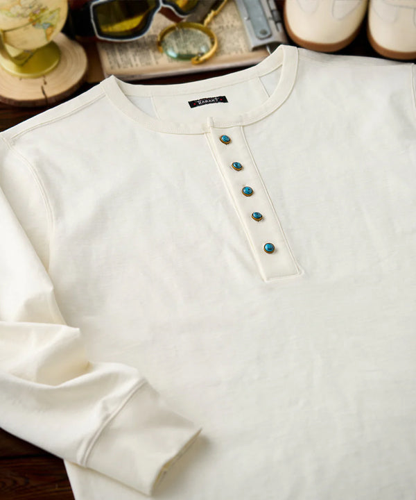 헨리넥과 터키석 단추가 돋보이는 세련된 긴팔 티셔츠로, 단독 착용은 물론 이너로도 활용하기 좋은 캐주얼 아이템입니다.
