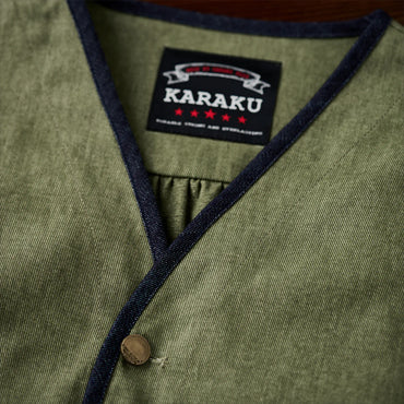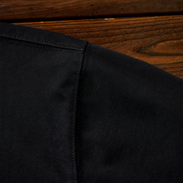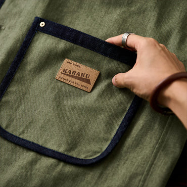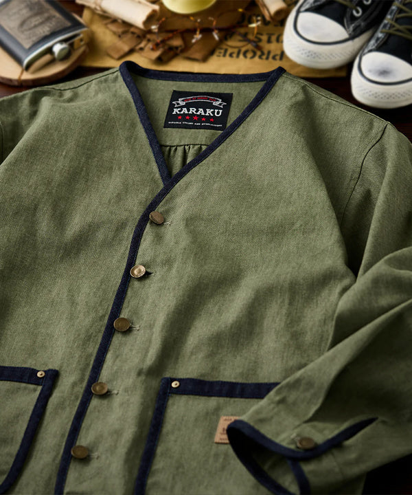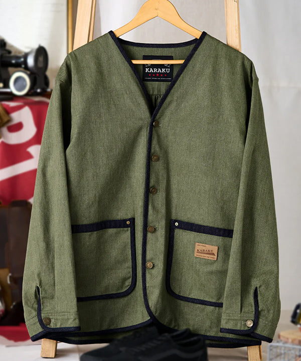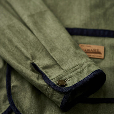 노카라 디자인과 네이비 데님 파이핑으로 모던한 실루엣을 완성했으며, 브라스 단추와 넉넉한 패치 포켓으로 세련된 포인트와 실용성을 더한 자켓입니다.