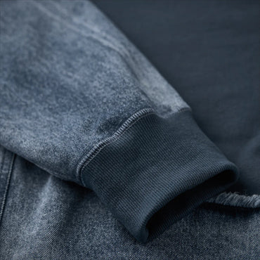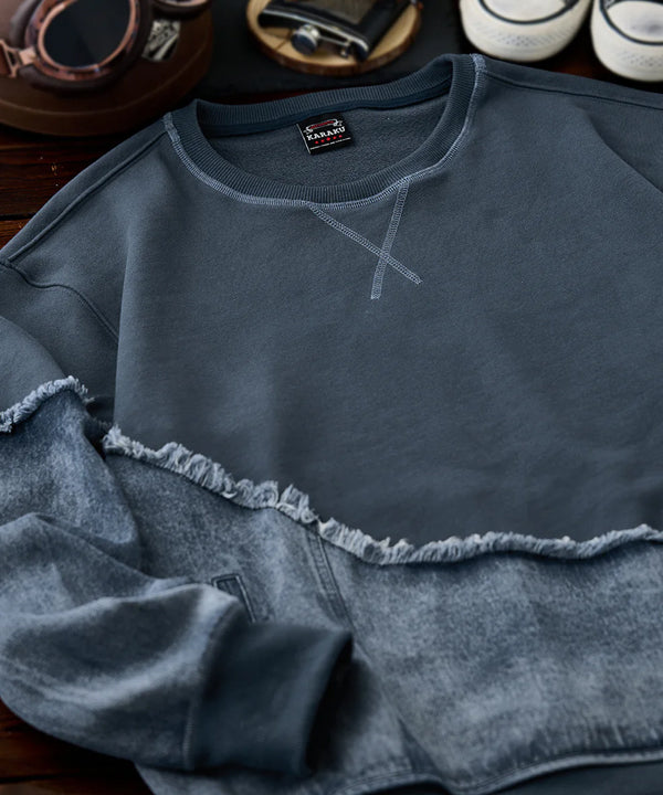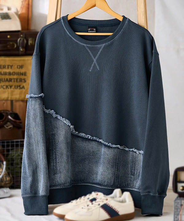 빈티지 워시드 데님 배색과 ‘V 가셋’, 페이크 포켓 장식이 돋보이는 크루넥 코튼 스웨트셔츠입니다.
