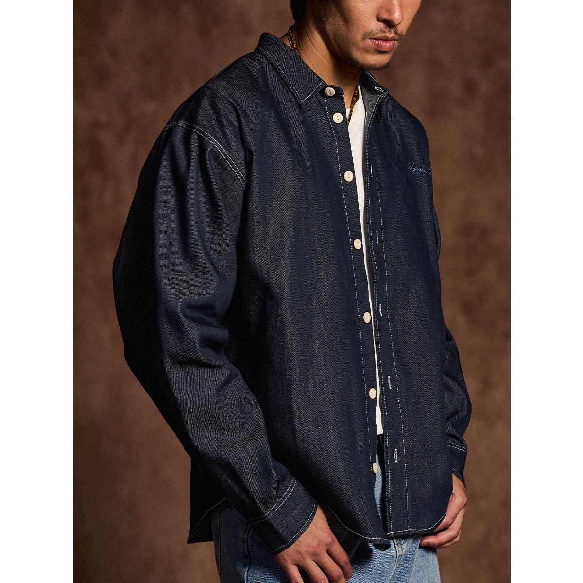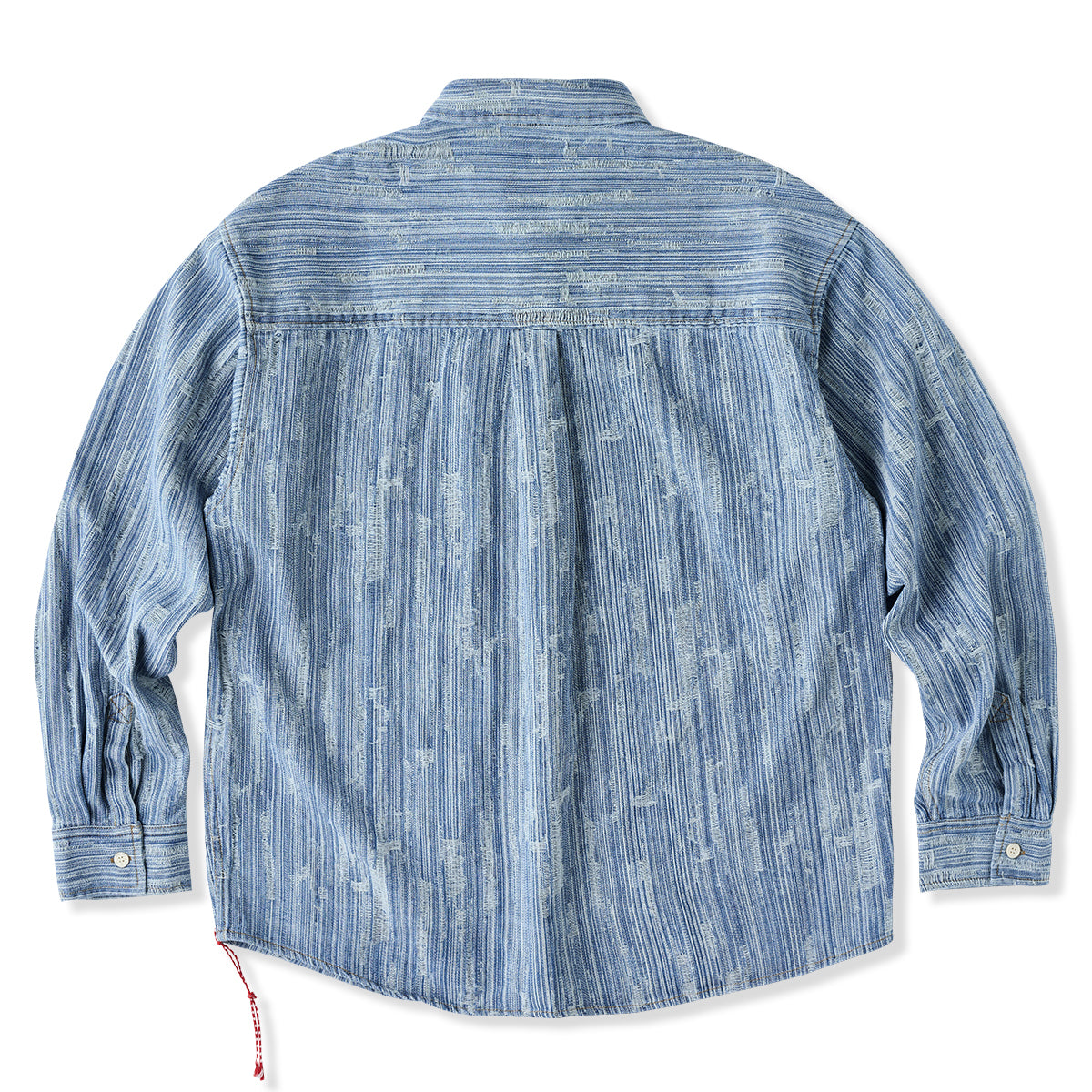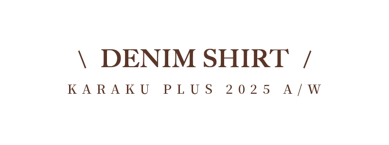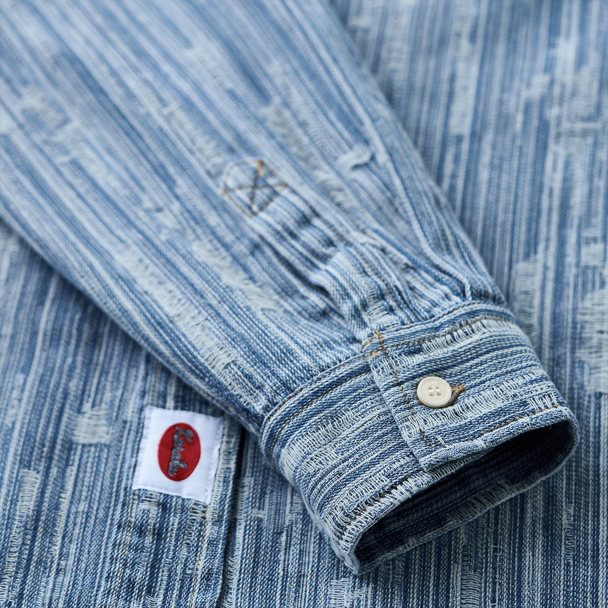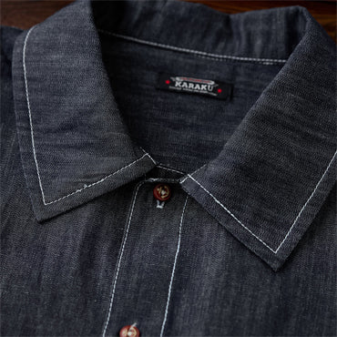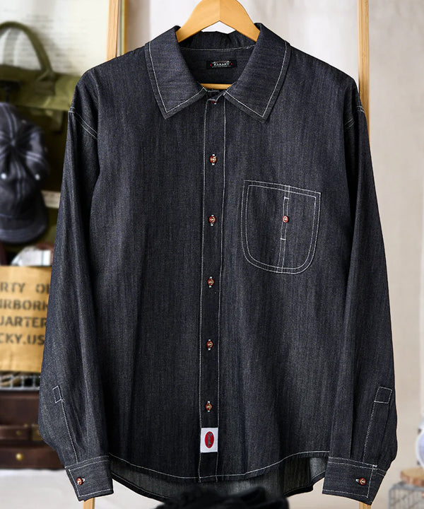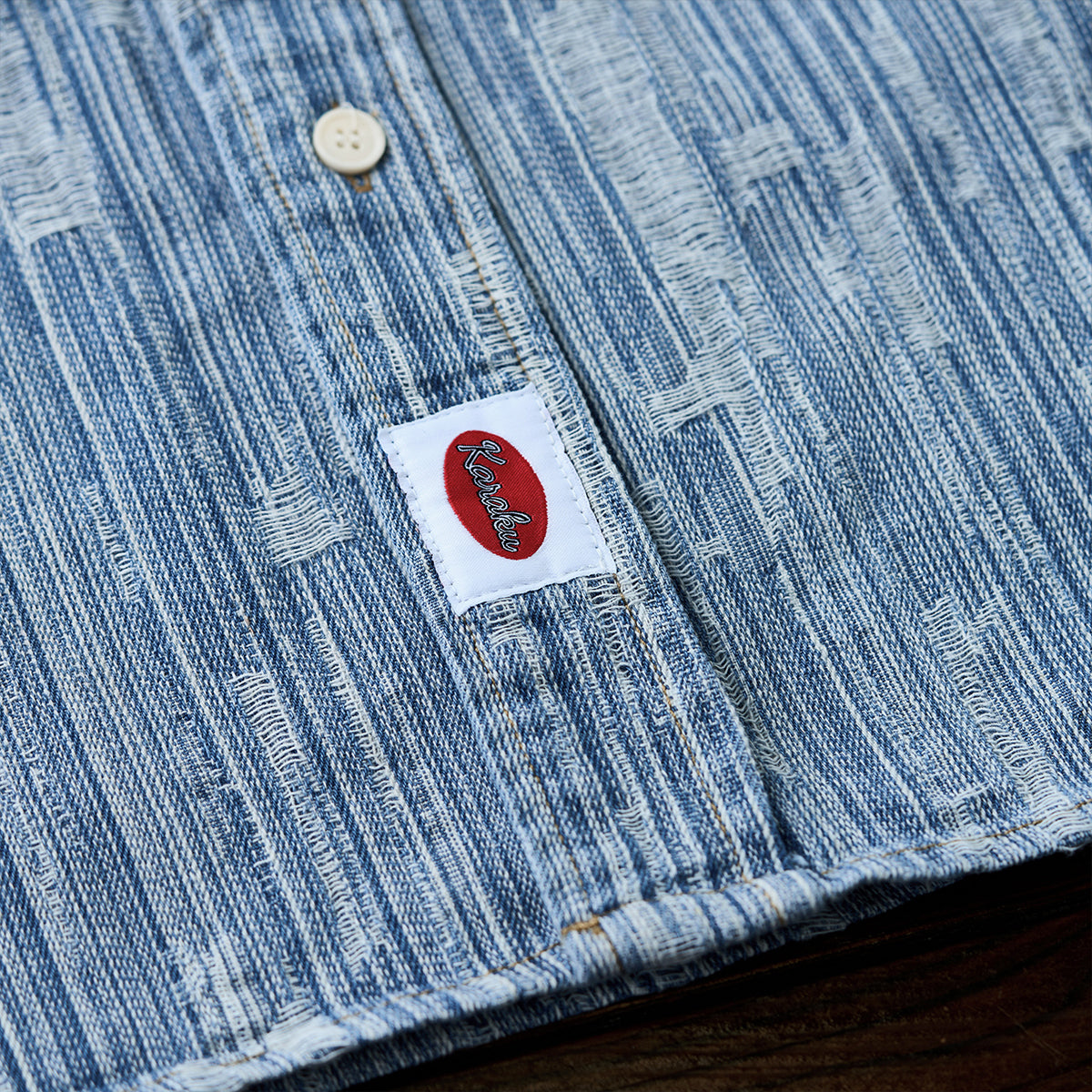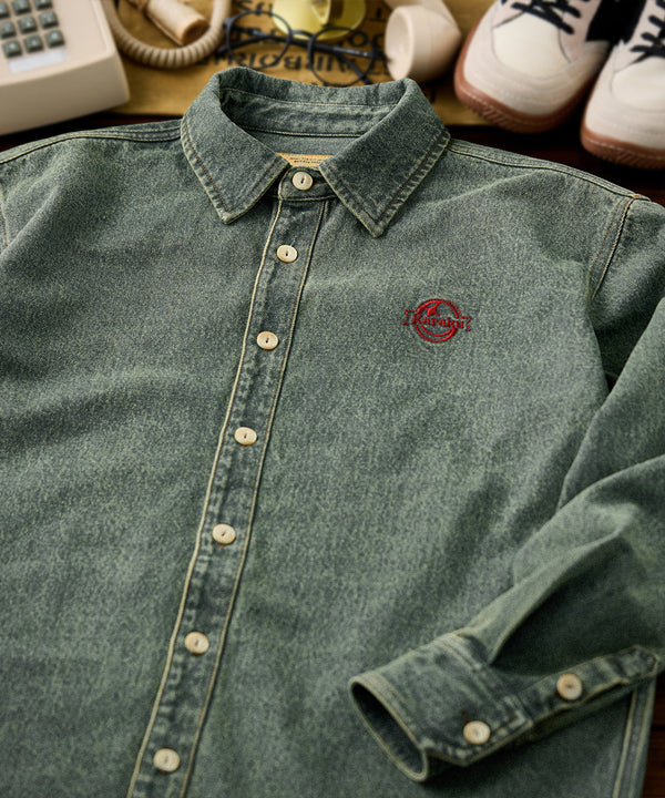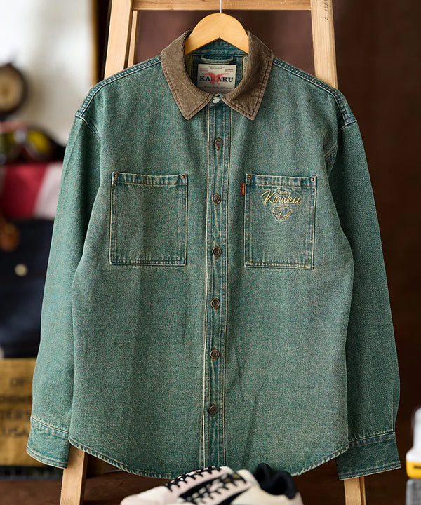 라이트 블루 워시드 데님으로 빈티지하고 캐주얼한 느낌을 살린, 왼쪽 가슴 KARAKU 로고 자수와 원형 로고 마크가 포인트인 긴팔 셔츠.