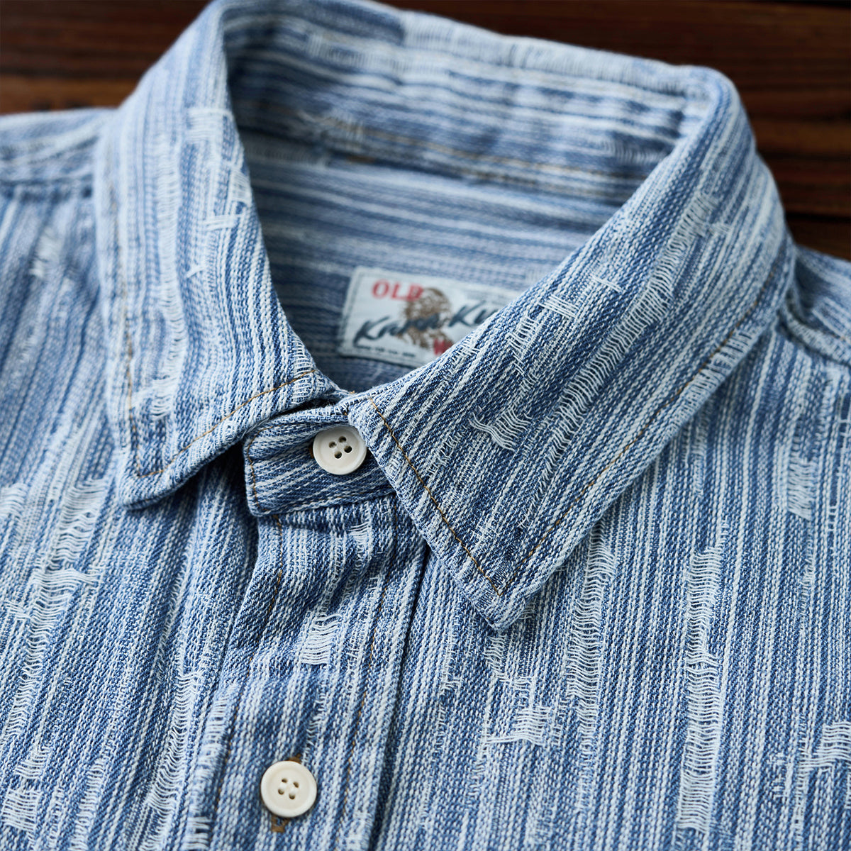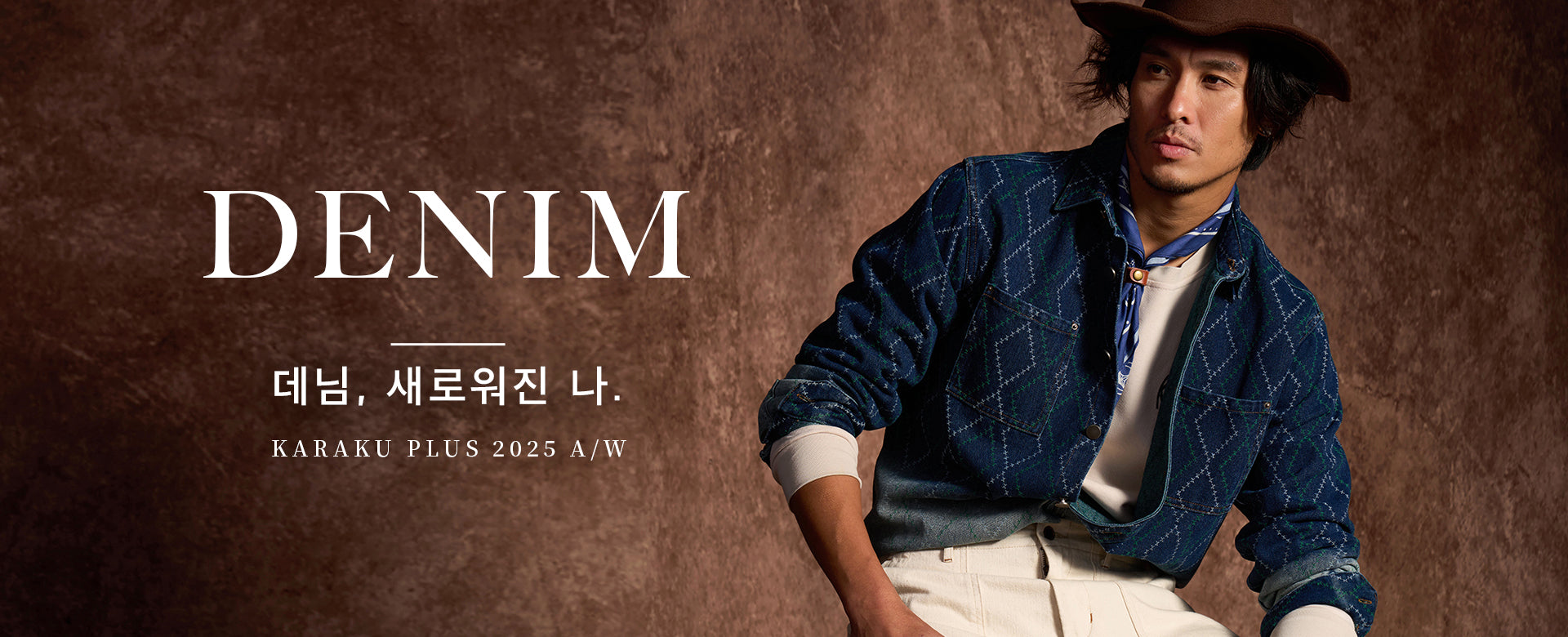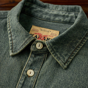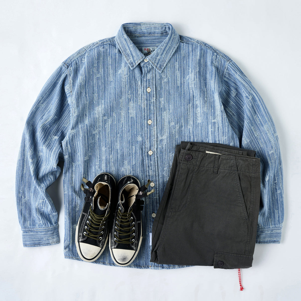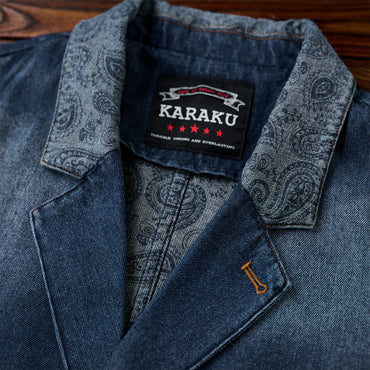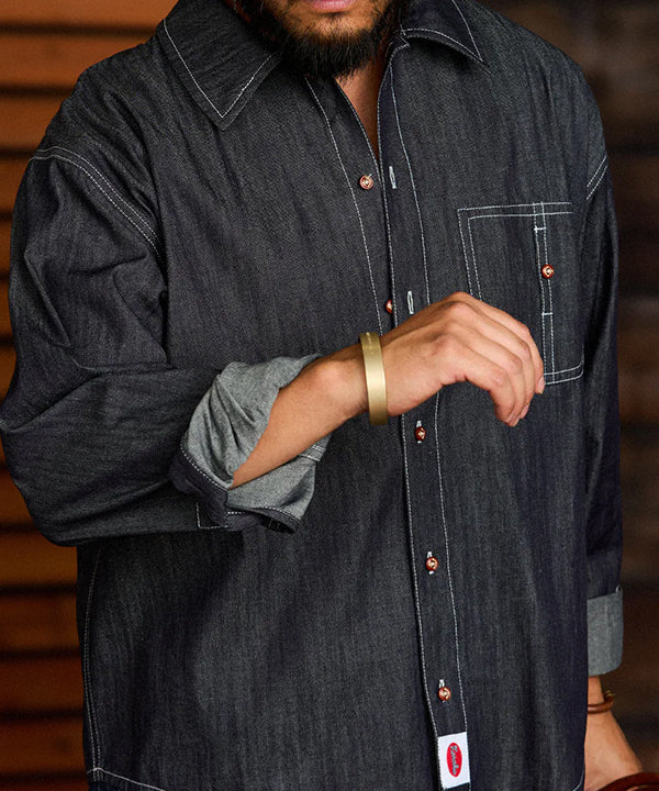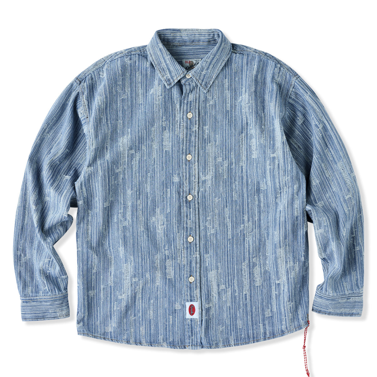 라이트 블루 워시드 데님으로 빈티지하고 캐주얼한 느낌을 살린, 왼쪽 가슴 KARAKU 로고 자수와 원형 로고 마크가 포인트인 긴팔 셔츠.