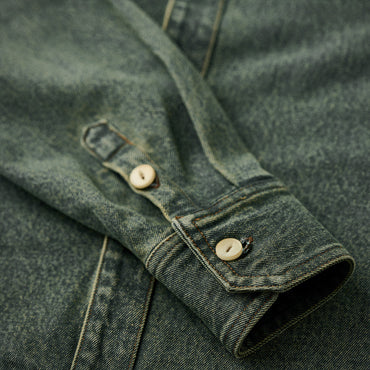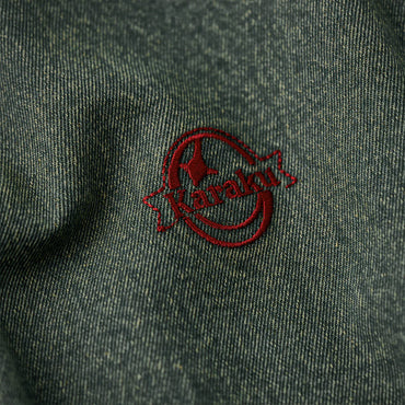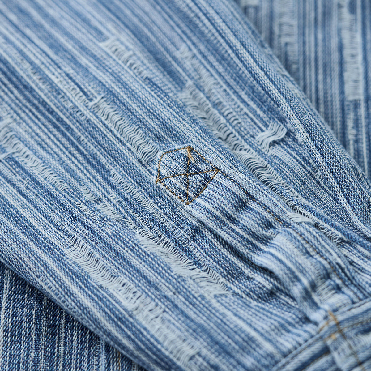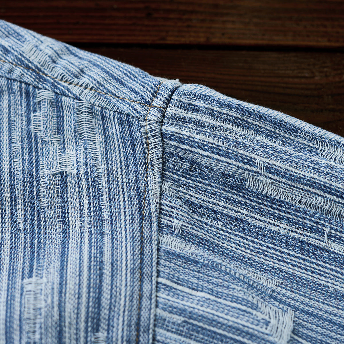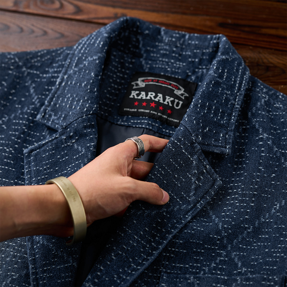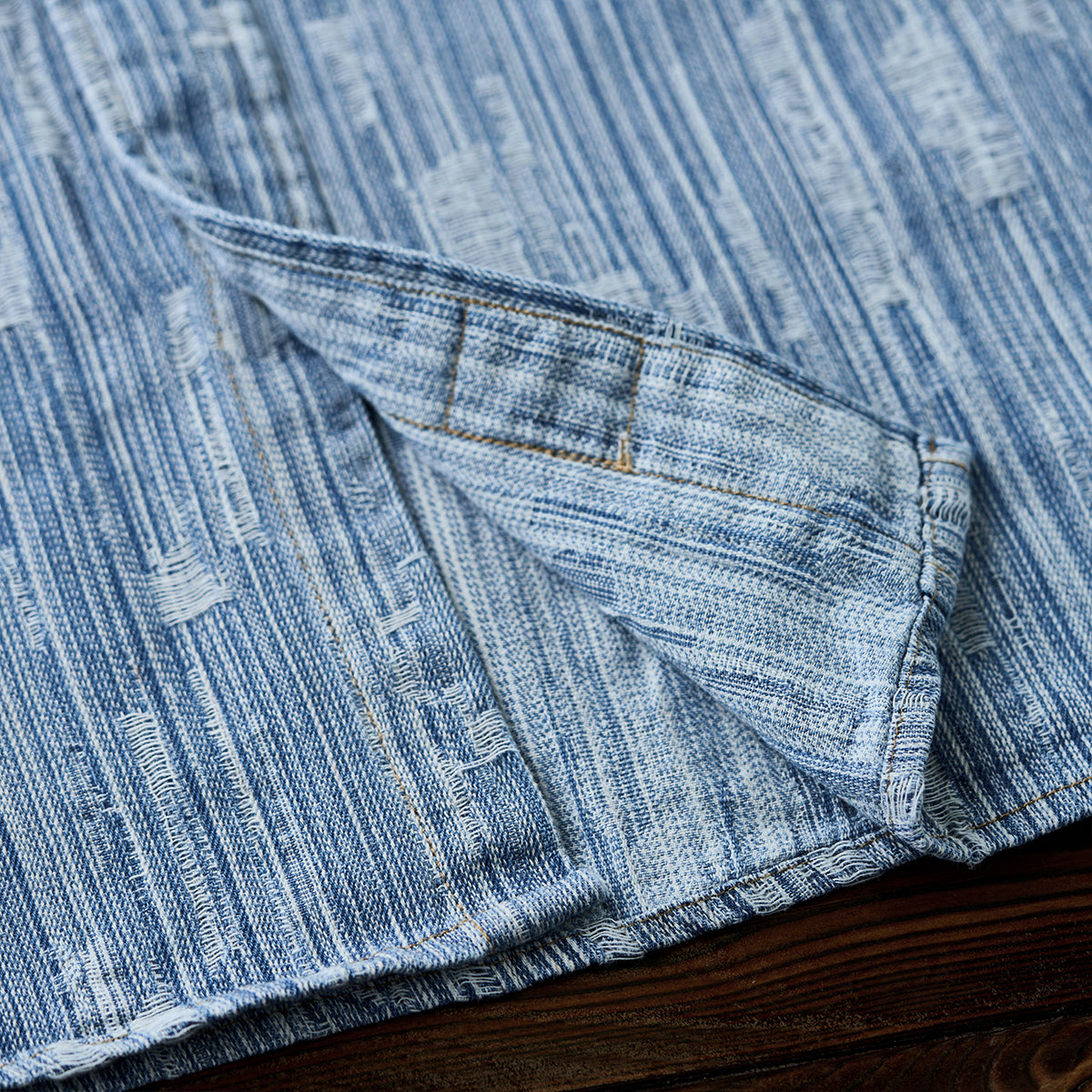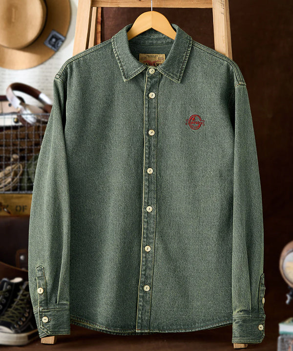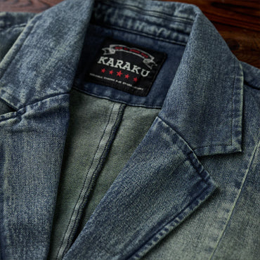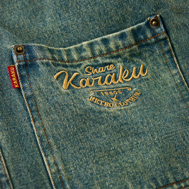 라이트 블루 워시드 데님으로 빈티지하고 캐주얼한 느낌을 살린, 왼쪽 가슴 KARAKU 로고 자수와 원형 로고 마크가 포인트인 긴팔 셔츠.