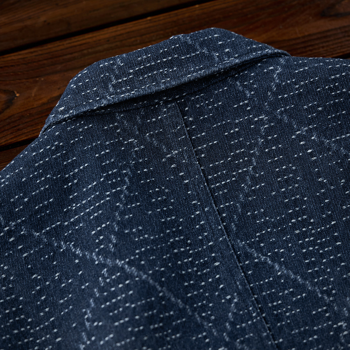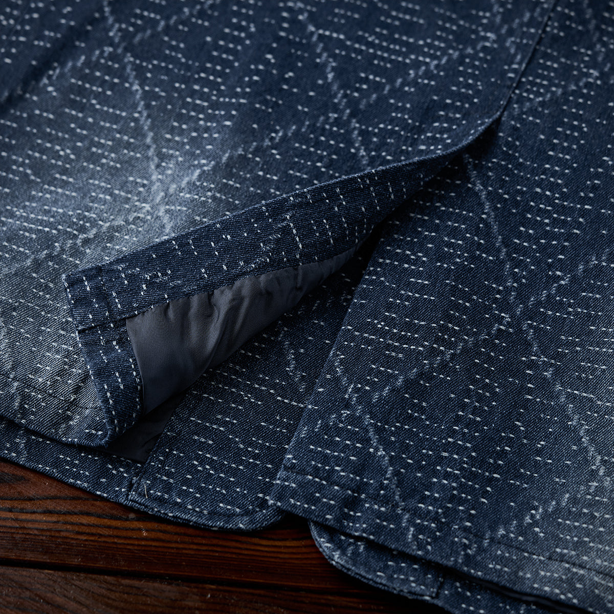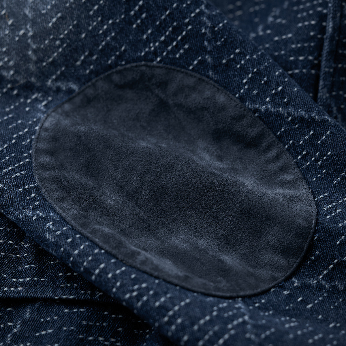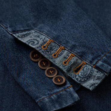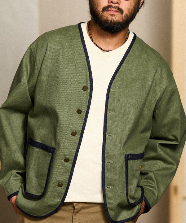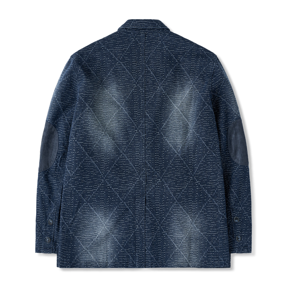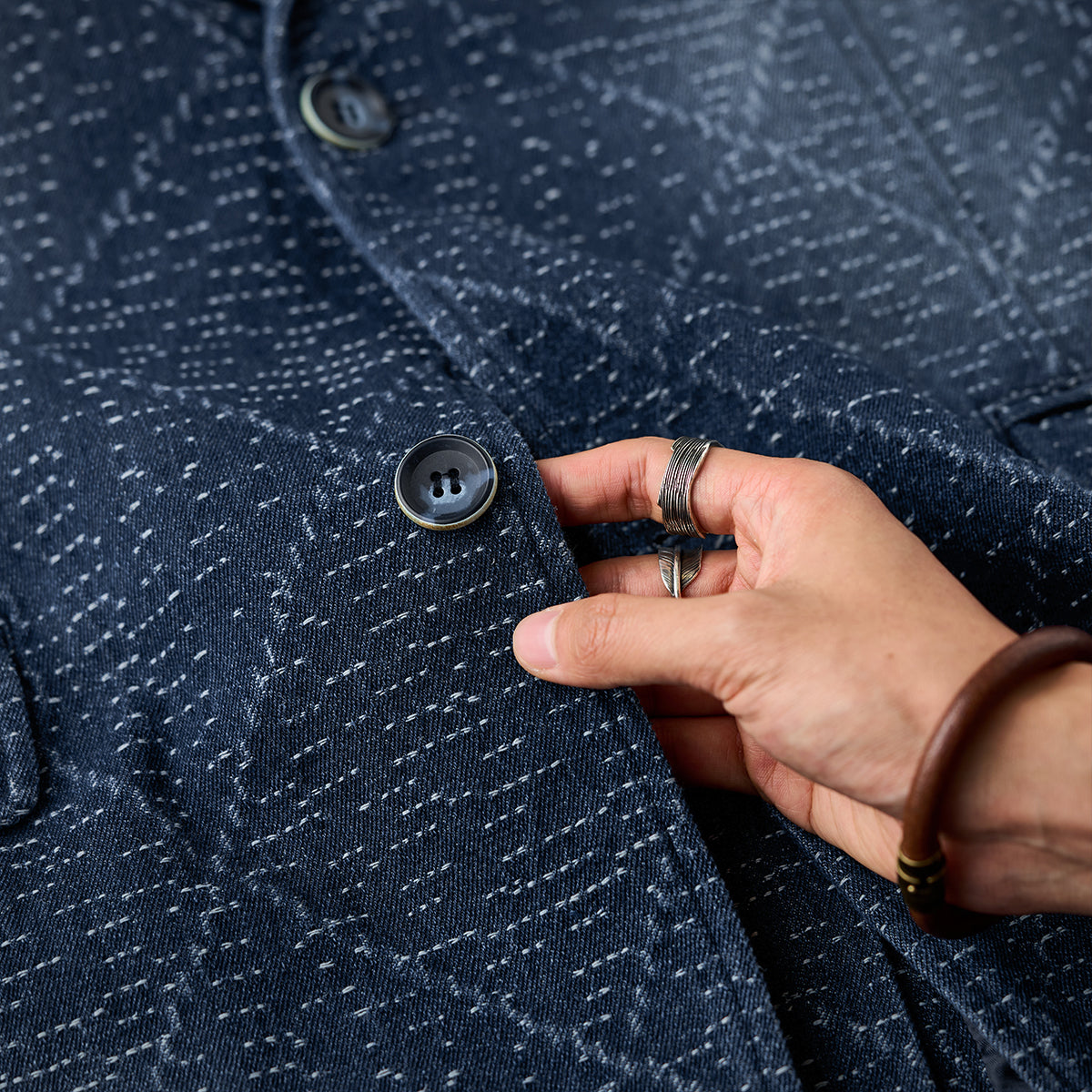 노카라 디자인과 네이비 데님 파이핑으로 모던한 실루엣을 완성했으며, 브라스 단추와 넉넉한 패치 포켓으로 세련된 포인트와 실용성을 더한 자켓입니다.