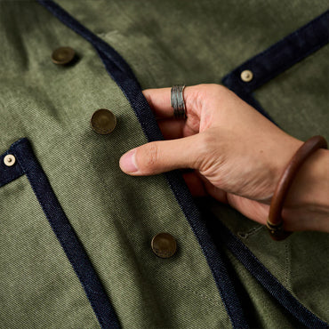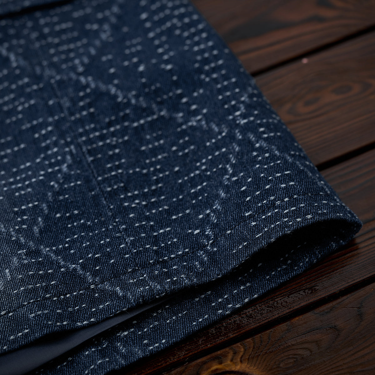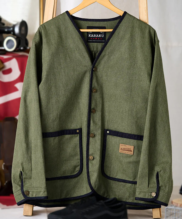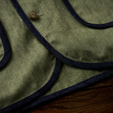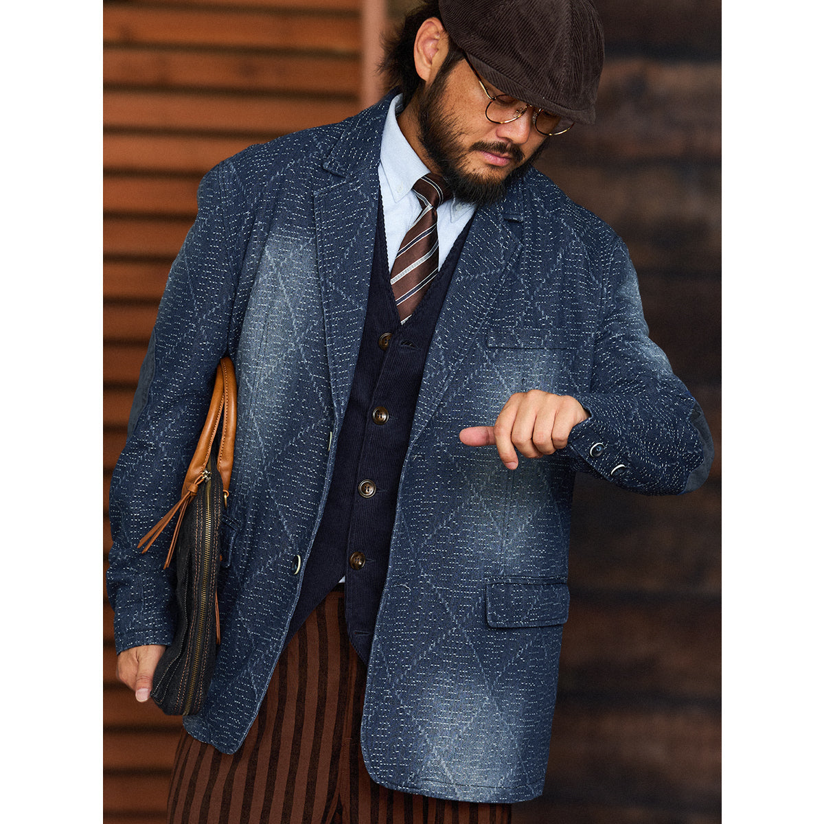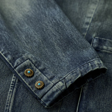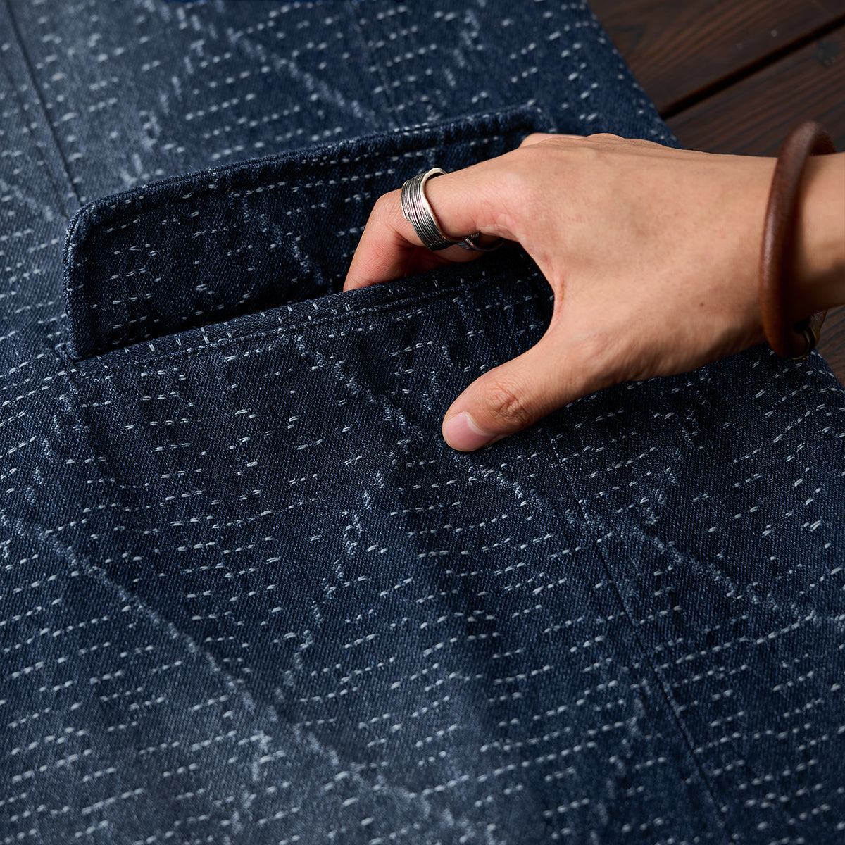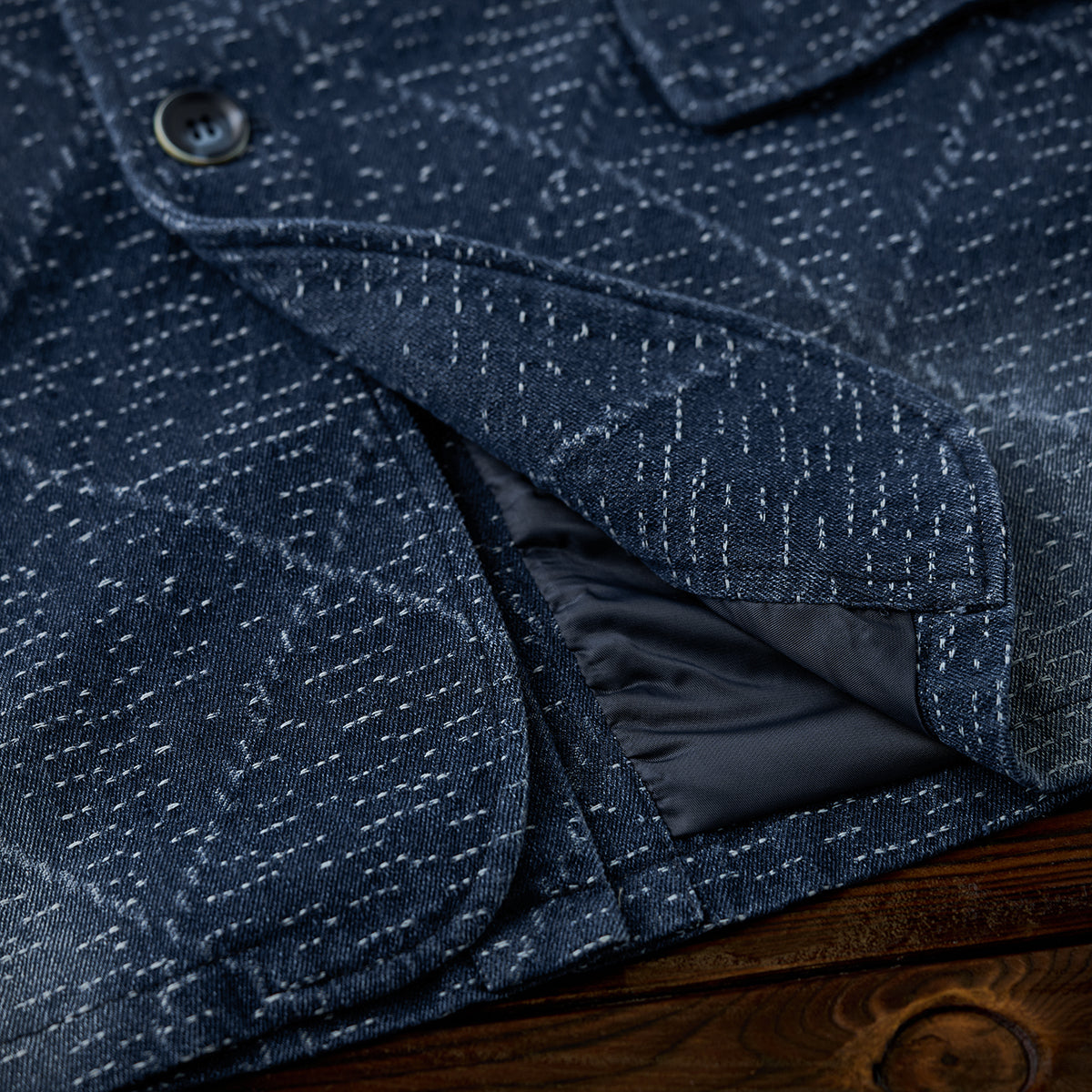 노카라 디자인과 네이비 데님 파이핑으로 모던한 실루엣을 완성했으며, 브라스 단추와 넉넉한 패치 포켓으로 세련된 포인트와 실용성을 더한 자켓입니다.