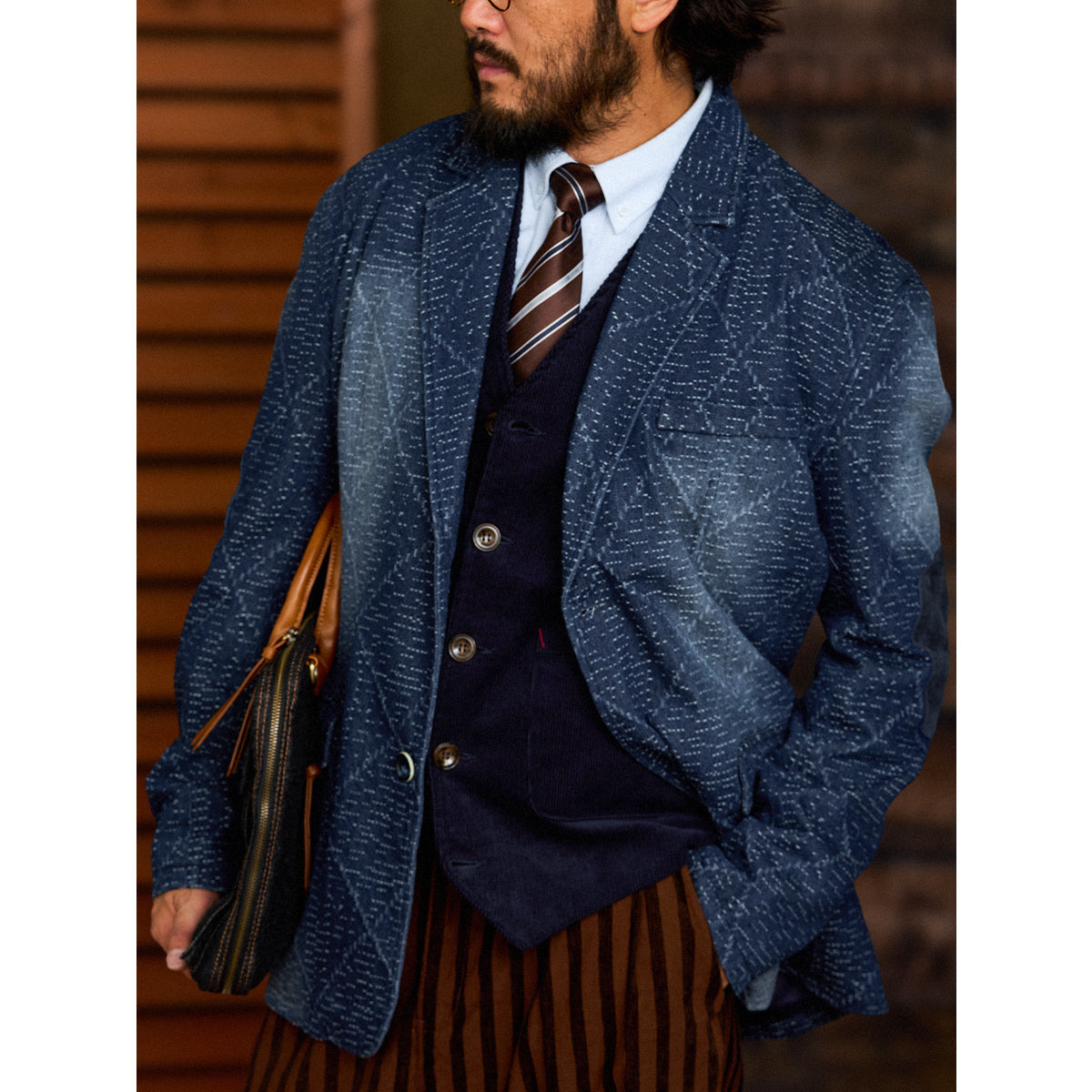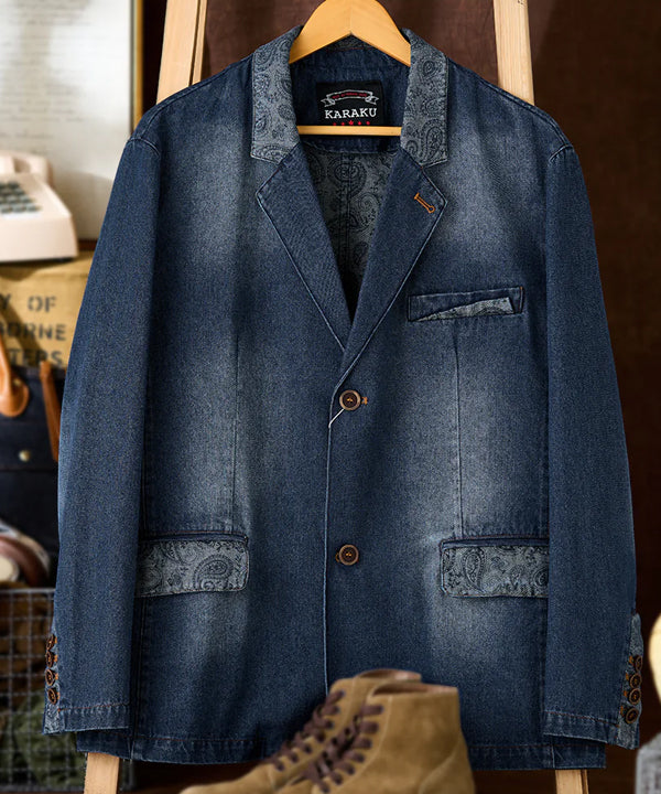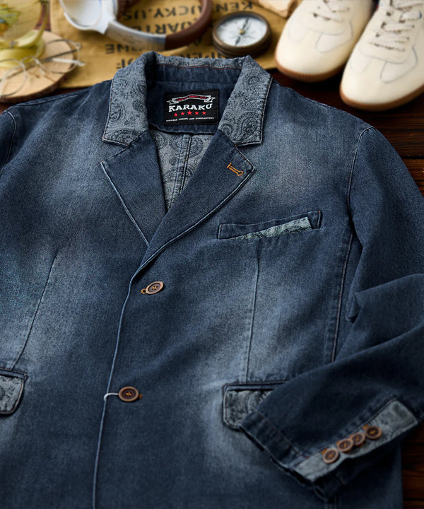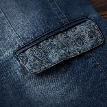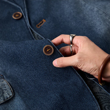 몽키 워싱 가공으로 멋스러운 그라데이션과 색감을 살리고, 페이즐리 패턴과 테일러드 실루엣으로 고급스러운 분위기를 더한 데님 자켓입니다.