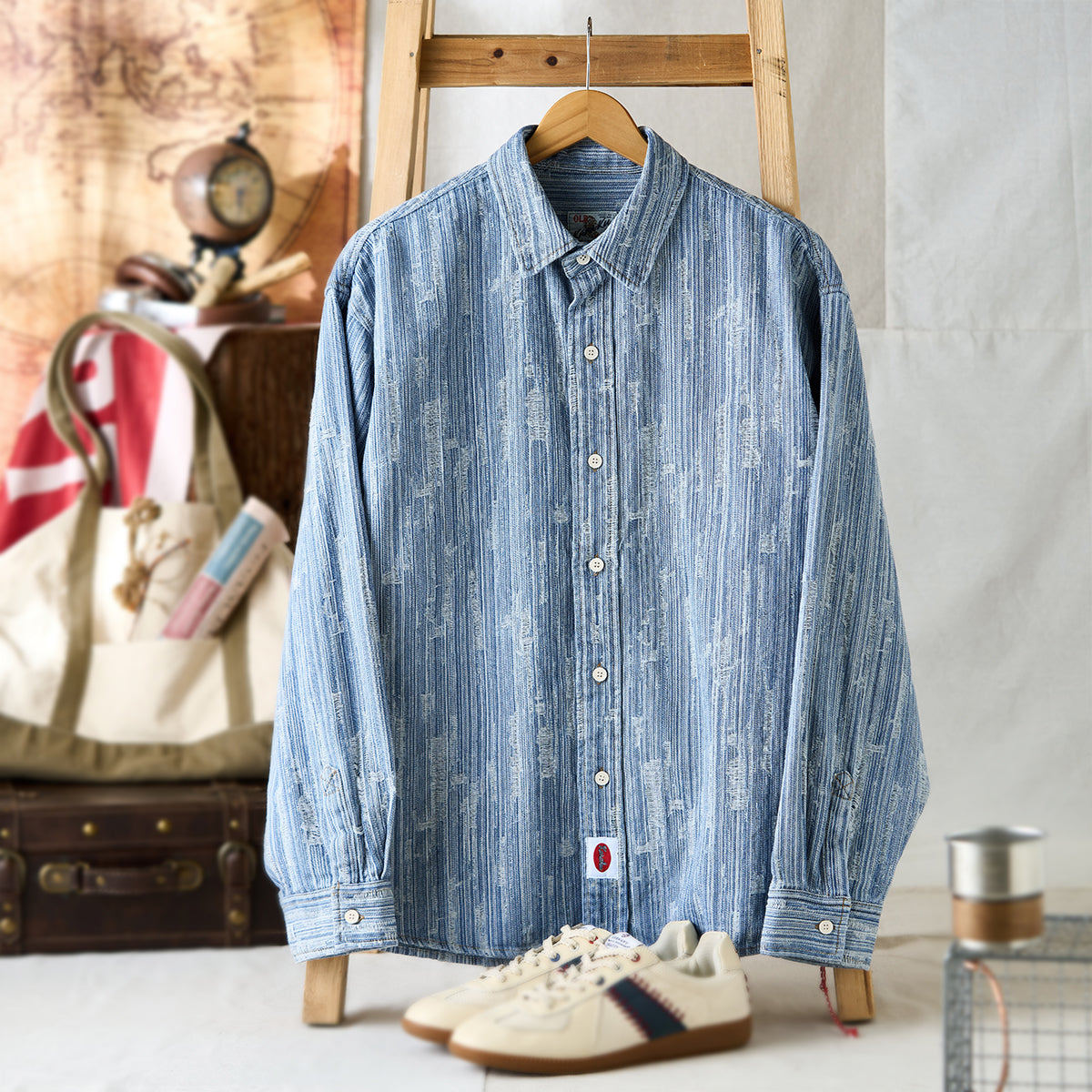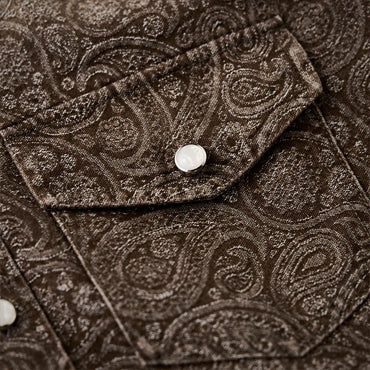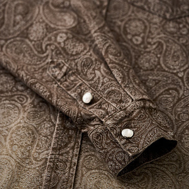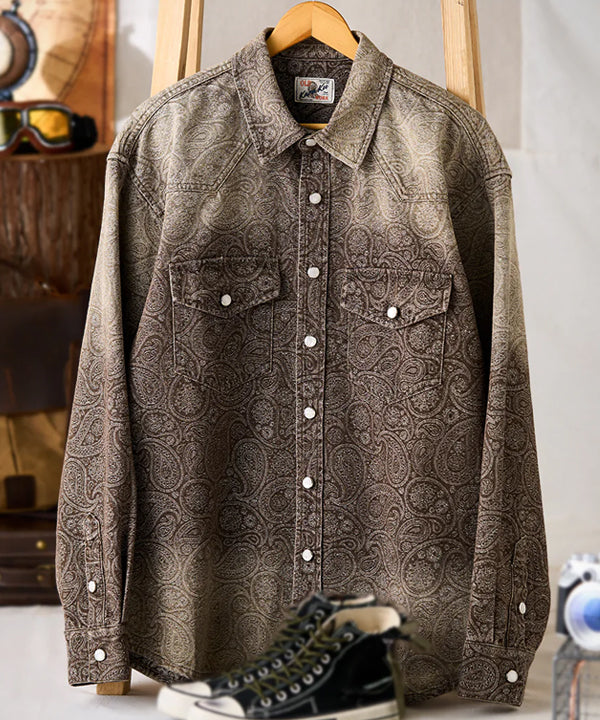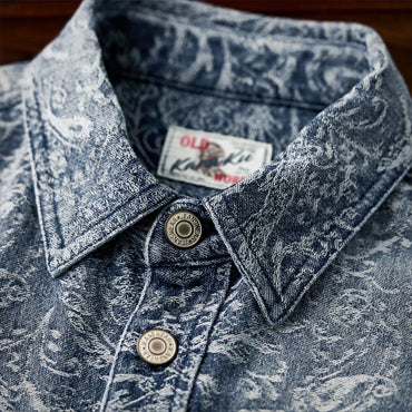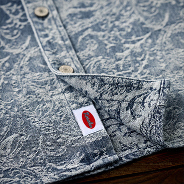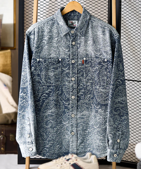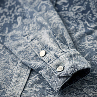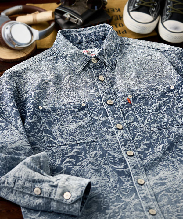 클래식 페이즐리 자카드 직조 데님 셔츠로, 진주 단추가 고급스러운 포인트이며 그라데이션으로 입체감을 살렸습니다. 단독 착용은 물론 자켓처럼 걸쳐 입기 좋은 만능 아이템입니다.