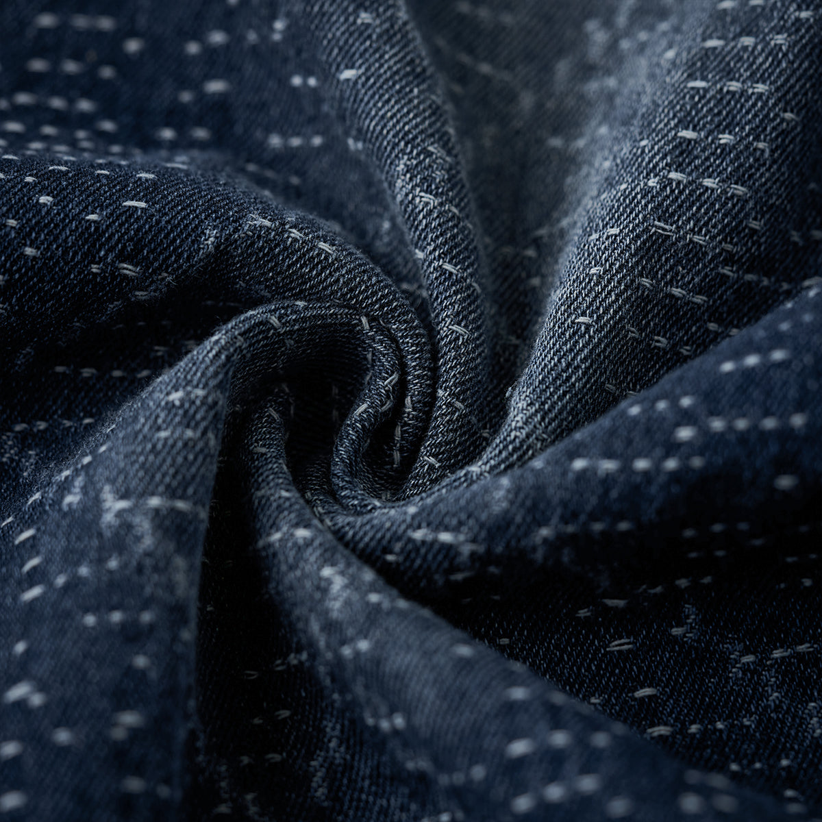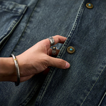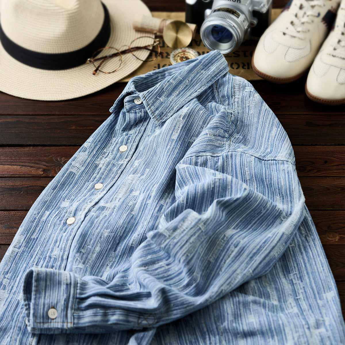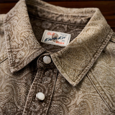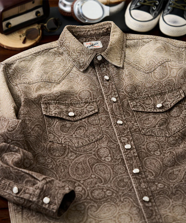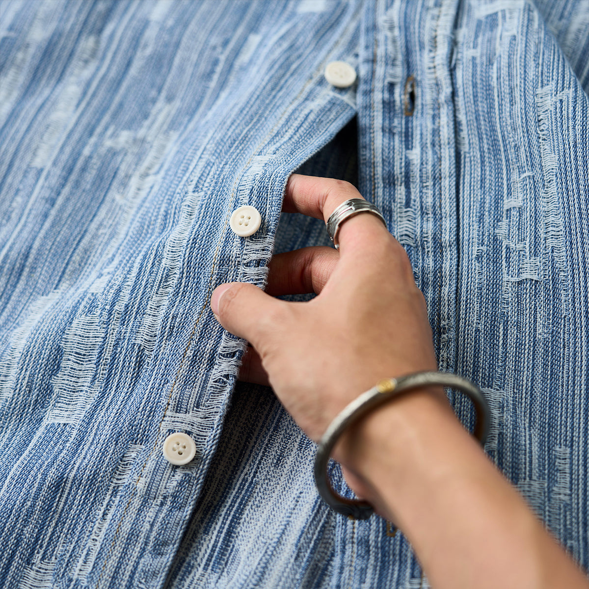클래식 페이즐리 자카드 직조 데님 셔츠로, 진주 단추가 고급스러운 포인트이며 그라데이션으로 입체감을 살렸습니다. 단독 착용은 물론 자켓처럼 걸쳐 입기 좋은 만능 아이템입니다.