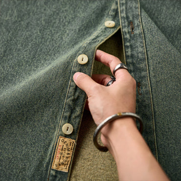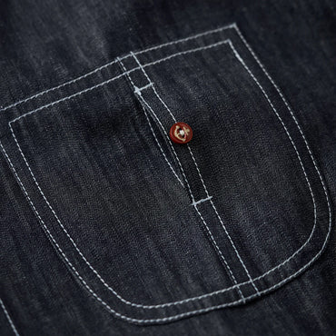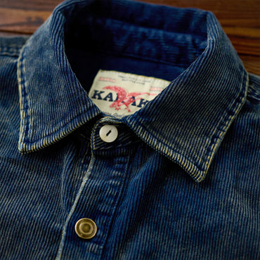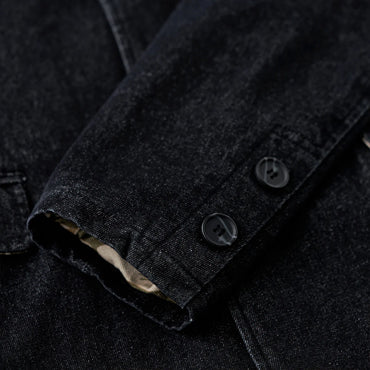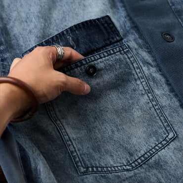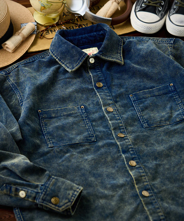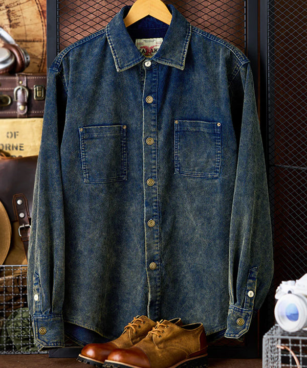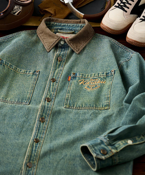코듀로이 배색 칼라와 레트로 프린트 포켓이 특징인 데님 워크 셔츠로, 클래식과 현대적 감각을 동시에 살린 스타일리시한 아이템입니다.