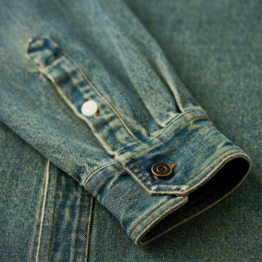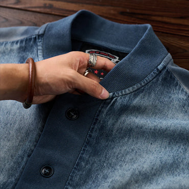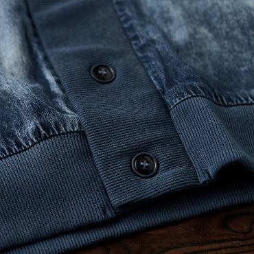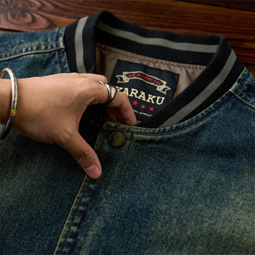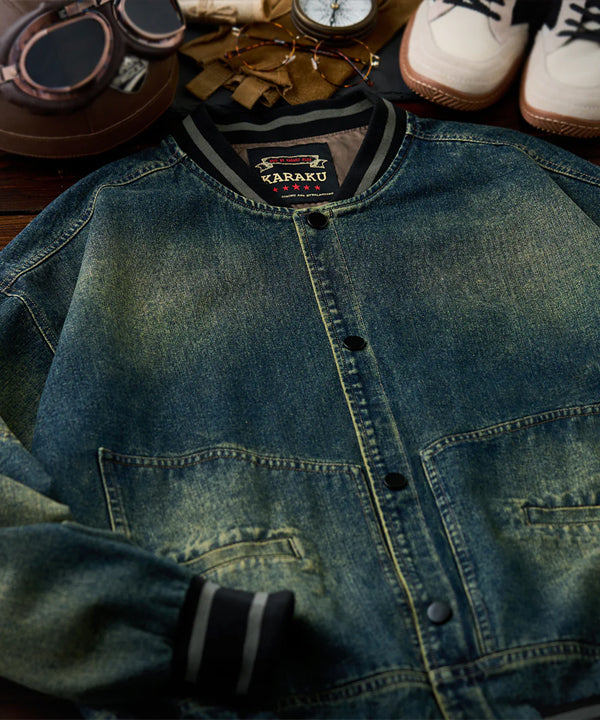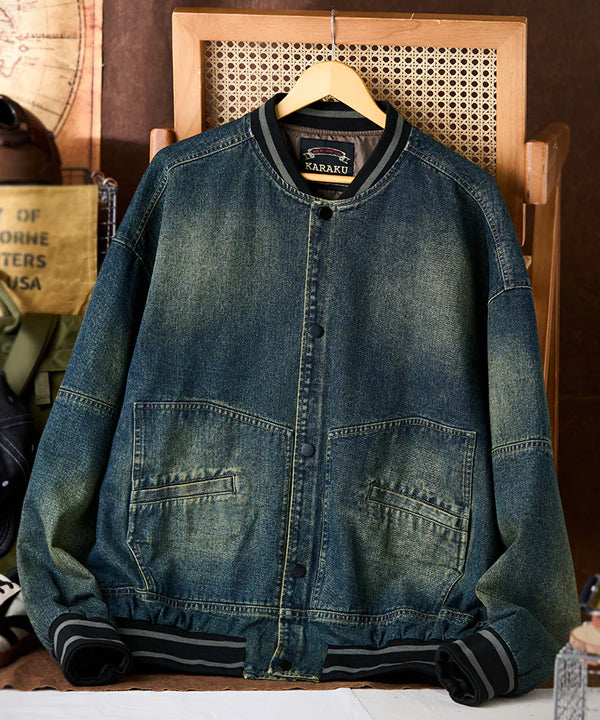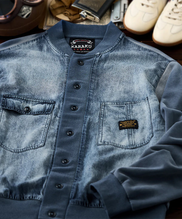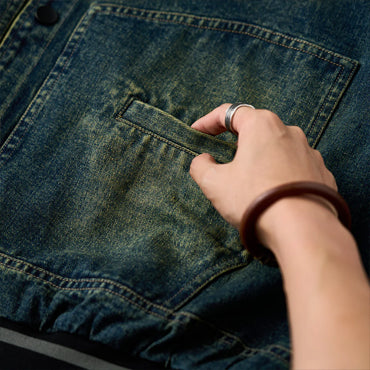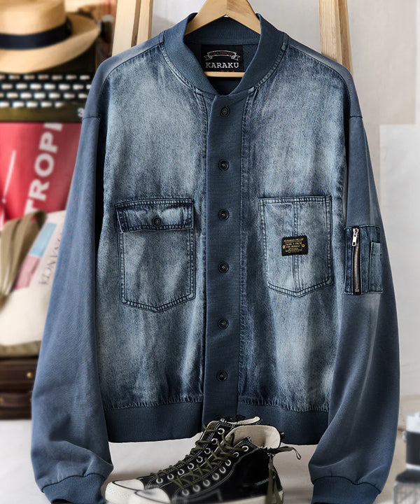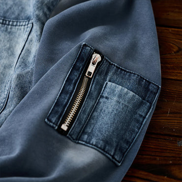 페이드 가공 데님과 스웨트 소매, MA-1 포켓과 비대칭 포켓이 조화를 이루는 빈티지 무드 자켓. 리브 디테일로 핏감과 보온성을 강화한 실용적 아이템.