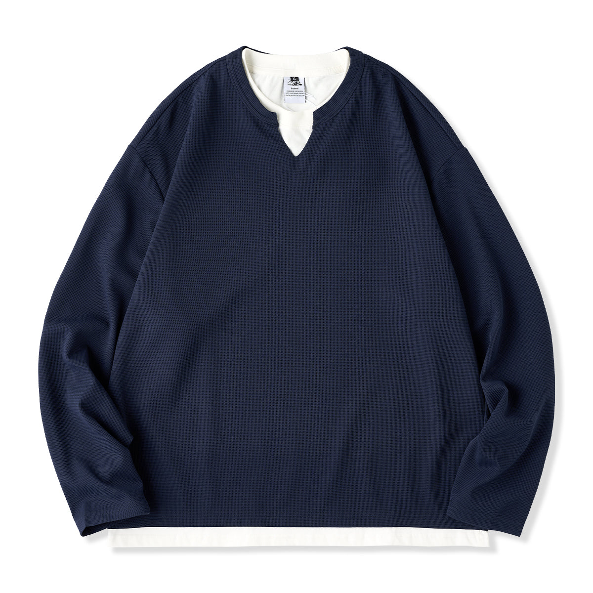 얕은 V넥과 이너 셔츠를 겹쳐 입은 듯한 디자인의 와플 롱슬리브 스웨트. 여유 있는 실루엣과 부드러운 촉감으로 편안하게 착용할 수 있습니다.