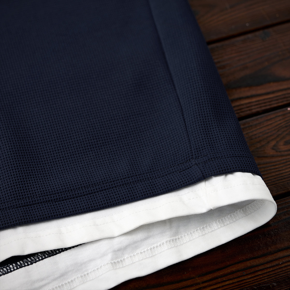 목 부분에 얕은 V자 컷으로 포인트를 주고, 목과 밑단에는 이너 셔츠를 겹쳐 입은 듯한 디자인을 적용했습니다.