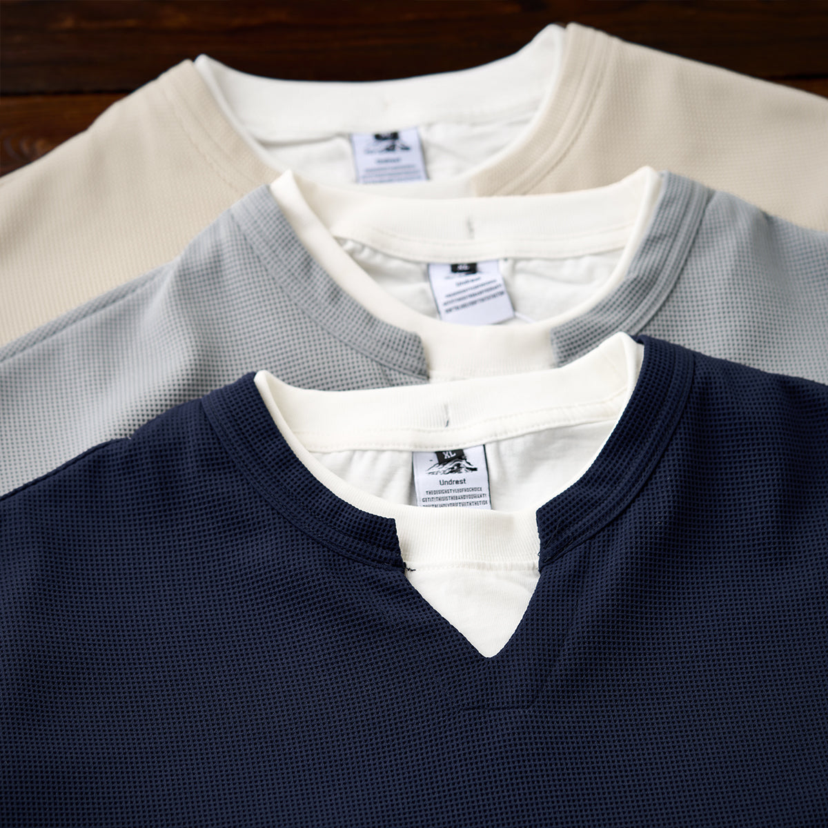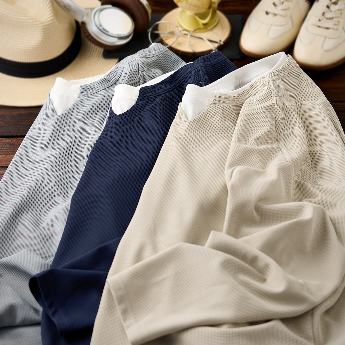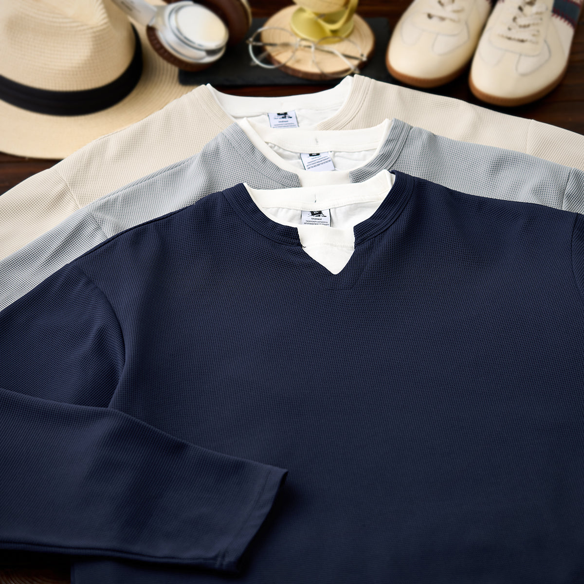 미세한 요철의 와플 조직 원단으로 통기성과 부드러운 촉감이 뛰어나 봄·가을·겨울에도 편안하게 착용 가능합니다.
