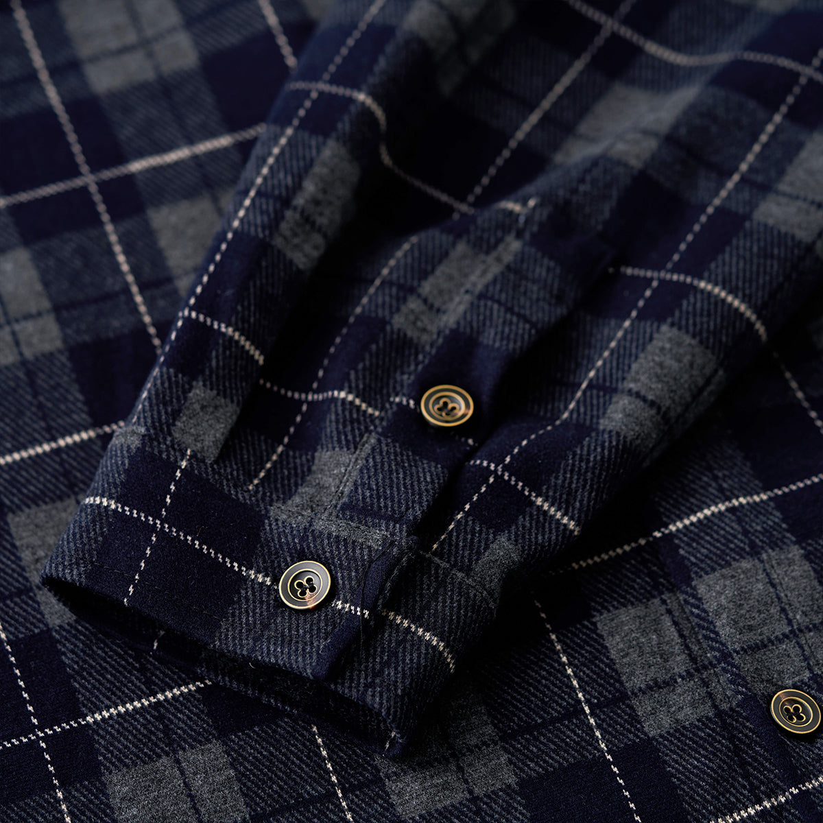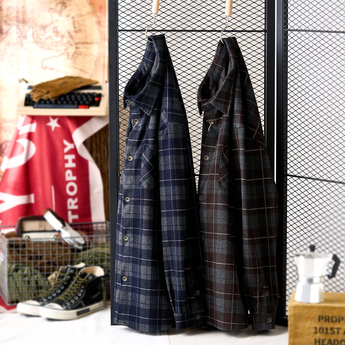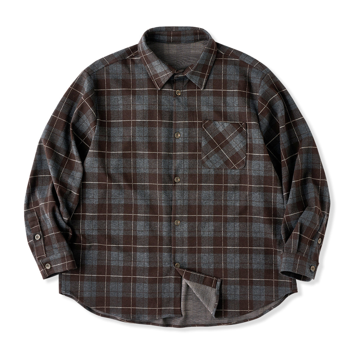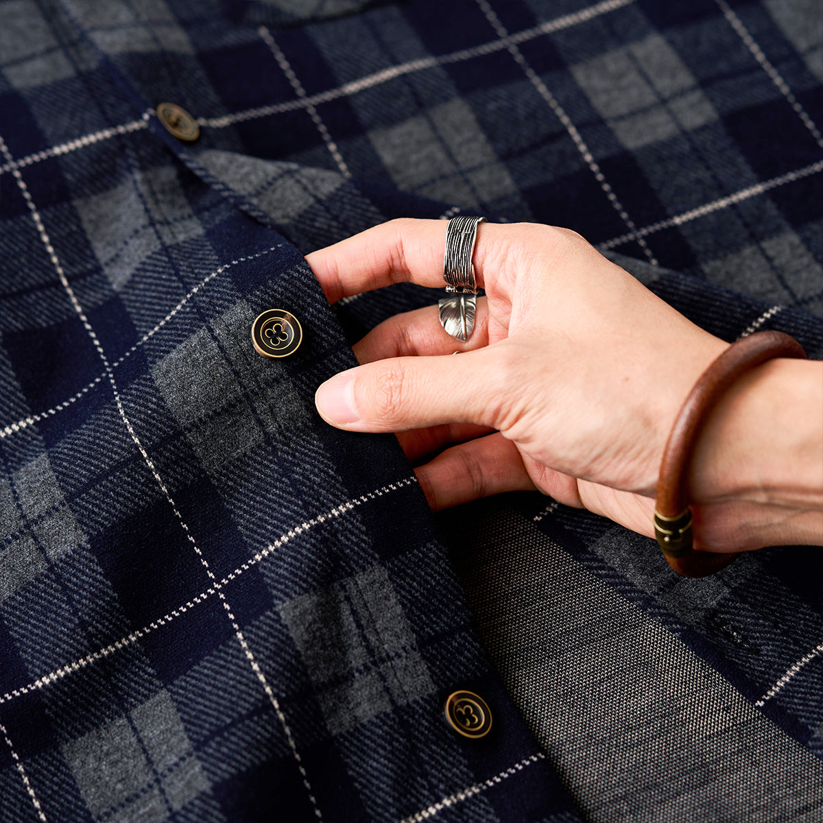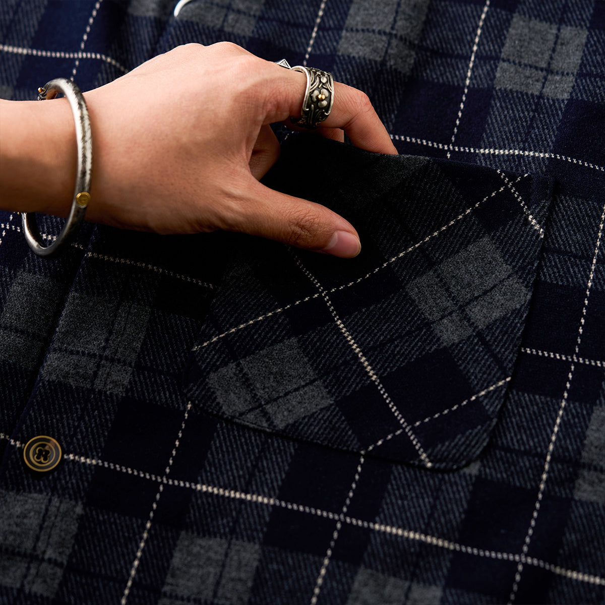 균형 잡힌 체크 패턴과 대각선 포켓 디테일로 입체감을 살리고, 나무 결 버튼과 미세 기모 가공으로 따뜻하고 고급스러운 착용감을 제공하는 셔츠입니다.