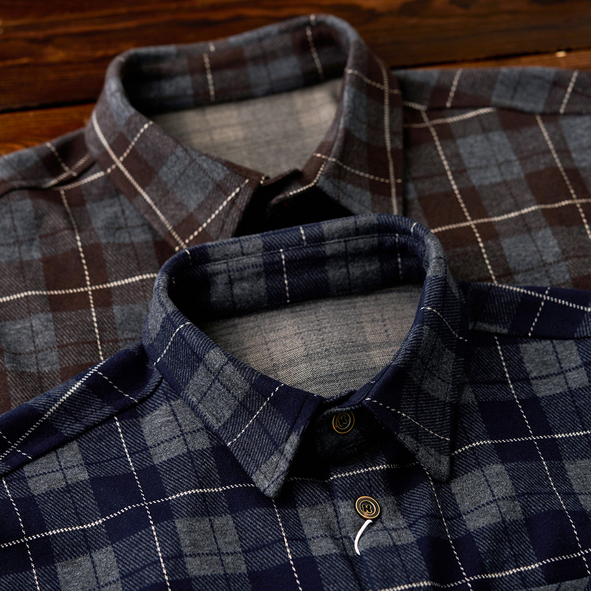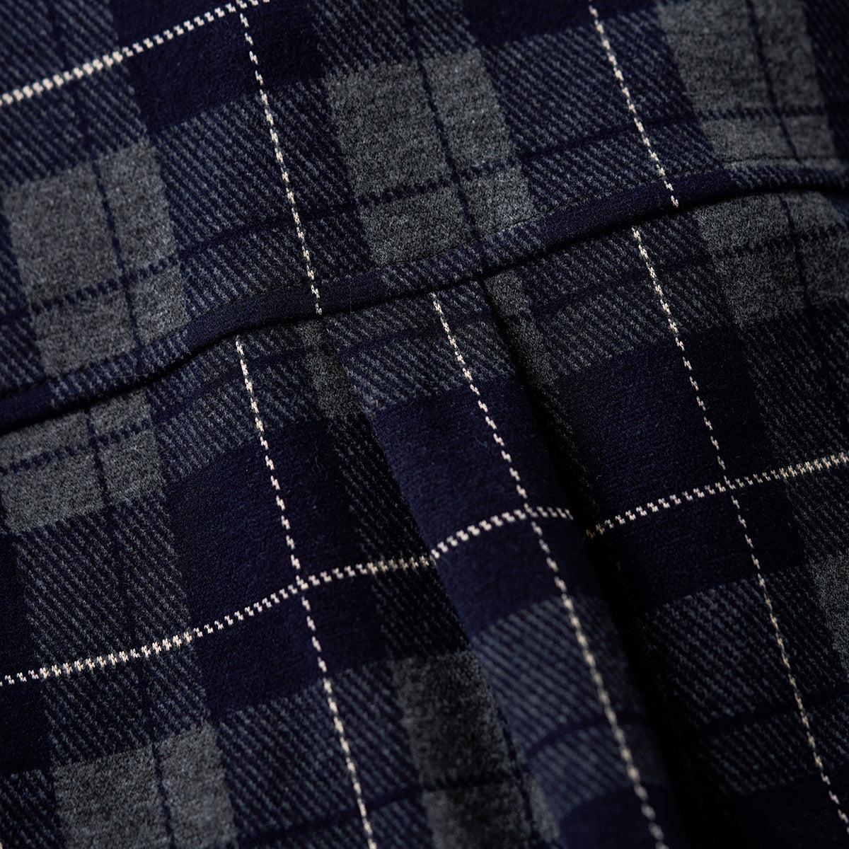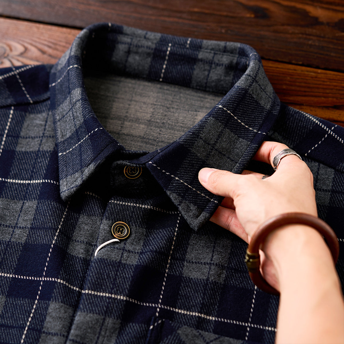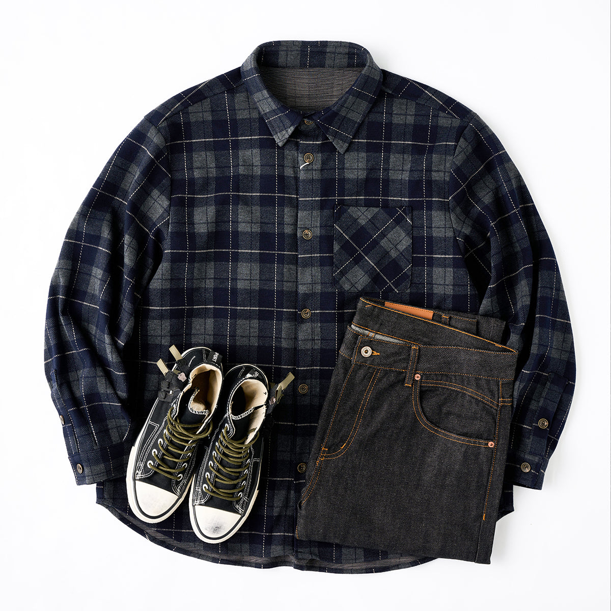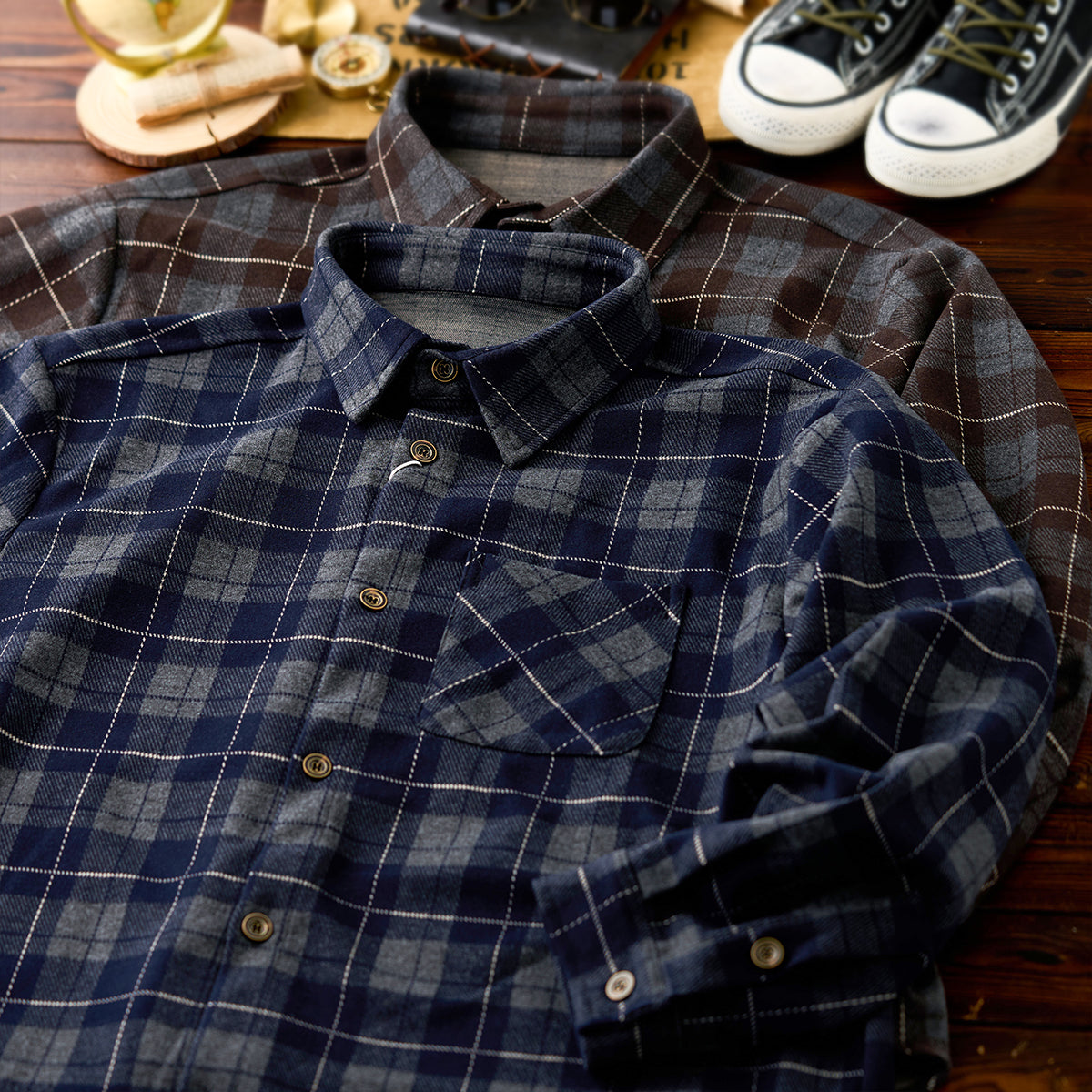 균형 잡힌 체크 패턴과 대각선 포켓 디테일로 입체감을 살리고, 나무 결 버튼과 미세 기모 가공으로 따뜻하고 고급스러운 착용감을 제공하는 셔츠입니다.