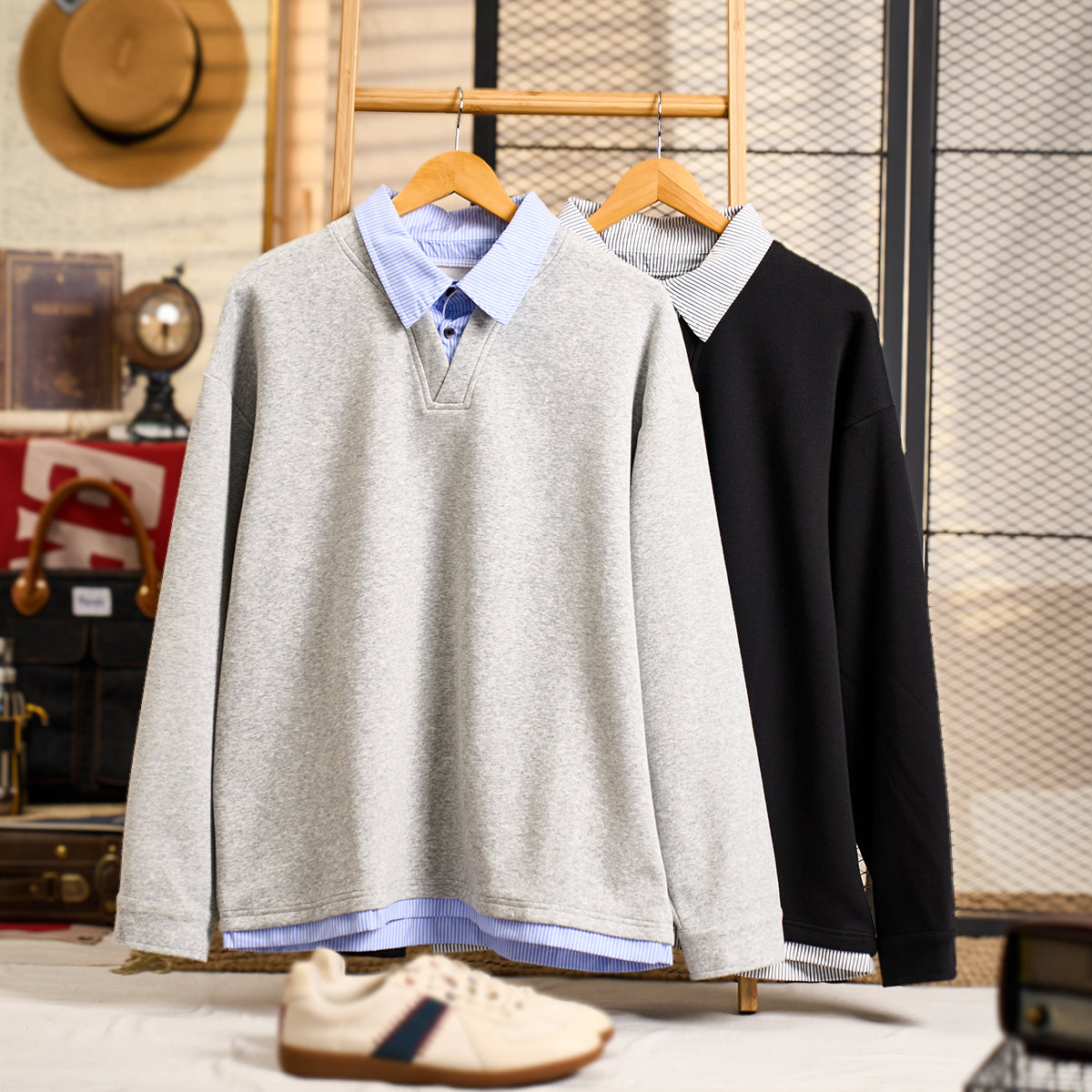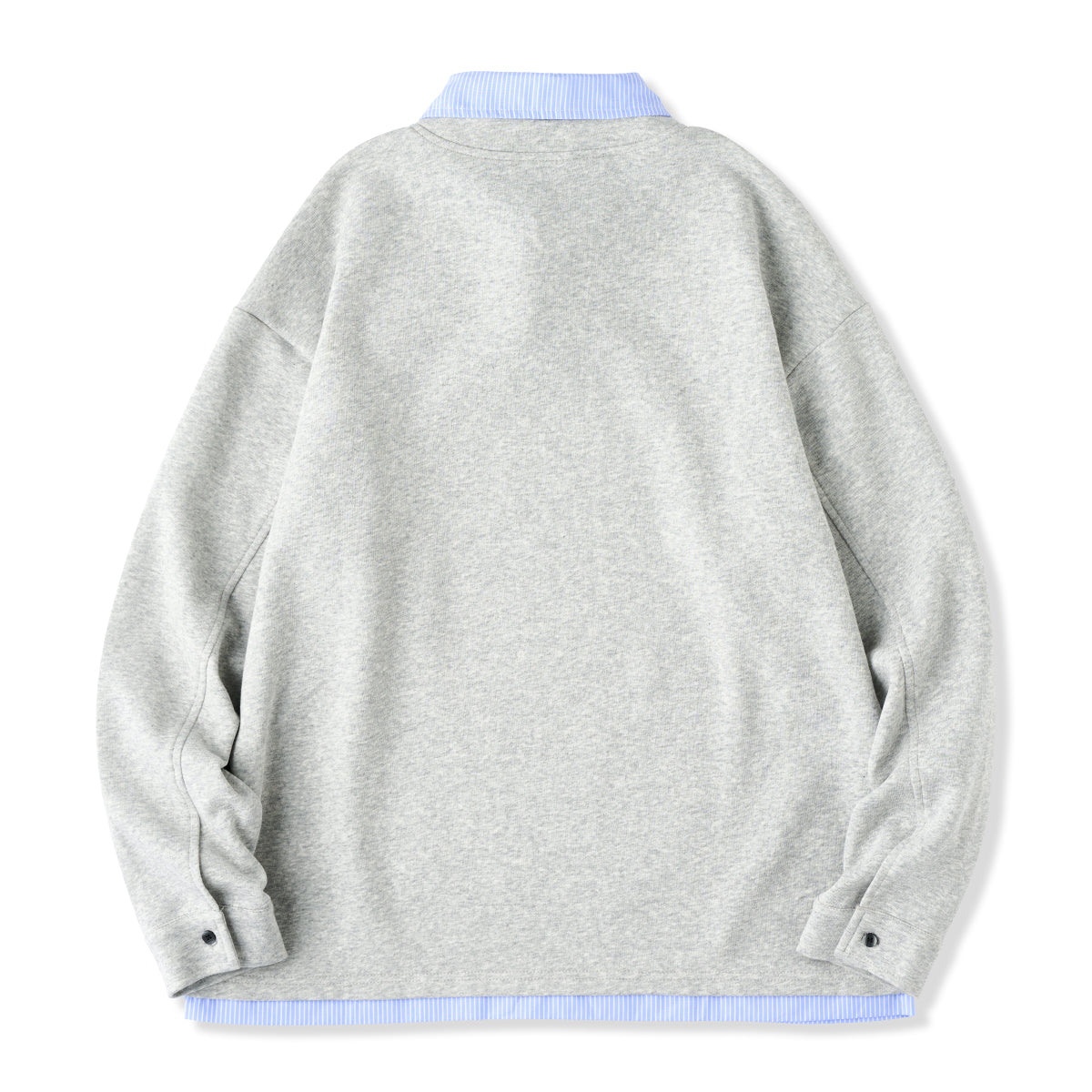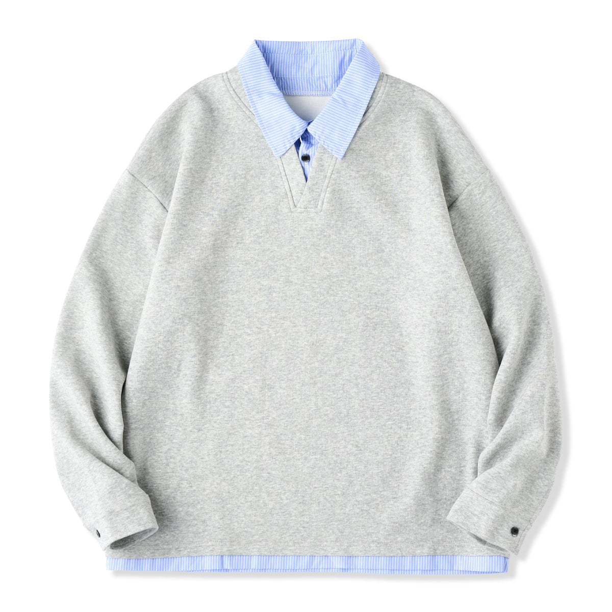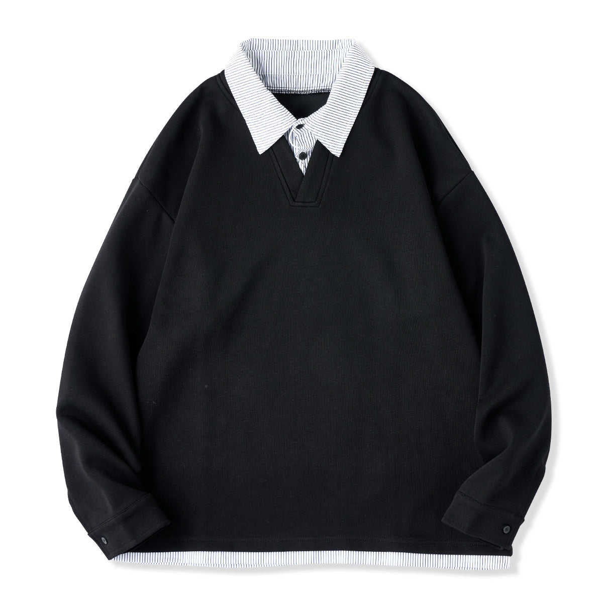 셔츠 칼라와 밑단 스트라이프가 단색 스웨트와 일체형으로, 캐주얼과 포멀이 조화된 간편 페이크 레이어드 아이템.