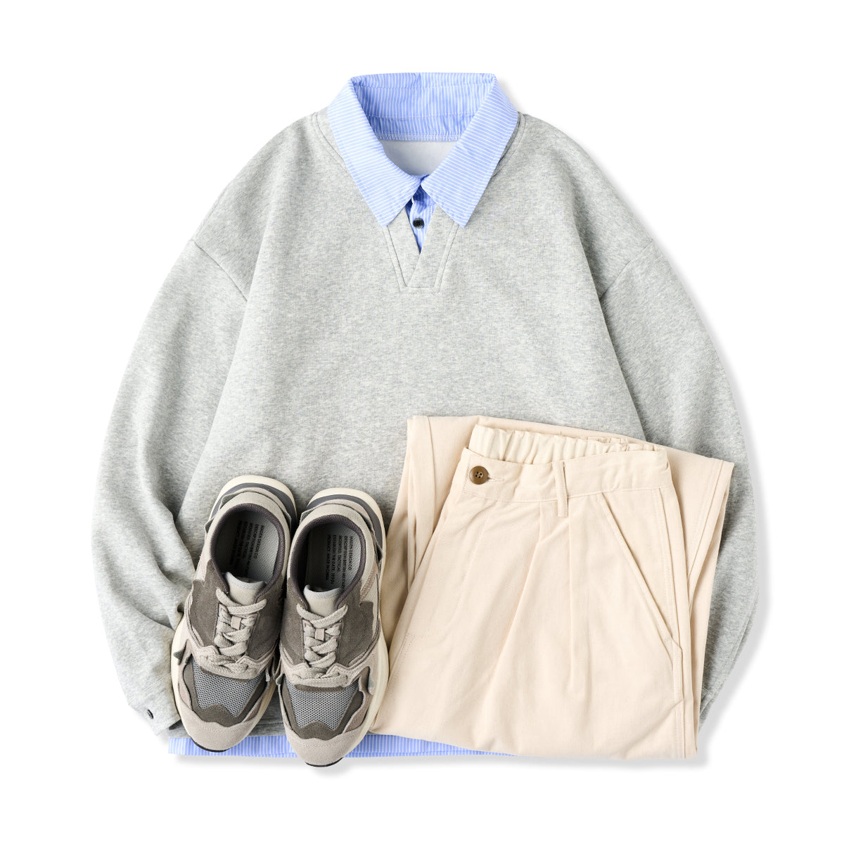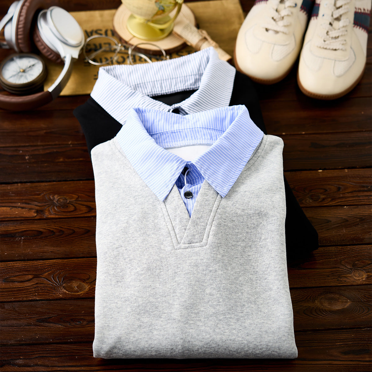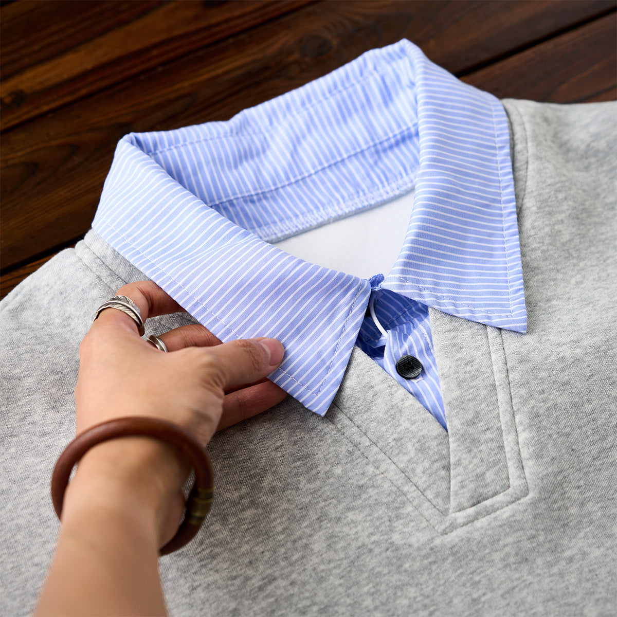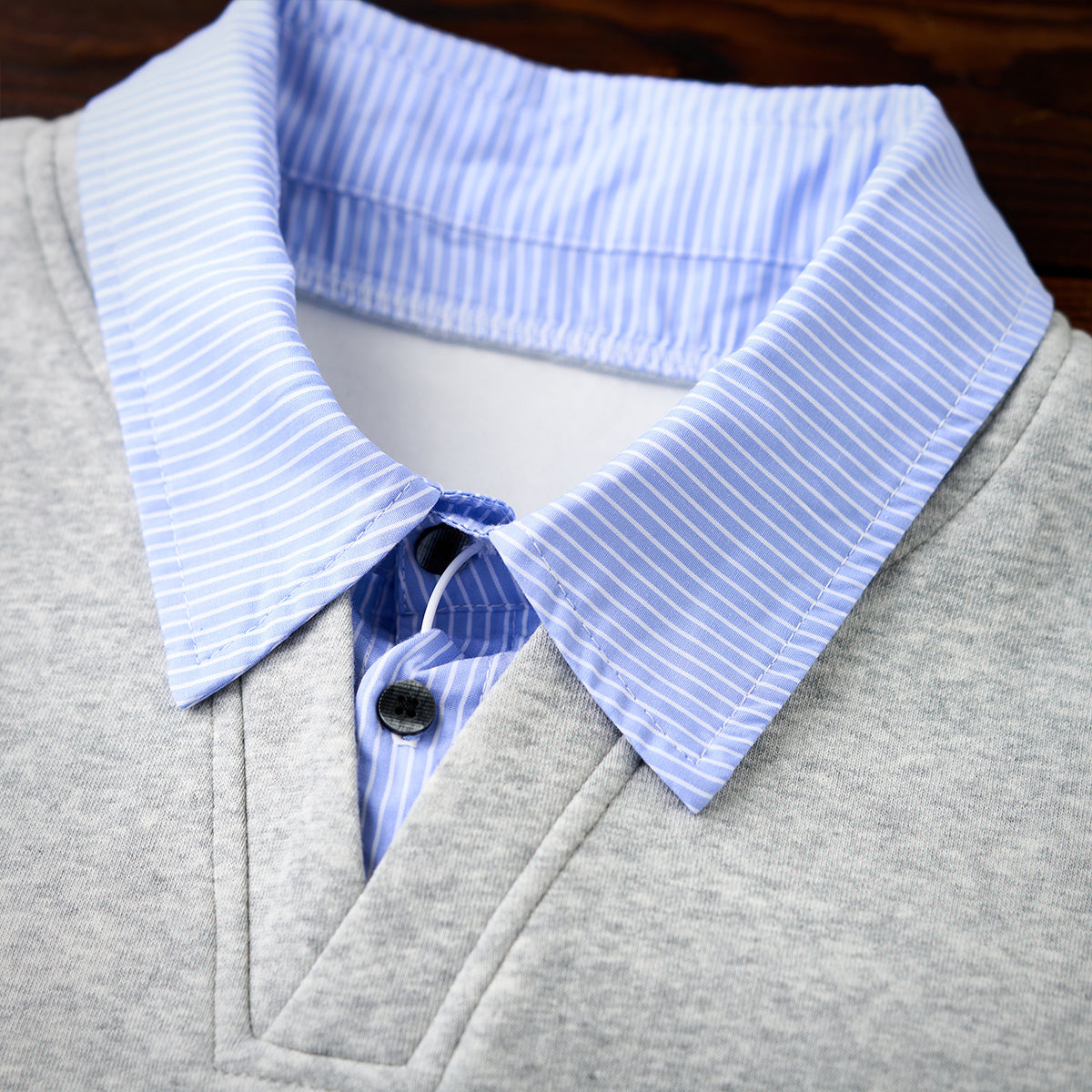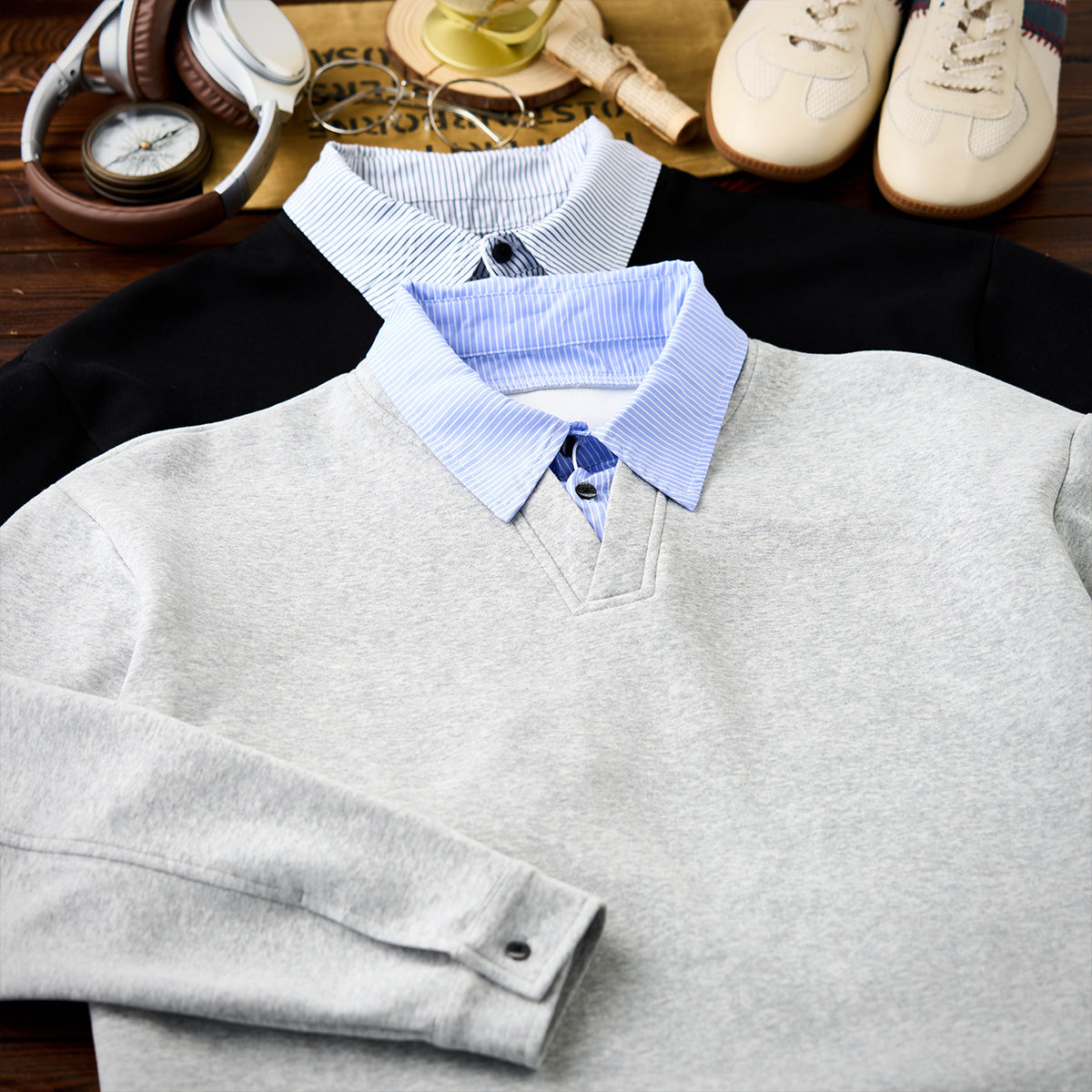 셔츠 칼라와 밑단 스트라이프가 단색 스웨트와 일체형으로, 캐주얼과 포멀이 조화된 간편 페이크 레이어드 아이템.