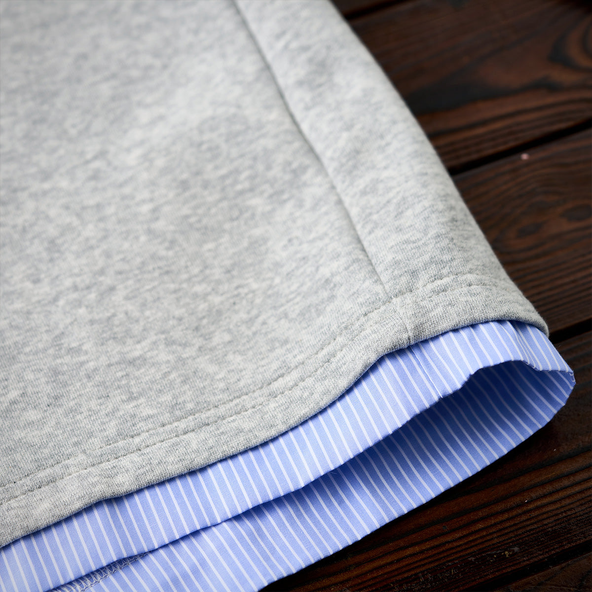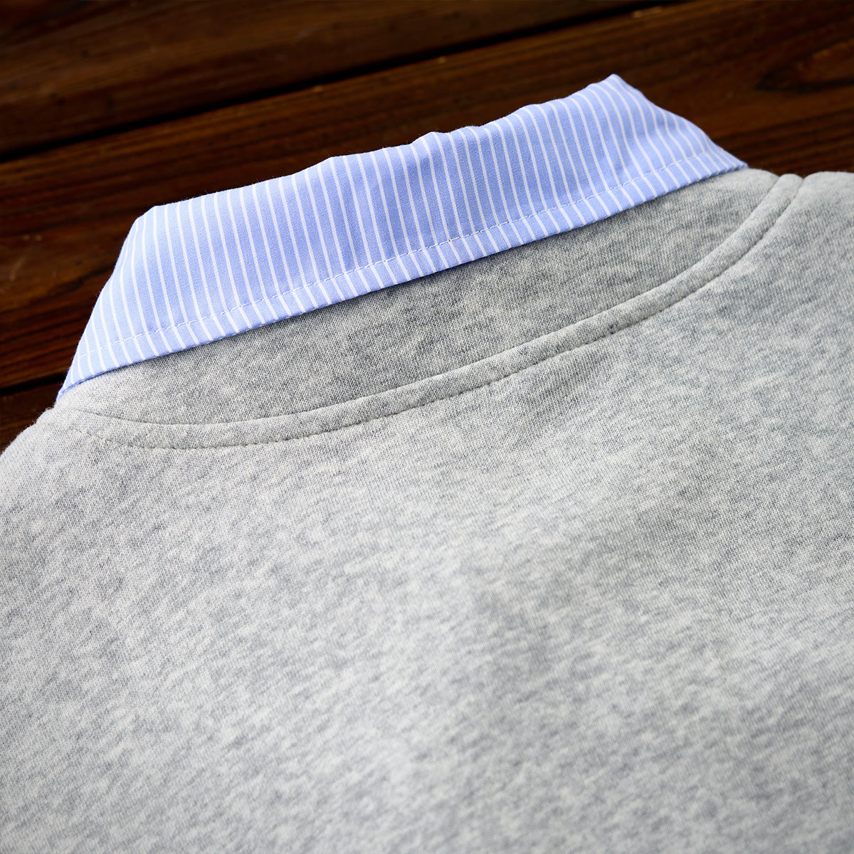 스웨트 부분은 그레이와 블랙의 심플한 컬러로 캐주얼한 무드를 주며, 칼라와 밑단에 스트라이프 셔츠 디테일을 더해 포인트를 준 디자인입니다.