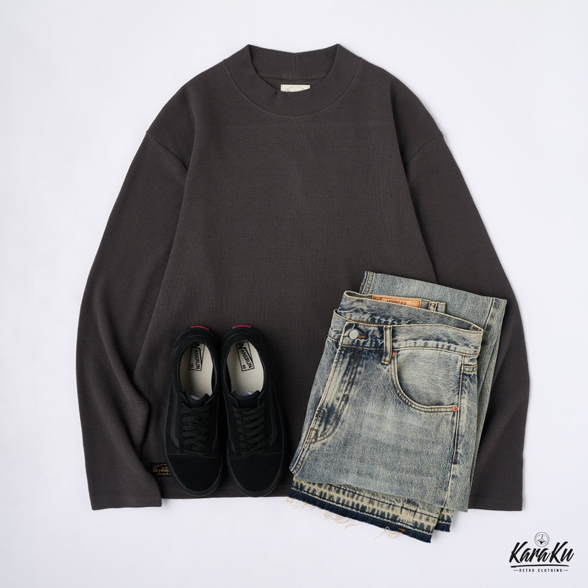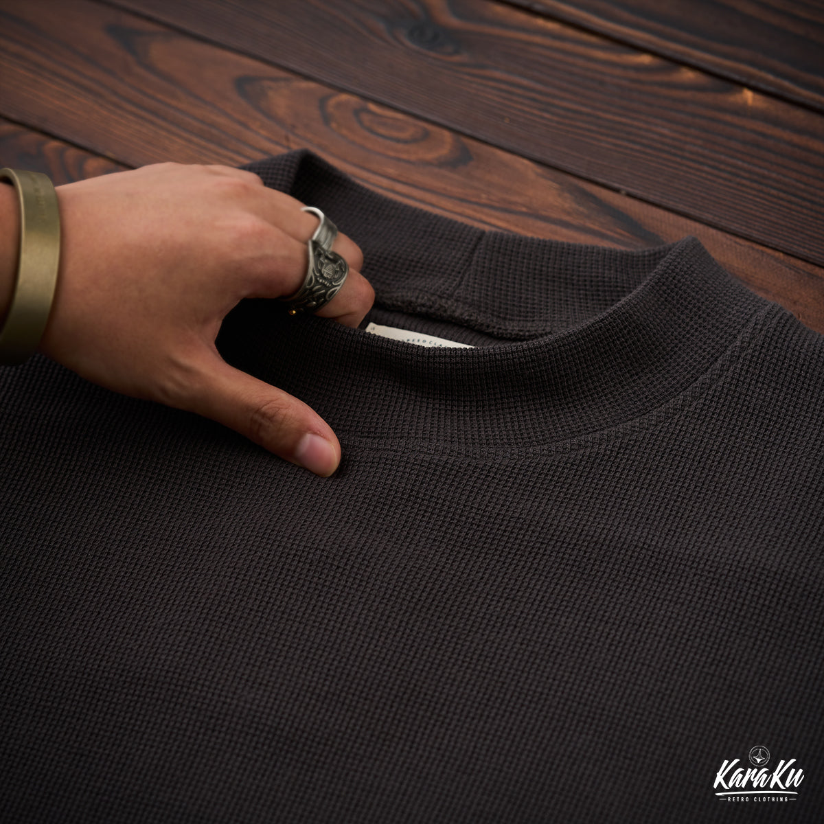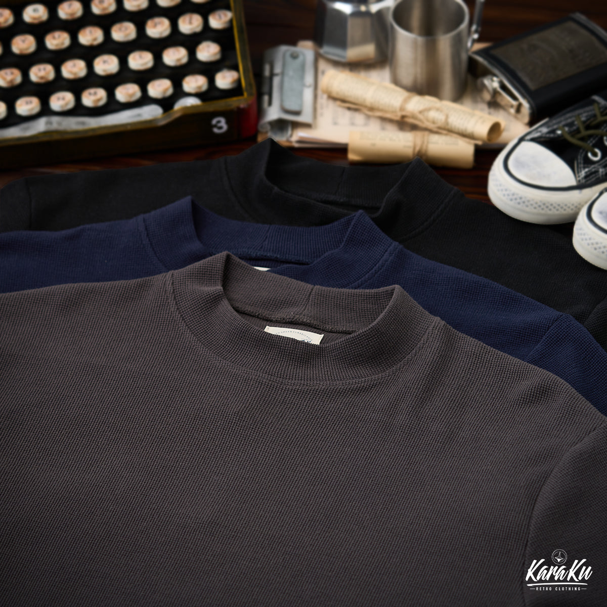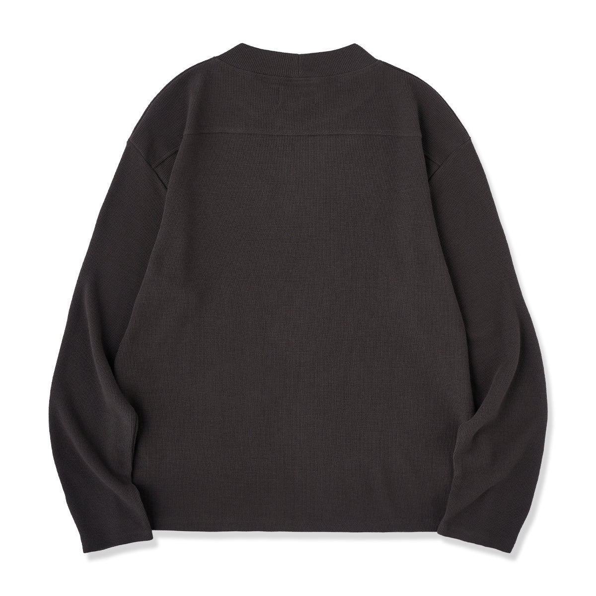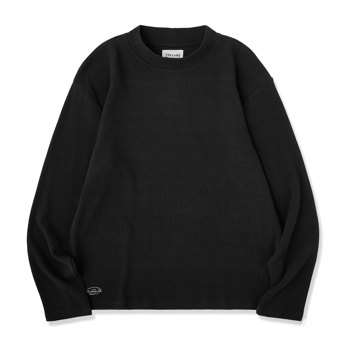 와플 짜임의 반 터틀넥 롱 티셔츠로 여유로운 오버핏과 부드러운 혼합 소재가 특징입니다. 남녀 공용으로 다양한 스타일링에 어울립니다.