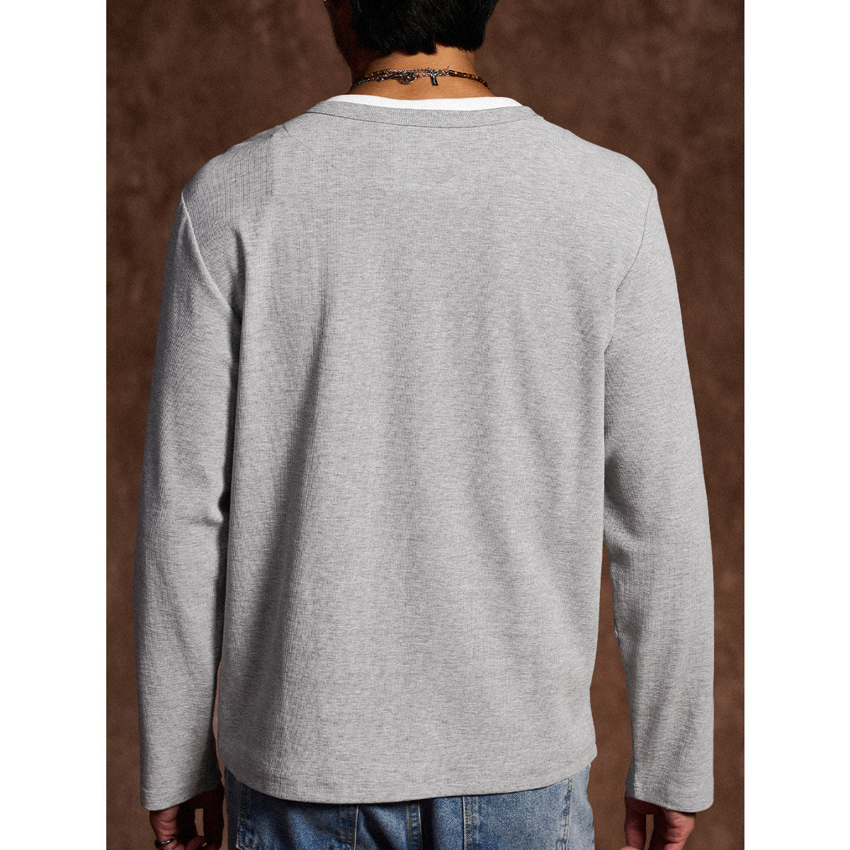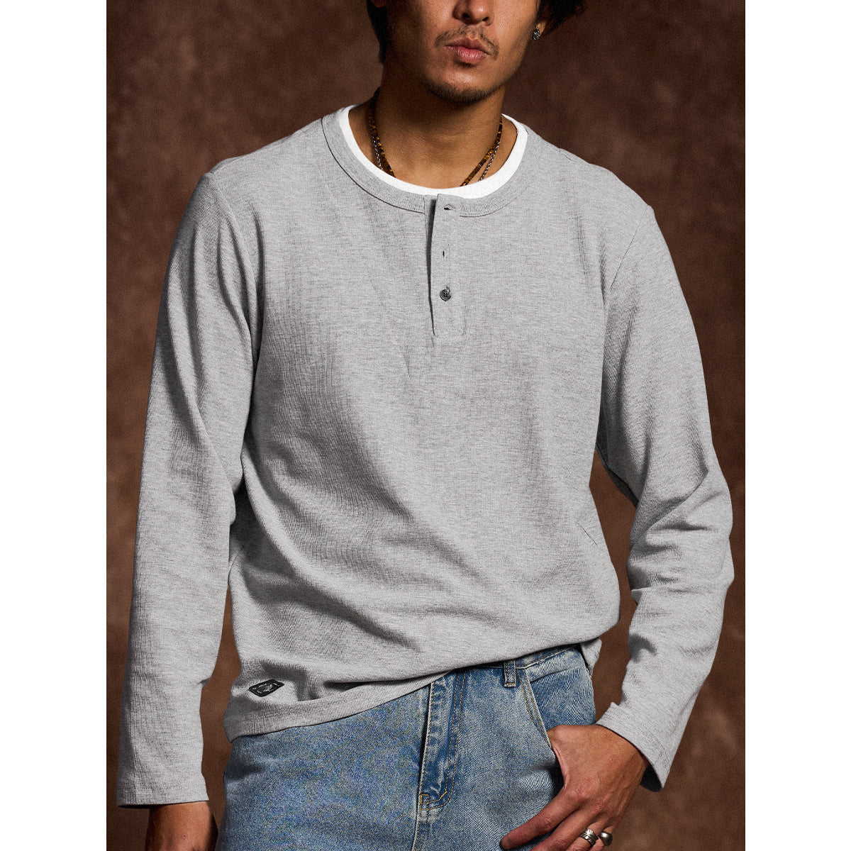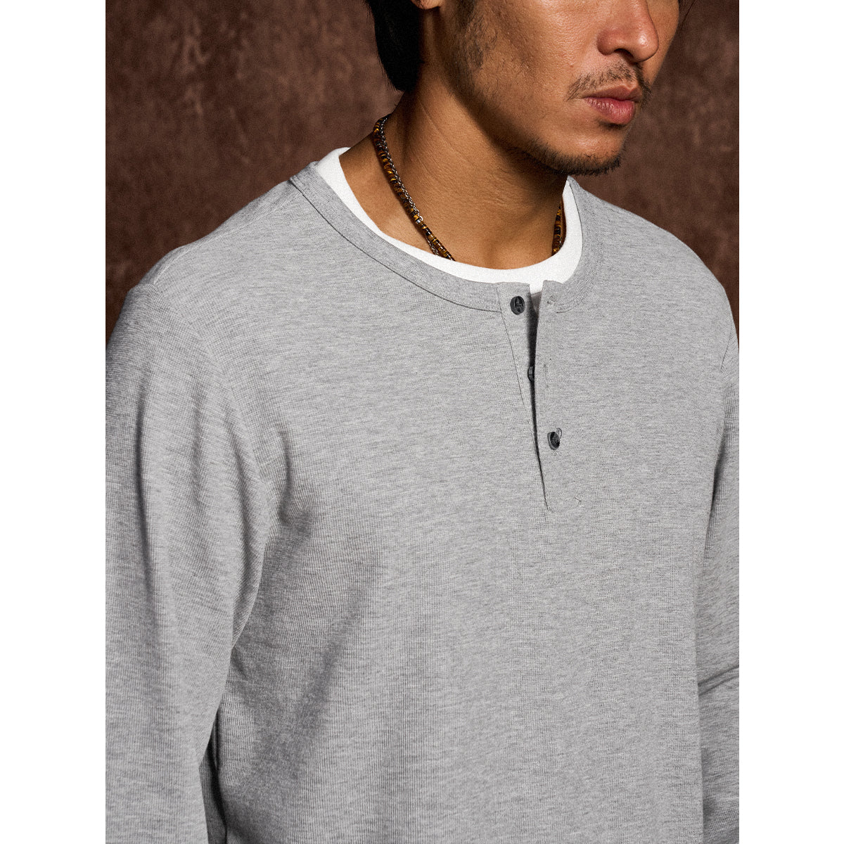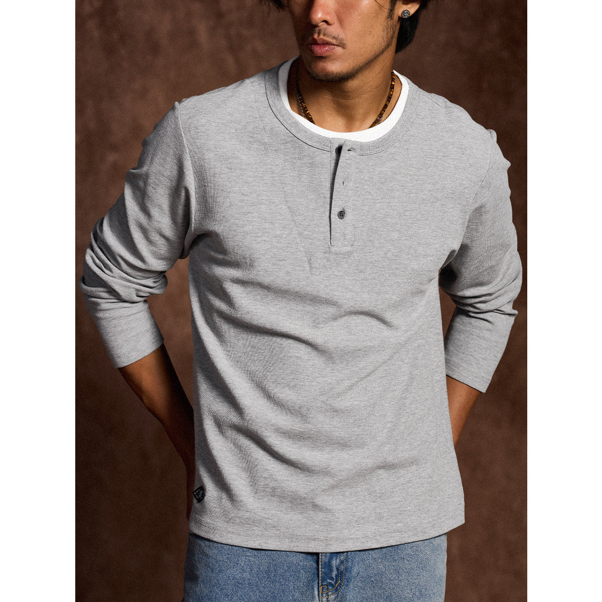 이너 레이어드 느낌의 헨리넥 티셔츠. 3버튼 여밈으로 세련되고 깔끔한 스타일을 완성합니다.